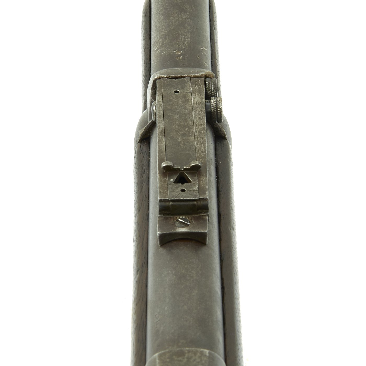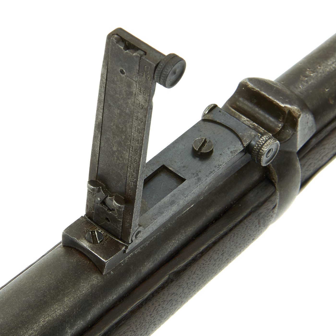 Additional marks of interest include inspectors' and proof marks around the breech end of the barrel, which are somewhat faded: a V over a P over an eagle's head over another P on the left side just above the stock. There is also an A stamped on top of the chamber. The upper right corner of the Buffington sight leaf is marked C to indicate that the sight graduations are for a carbine and not a rifle.