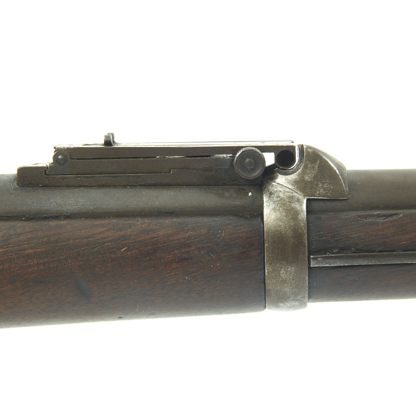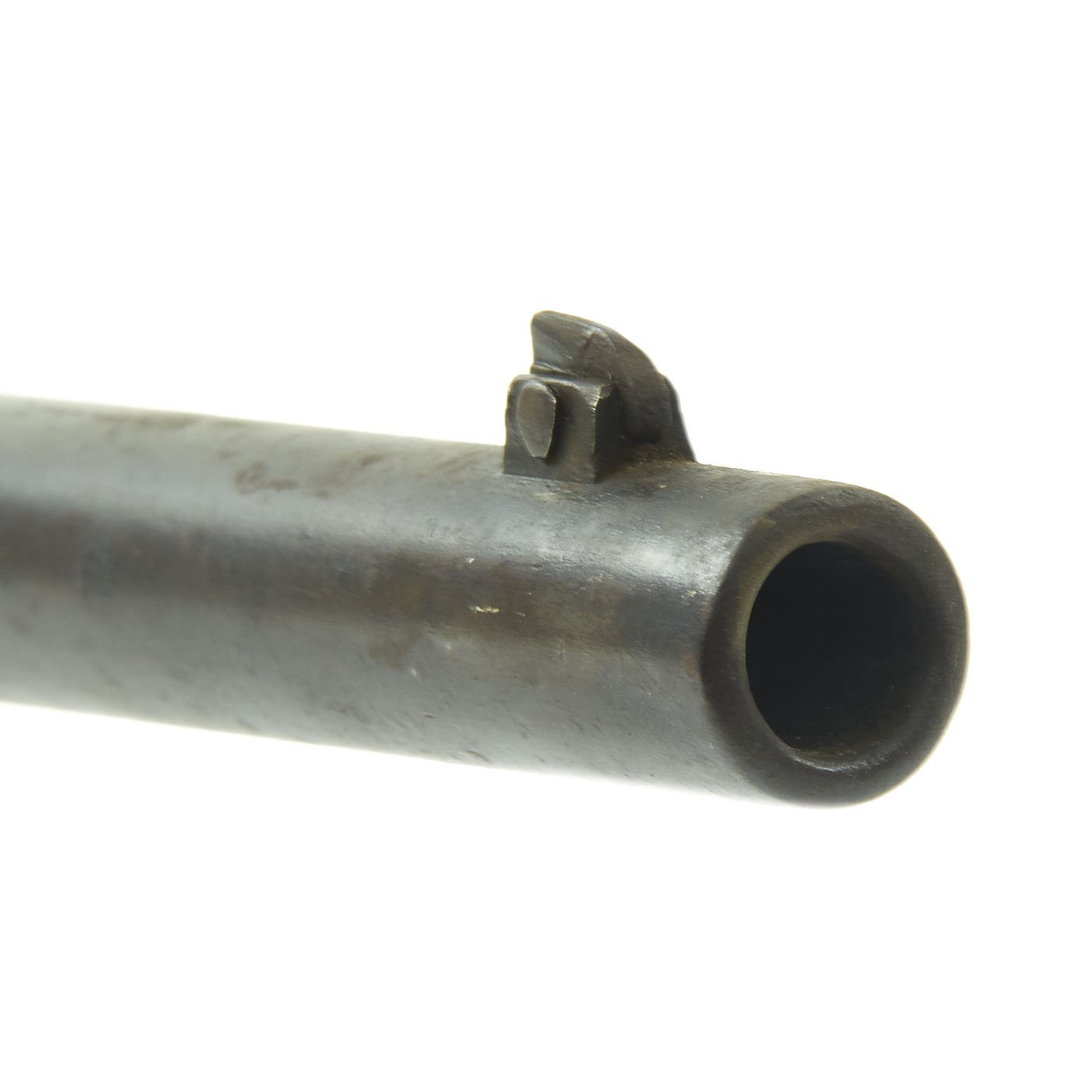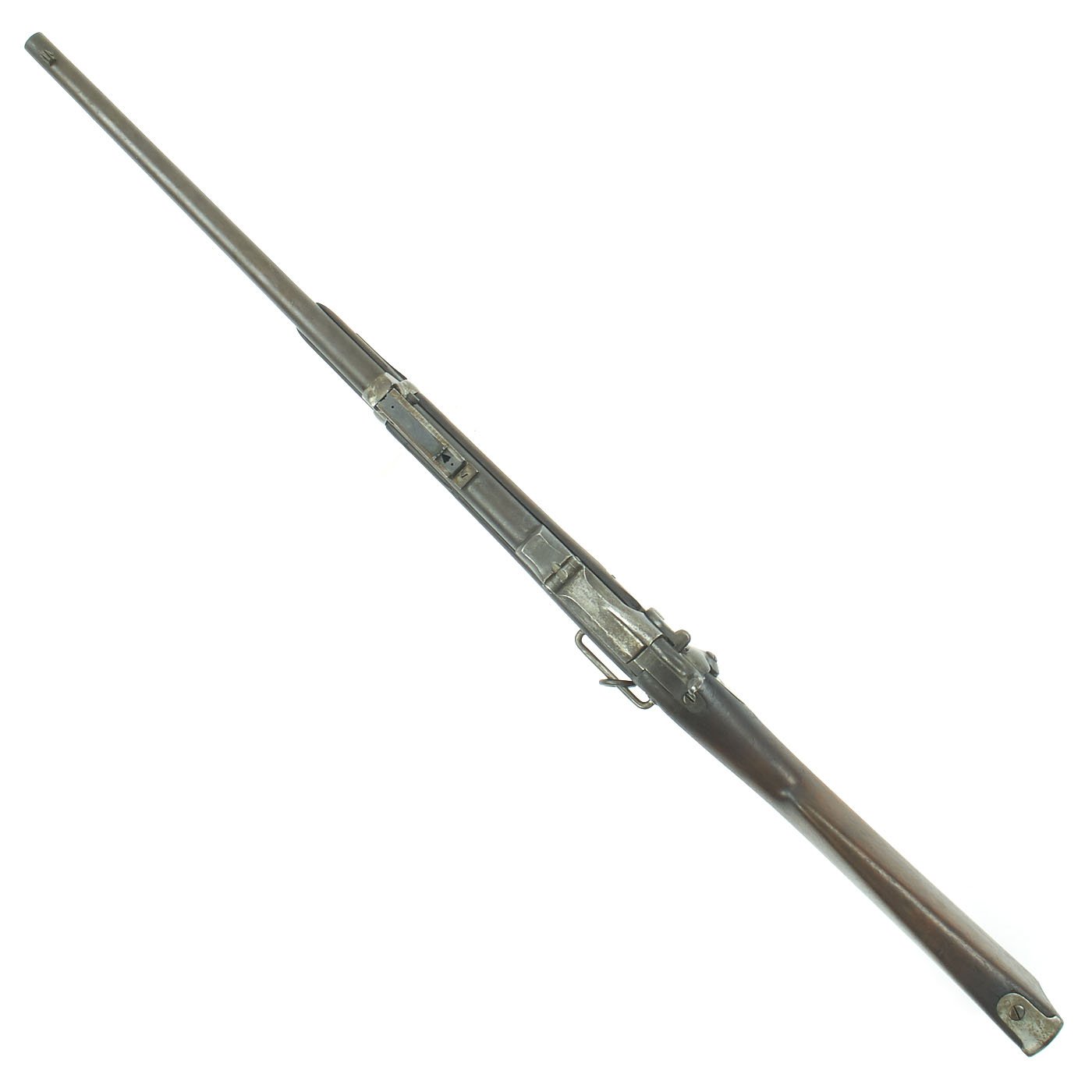 The serial # 450266 indicates production in 1889, and the stock is in good original condition, with the expected wear from age and service. It is at or below the level of the lock plate, so this carbine has definitely been sanded down a bit. This has unfortunately removed all of the stock cartouches. The bore is in good condition, showing clear lands and grooves, and a partly bright finish. There are however some signs of past oxidation and use.