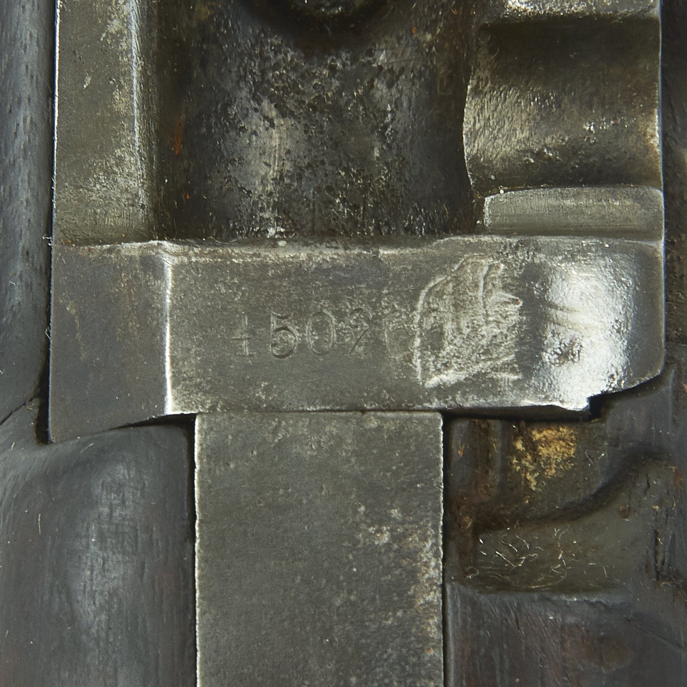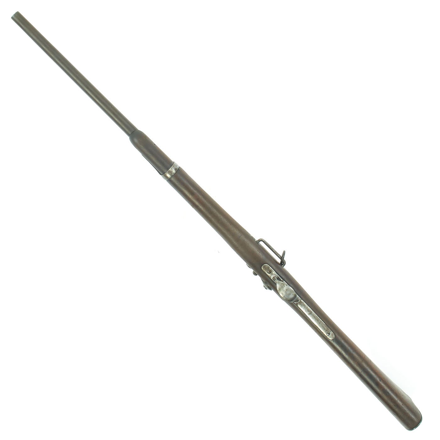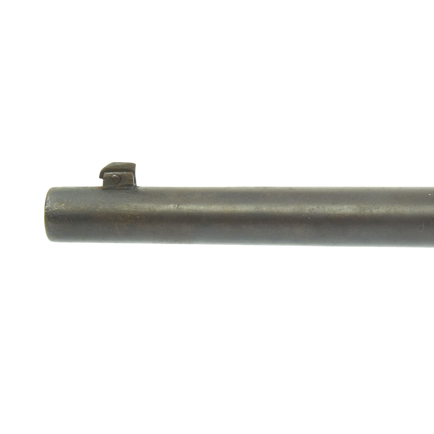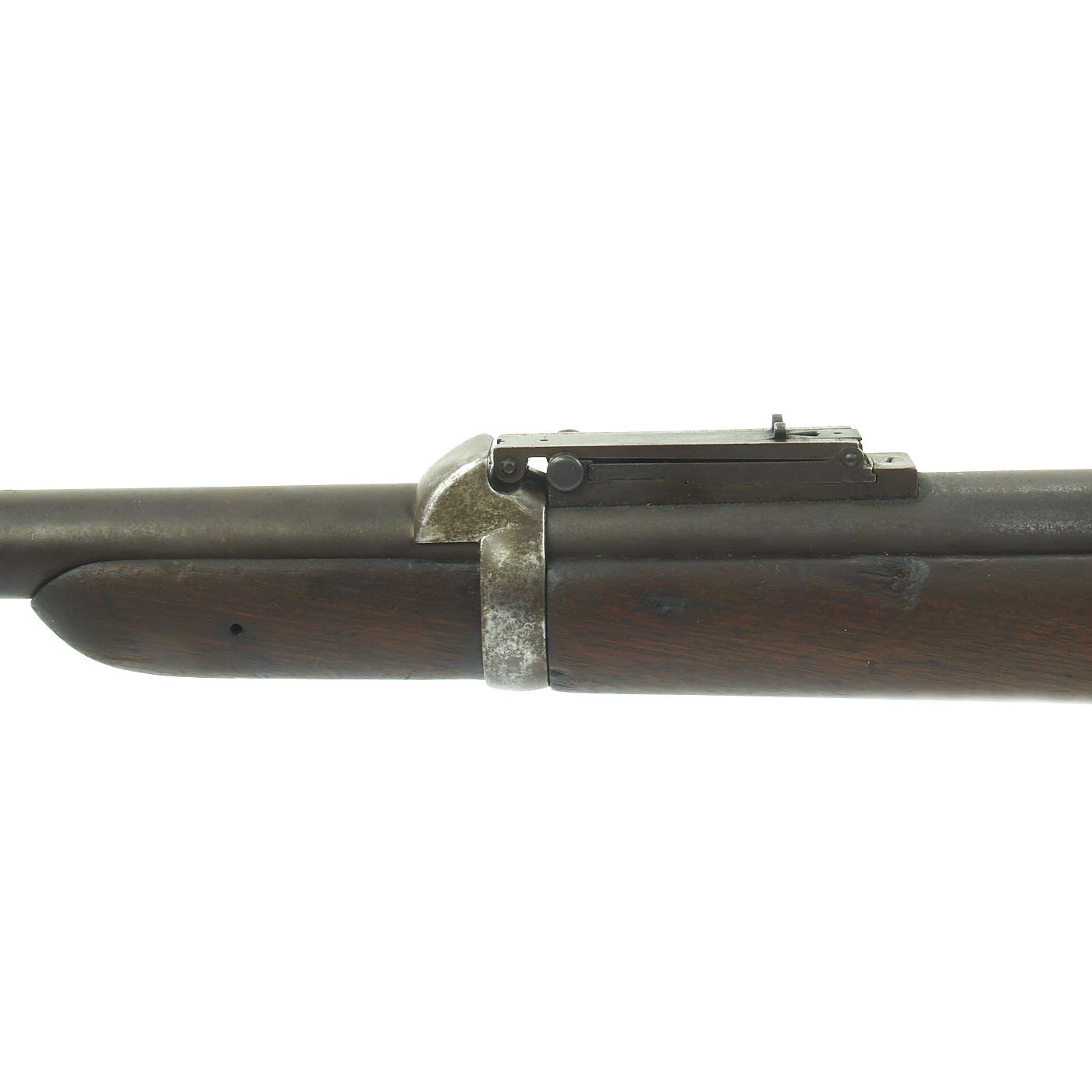The serial # 450266 indicates production in 1889, and the stock is in good original condition, with the expected wear from age and service. It is at or below the level of the lock plate, so this carbine has definitely been sanded down a bit. This has unfortunately removed all of the stock cartouches. The bore is in good condition, showing clear lands and grooves, and a partly bright finish. There are however some signs of past oxidation and use.