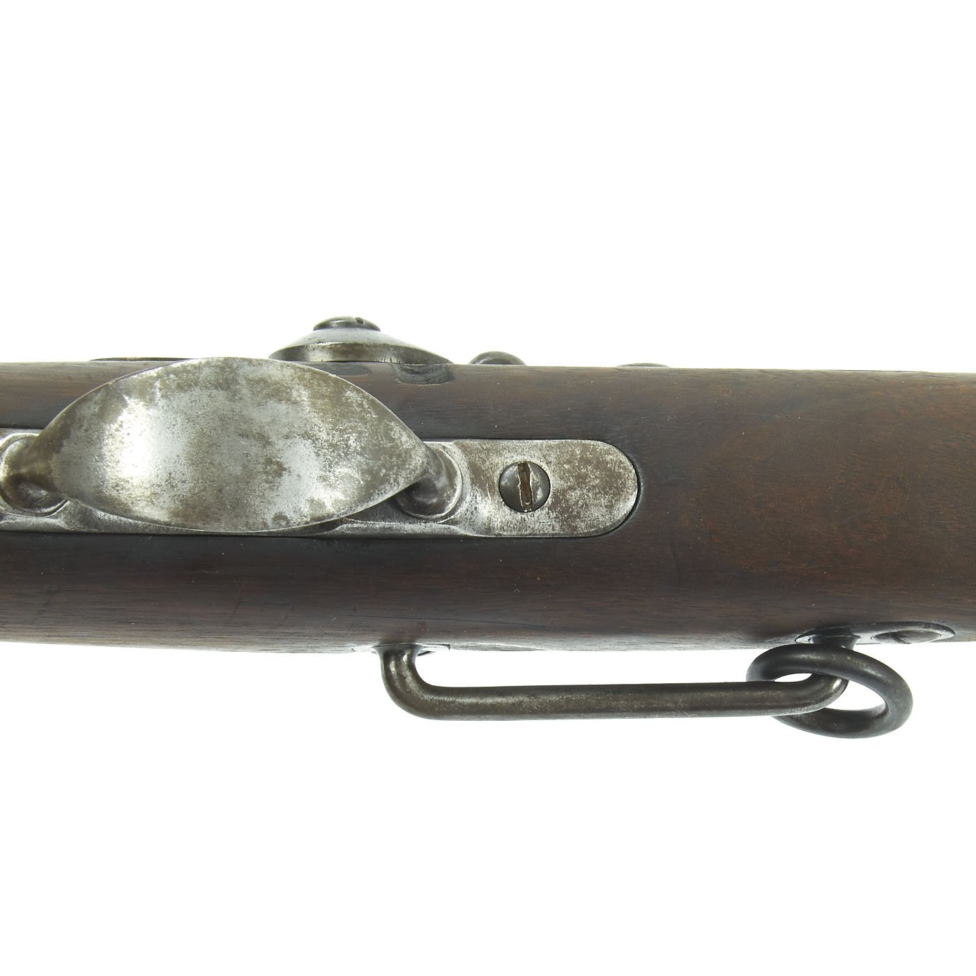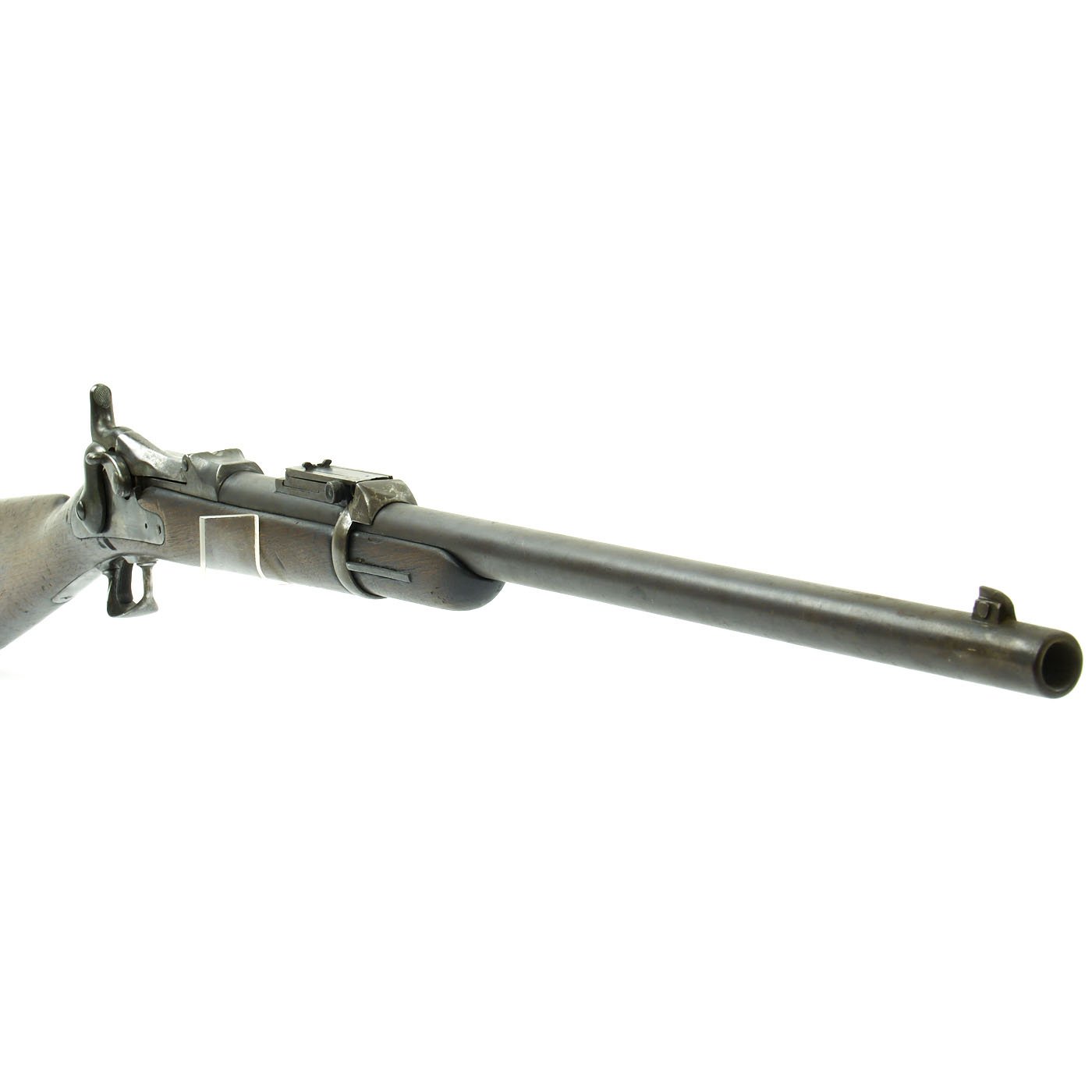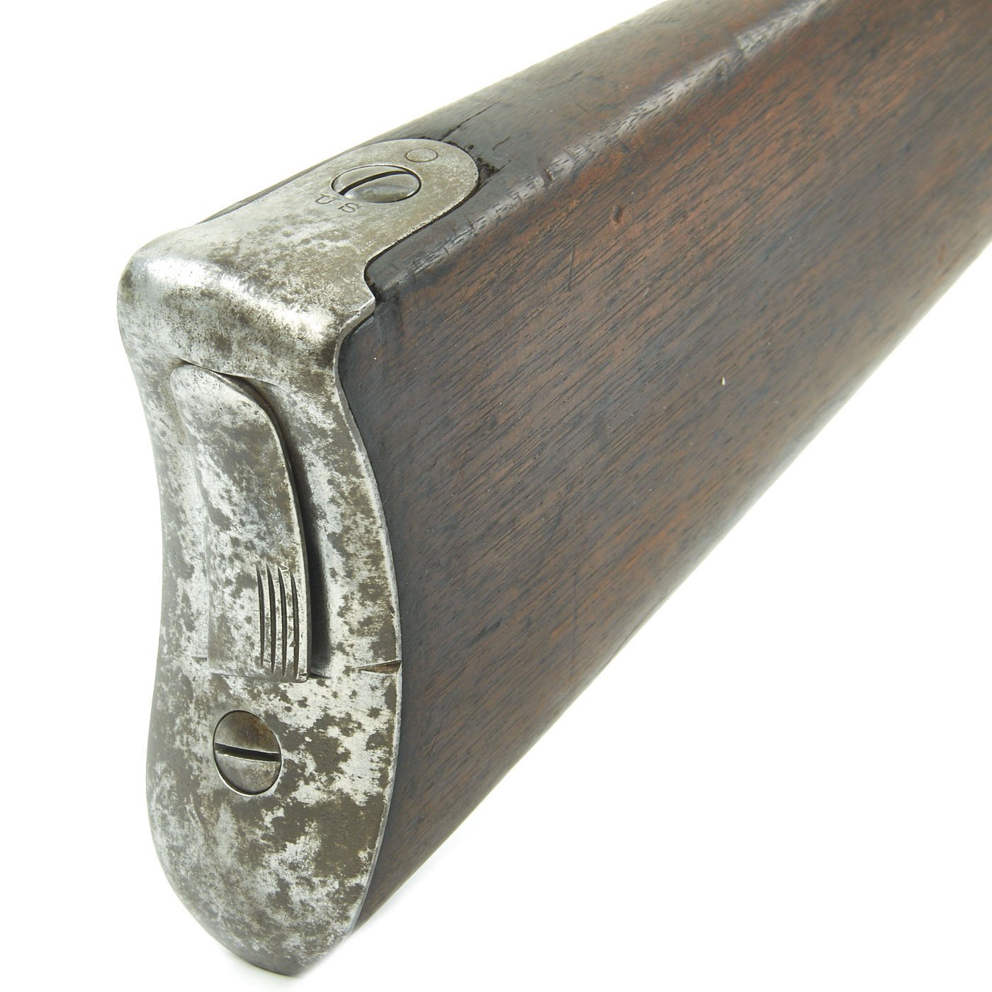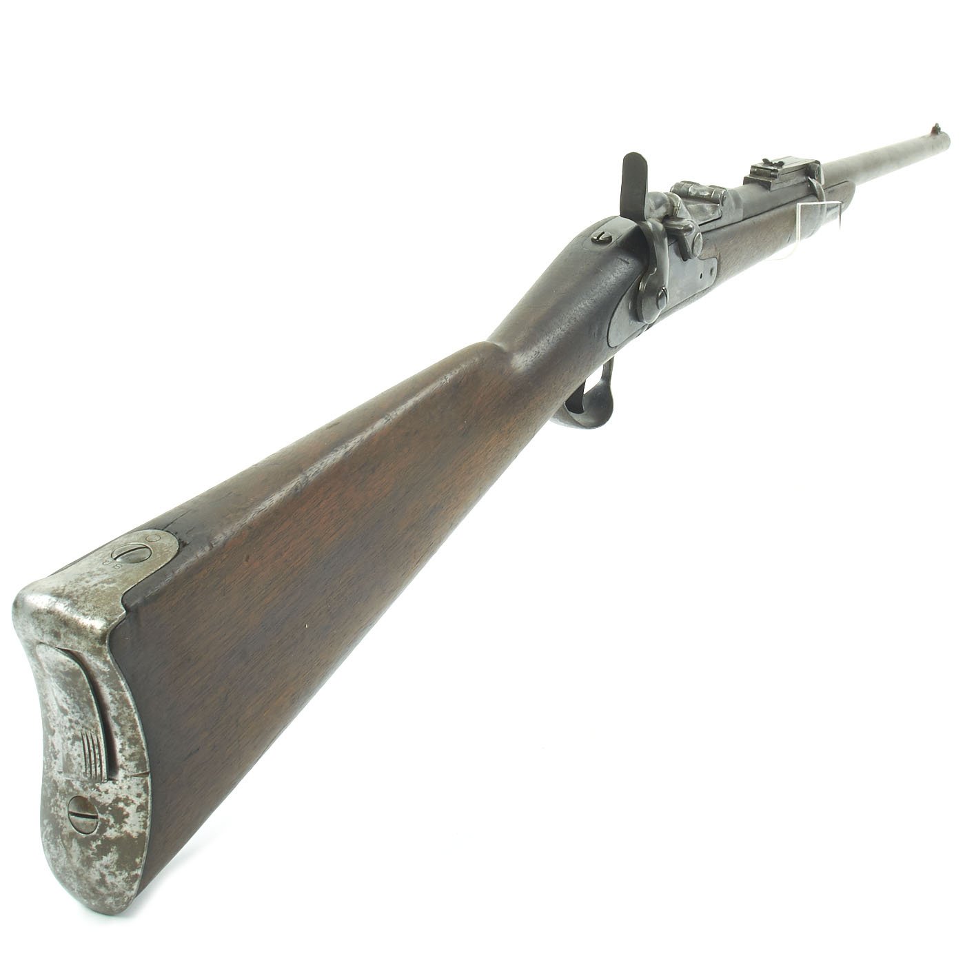 The butt plate is marked U.S. though the front band/guard is unmarked. Metal finish is quite good, with the original blue fading to plum, and some rust speckling. Center fire breechloader, .45 cal., single band, saddle-ring on sliding bar, and carbine Buffington sight. Lock is faintly marked with an eagle and U.S. / SPRINGFIELD, manufactured by Springfield Armory, Springfield Massachusetts.