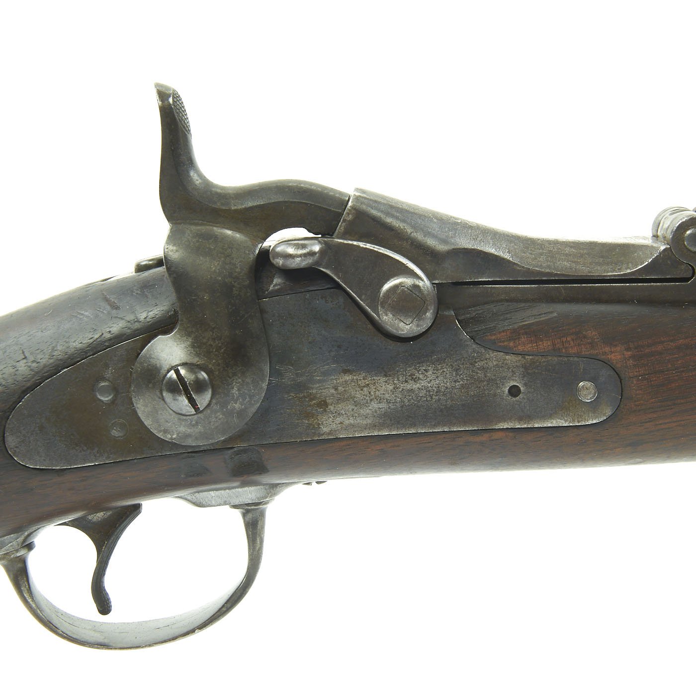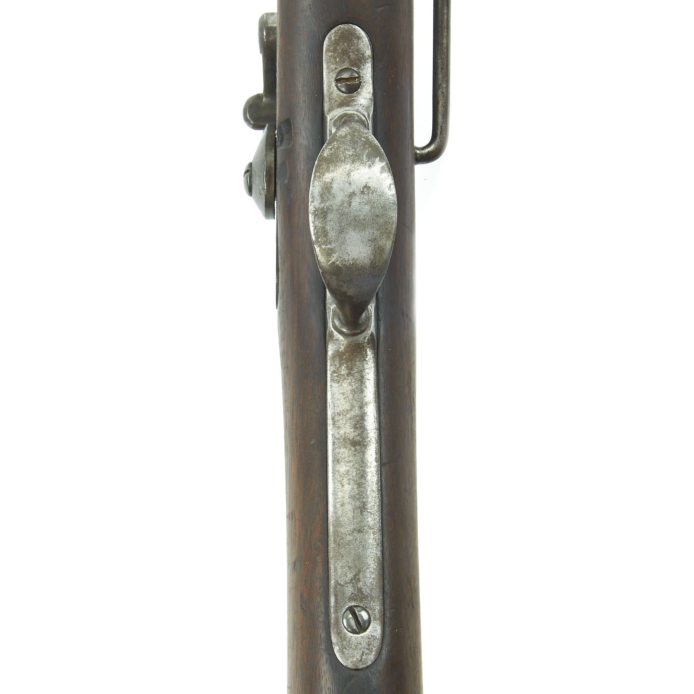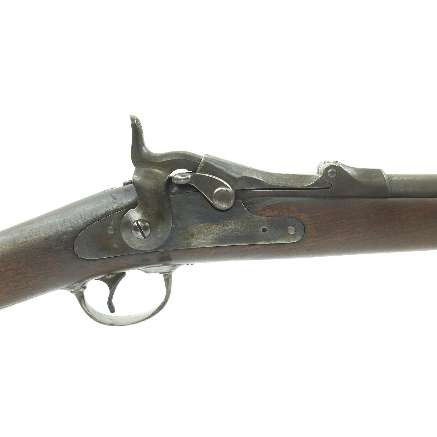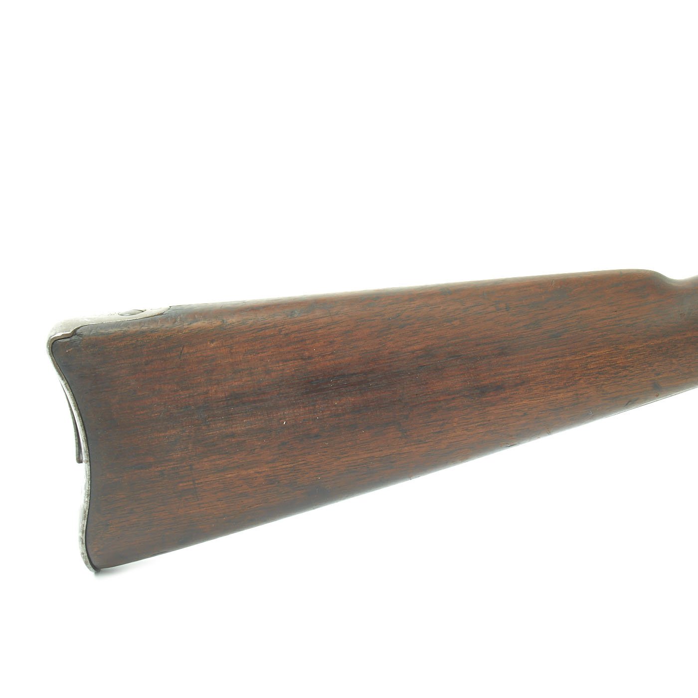 The butt plate is marked U.S. though the front band/guard is unmarked. Metal finish is quite good, with the original blue fading to plum, and some rust speckling. Center fire breechloader, .45 cal., single band, saddle-ring on sliding bar, and carbine Buffington sight. Lock is faintly marked with an eagle and U.S. / SPRINGFIELD, manufactured by Springfield Armory, Springfield Massachusetts.