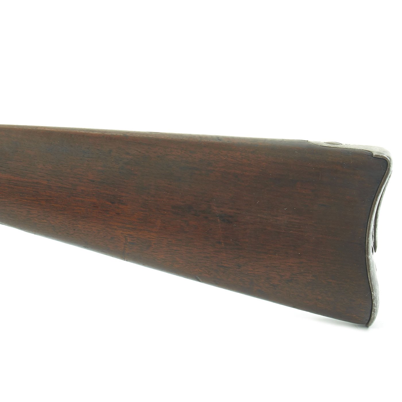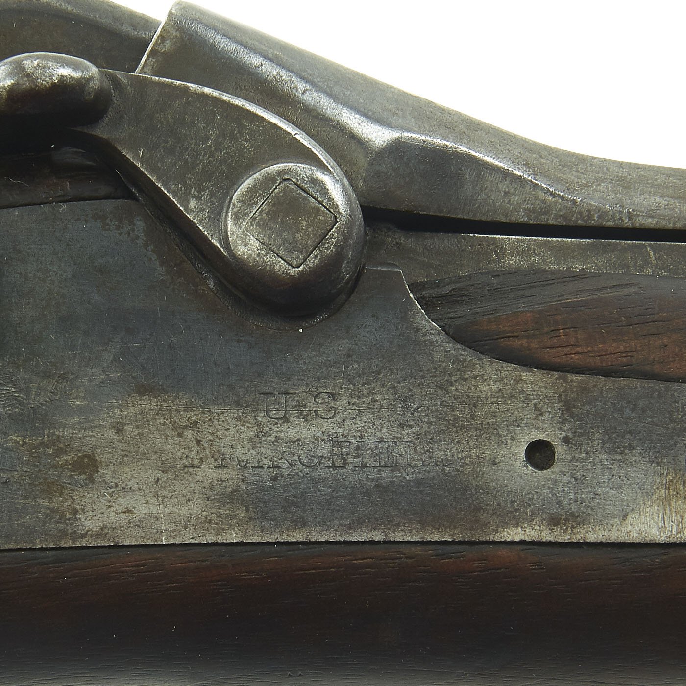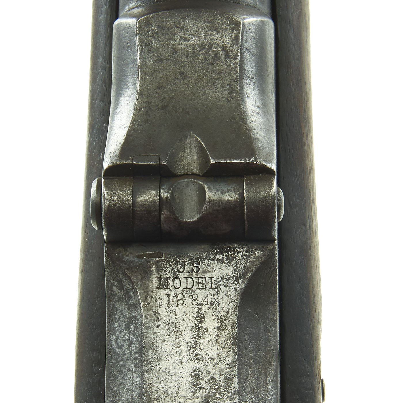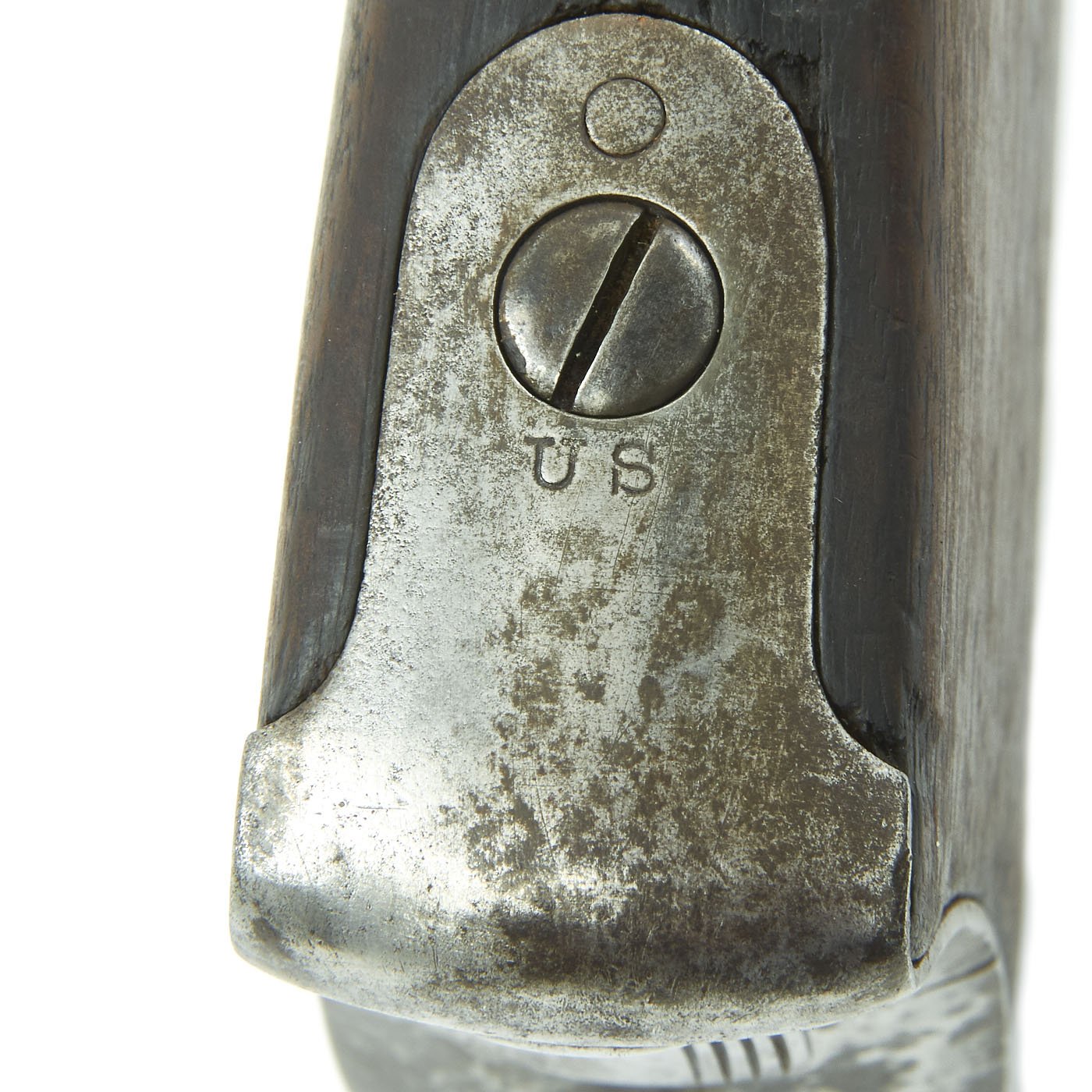 The butt plate is marked U.S. though the front band/guard is unmarked. Metal finish is quite good, with the original blue fading to plum, and some rust speckling. Center fire breechloader, .45 cal., single band, saddle-ring on sliding bar, and carbine Buffington sight. Lock is faintly marked with an eagle and U.S. / SPRINGFIELD, manufactured by Springfield Armory, Springfield Massachusetts.