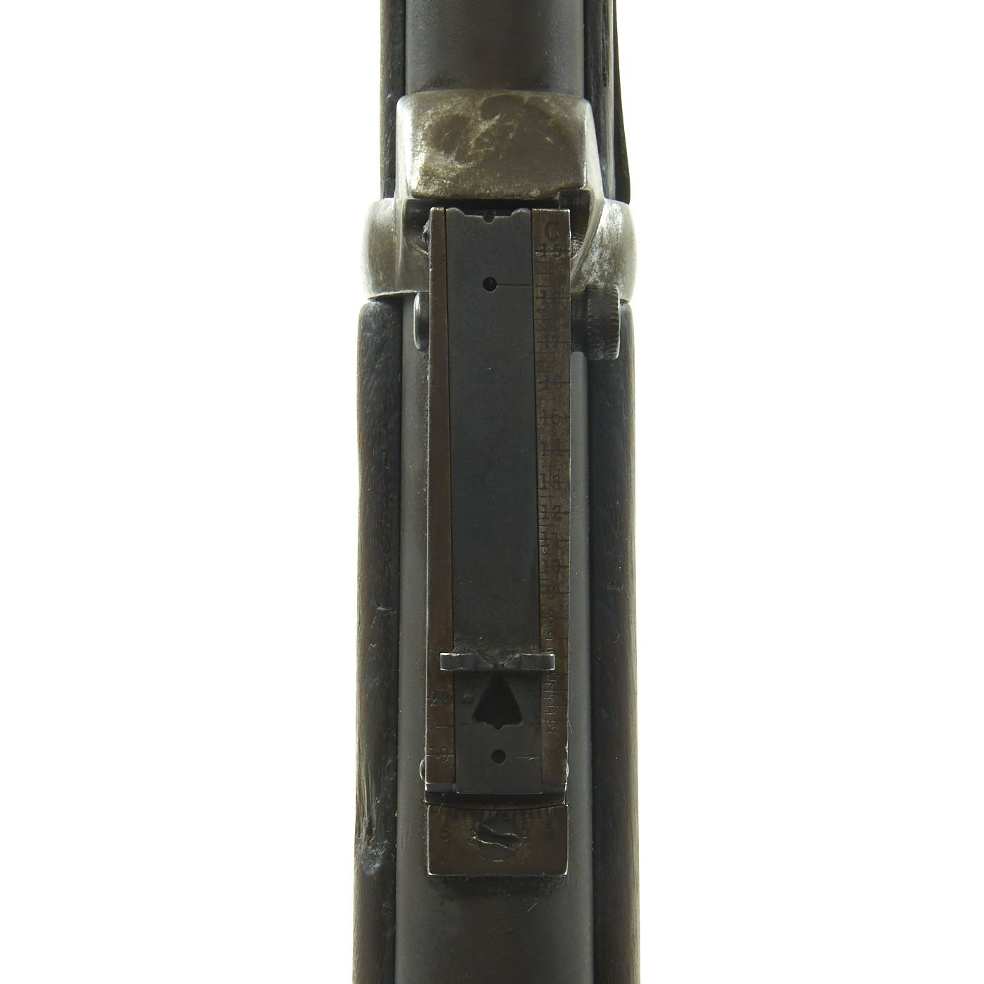 This carbine is fitted with the butt stock storage compartment, where a multi-piece cleaning rod and tools would be stored. Unfortunately these are long gone, and it is empty. The upper right corner of the Buffington sight leaf is marked C to indicate that the sight graduations are for a carbine and not a rifle. The sight's top tension screw has unfortunately broken off, so the slider is loose in the channel.
