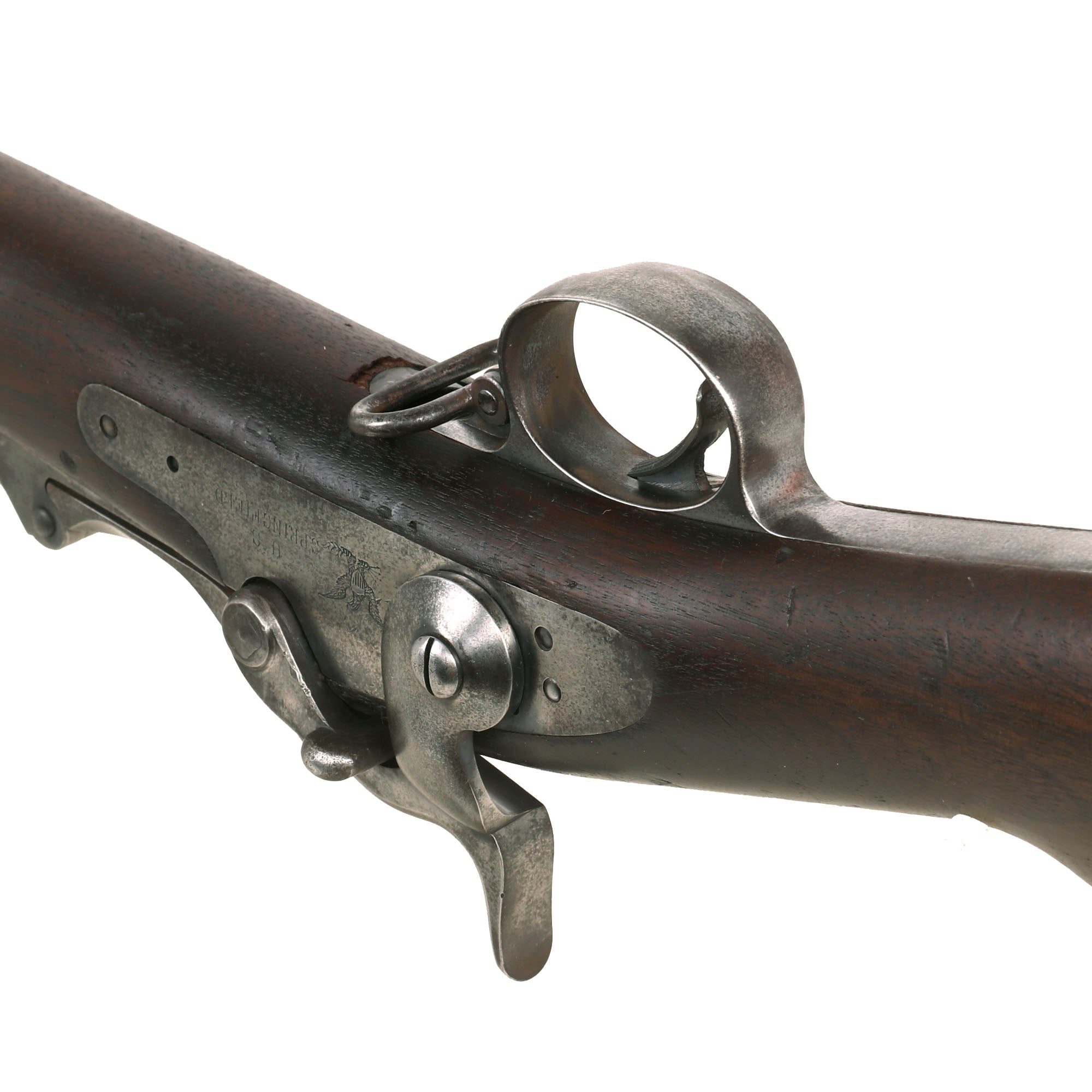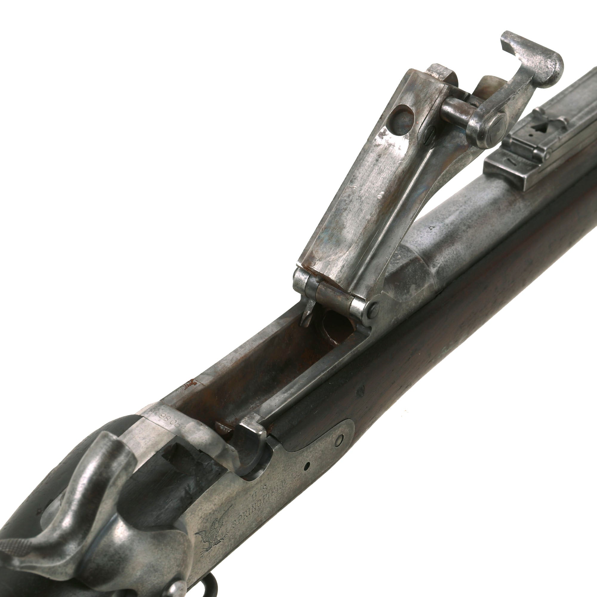 The both barrel bands are U marked, and the butt plate tang is marked with the correct U.S. stamp. Center fire breechloader, .45 cal., two bands, two sling swivels with stacking swivel, Buffington sight, sliding ramrod bayonet. Lock is marked with an eagle and U.S. / SPRINGFIELD, manufactured at the United States Armory and Arsenal at Springfield, in Springfield, Massachusetts. The lock is fully functional, and the Buffington rear sight is complete and fully functional, with both range and windage easily adjustable. The breech block moves correctly, and the extractor is still present and functional, though we have not tested it with real brass. The firing pin is intact and moves freely.