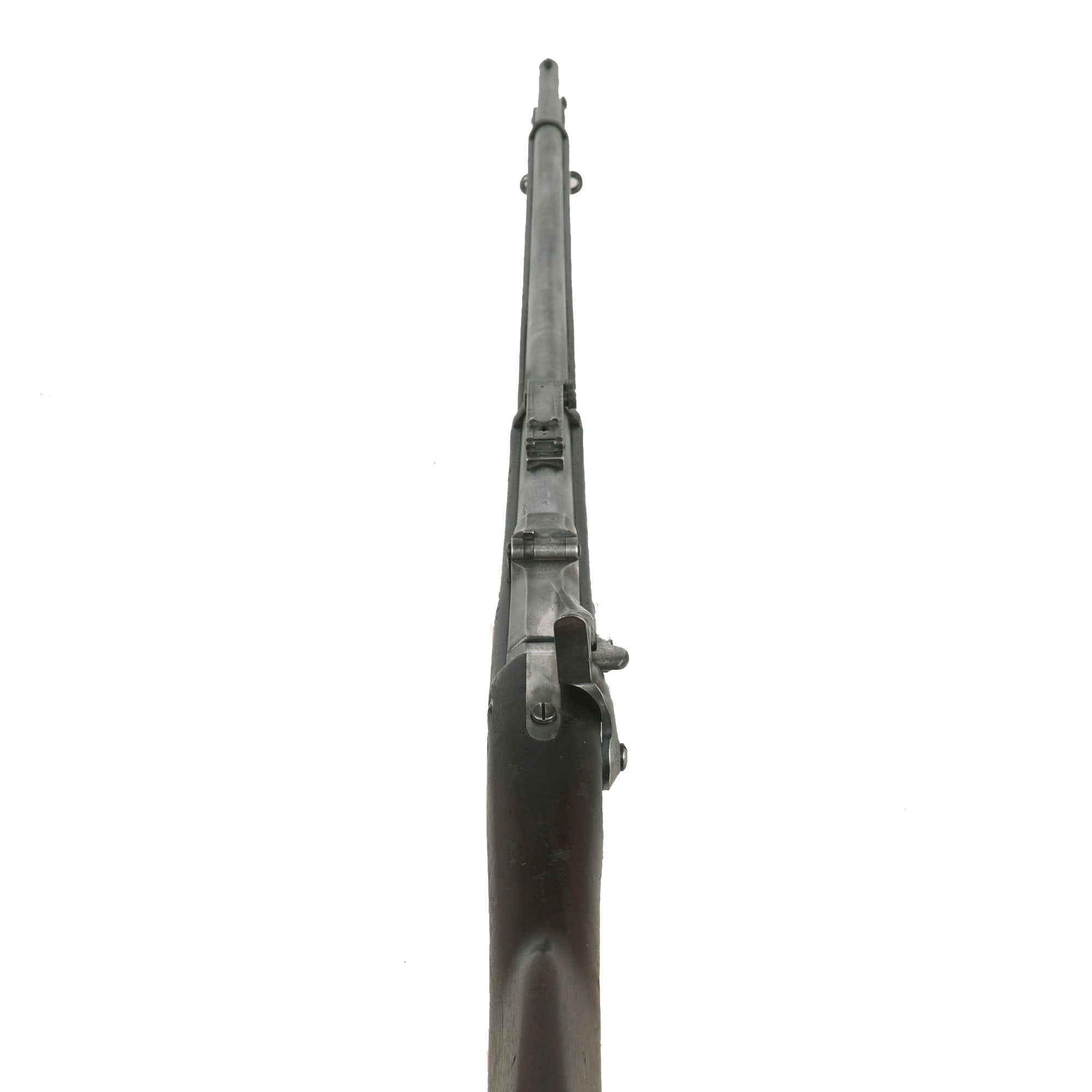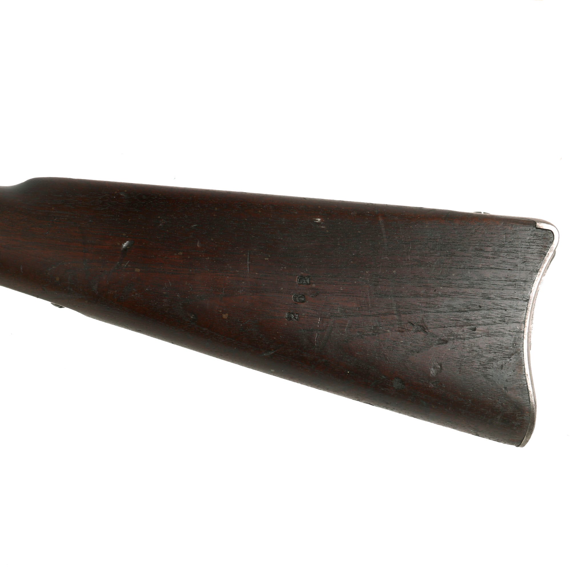 The rifle was stripped down to a barreled receiver, or possibly just the receiver, and has had almost all of the original parts replaced. It was fitted with a Buffington rear adjustable sight, ramrod bayonet, single piece trigger guard, updated breech block, serrated trigger, and all of the other updated components. This technically makes it a model 1888 according to some sources.