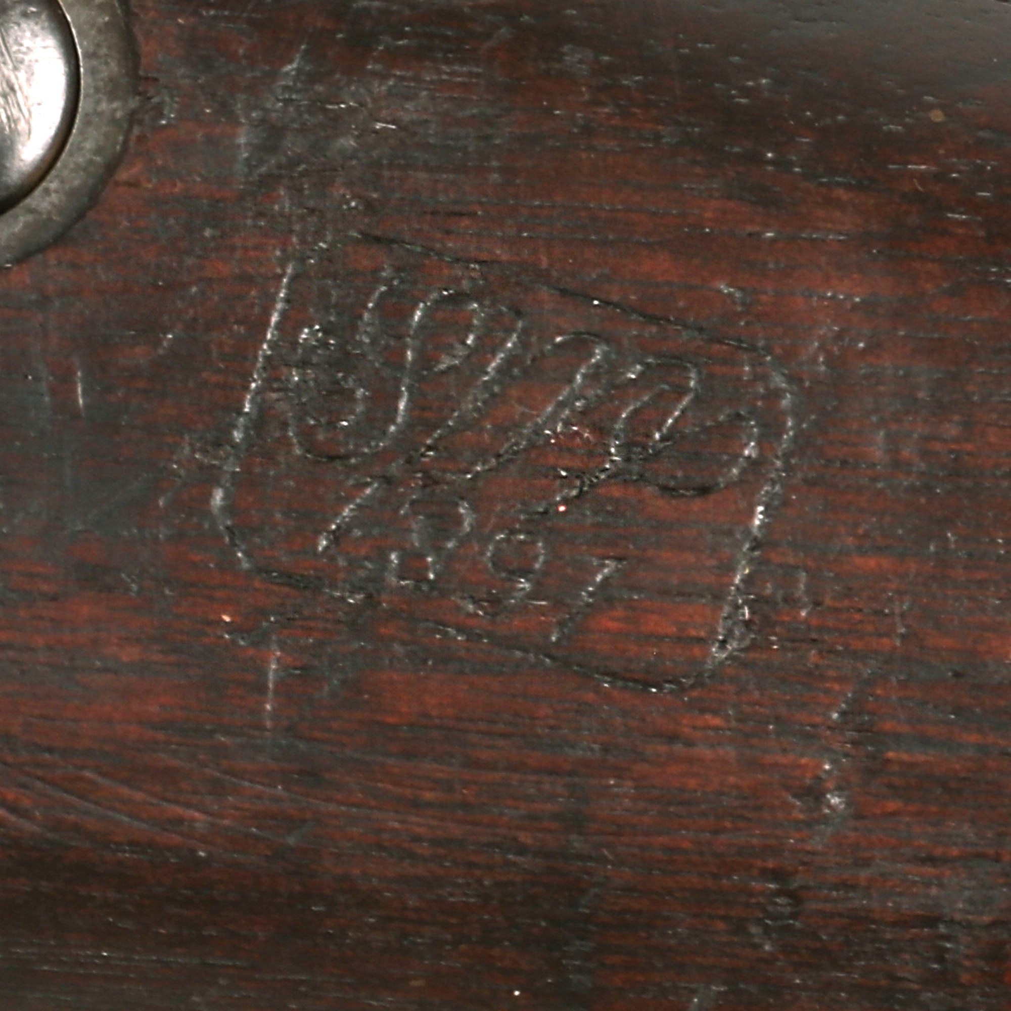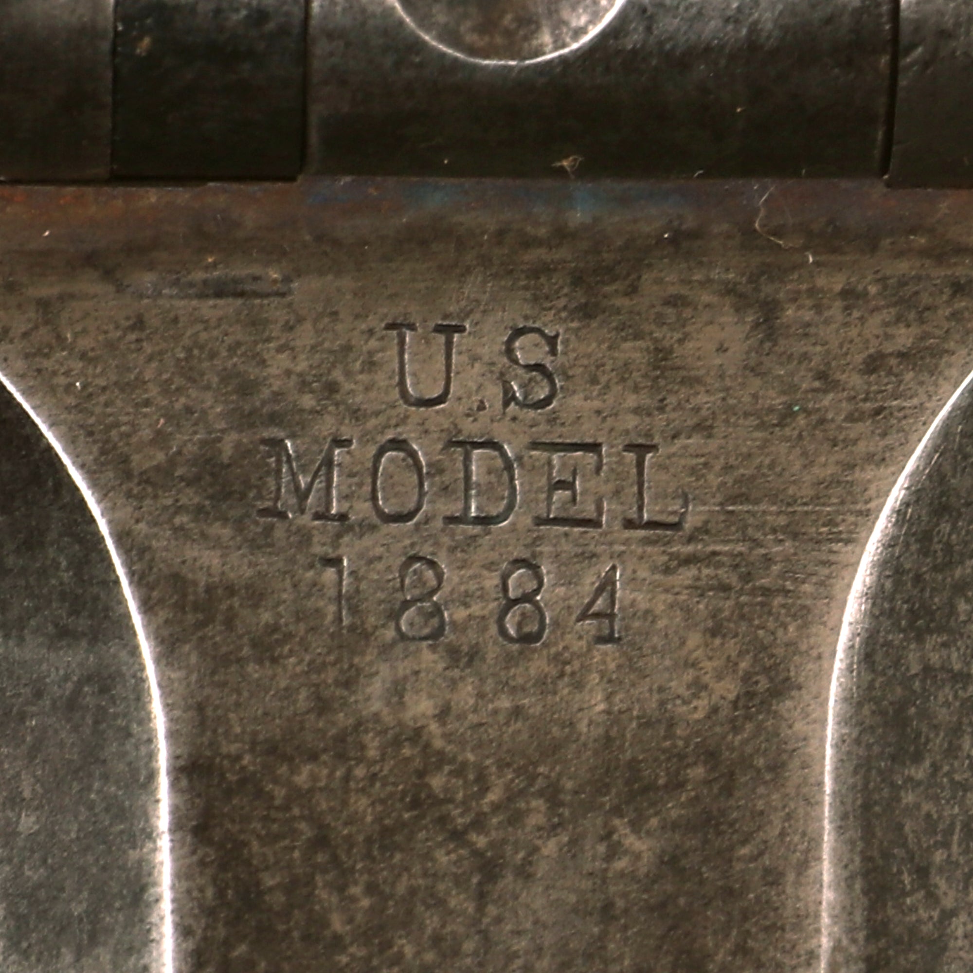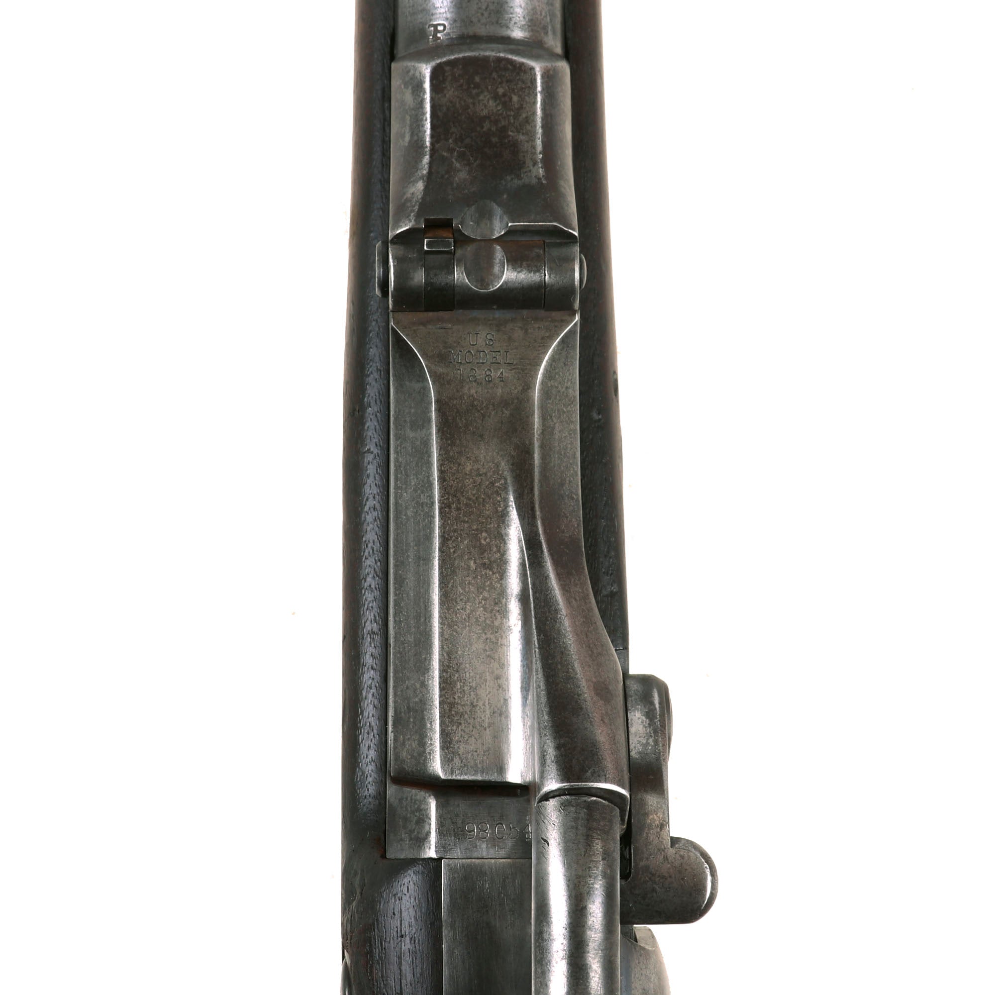 The elegant script SWP belongs to Samuel W. Porter, who was the Master Armorer and Chief Inspector of Springfield Armory from 15 September 1879 to 18 June 1894. A stylized P in a circle under the wrist of the stock indicates that the rifle passed all of its overpressure proof testing. Additional marks of interest include inspectors' and proof marks around the breech end of the barrel: a capital A on top; and a P over an Eagle's head over another P on the left side just above the stock. The upper right corner of the Buffington sight leaf is marked R to indicate that the sight graduations are for a rifle and not a carbine.