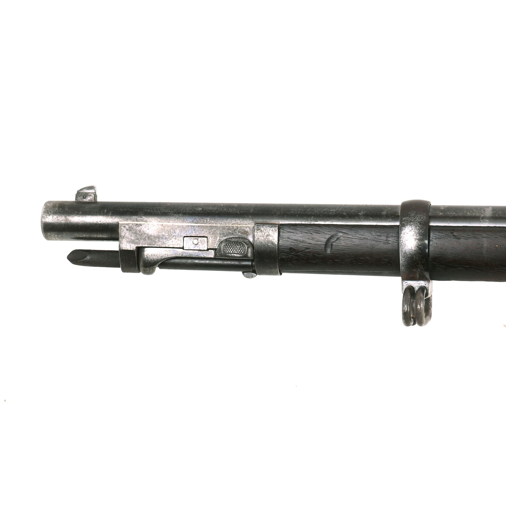 The metalwork on the rifle shows long service and years of cleaning, which has removed the original blued finish for the most part. It now displays a polished steel patina, with some staining and evidence of light past peppering. It's got the look of a rifle that saw long service and was well-cared for over the years. The bore is in good condition, showing clear lands and grooves, but it also does show past fouling and oxidation, especially in the grooves. Most likely the bore was not properly cleaned after the last time it was used, and it definitely does look to have seen a good amount of service. The cleaning rod / bayonet is functional, with a worn finish, and intact threads on the end, and the locking mechanism by the muzzle is fully functional.