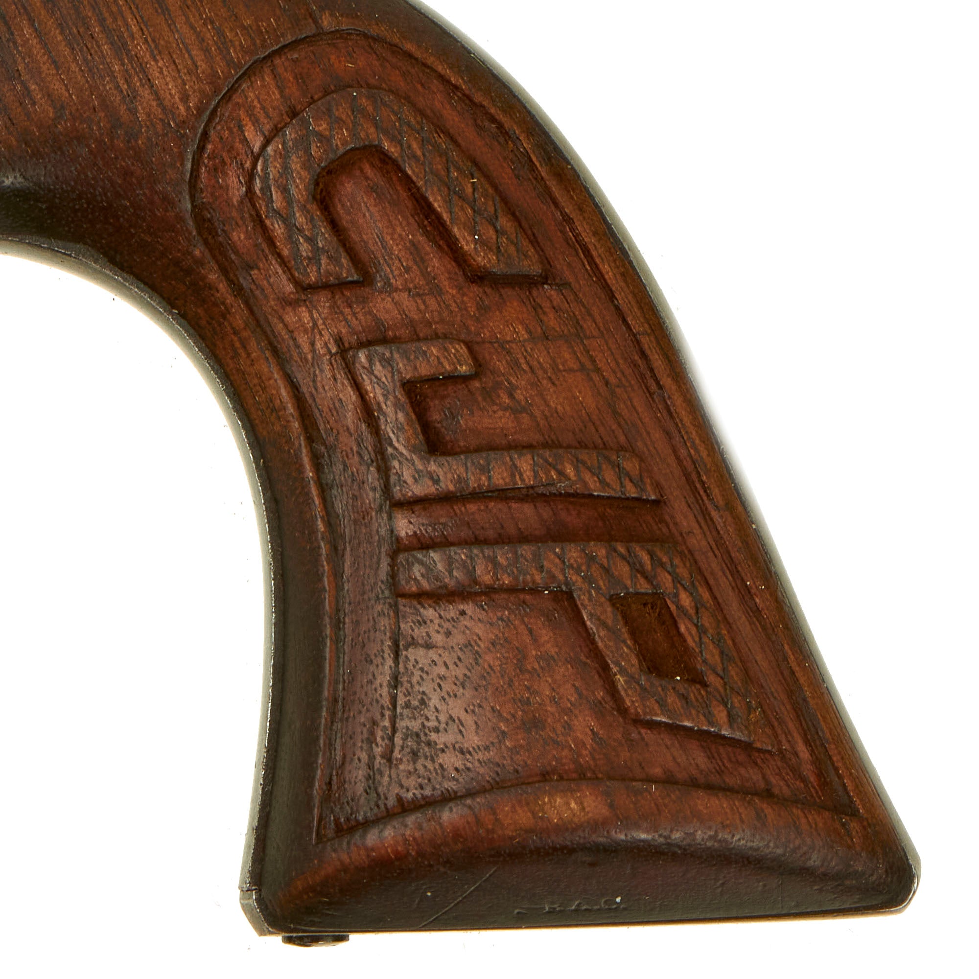 The revolver definitely looks to have seen use after its military service, and may have have been refinished at some point, or simply did not see much use after the original arsenal refit. The condition of the barrel and cylinder definitely suggest very light use after the rebuilt. The walnut grips have a lovely brown color, with no cracks or major damage, however they were custom carved at some point, with the initials CJP being added on the left side, and a checkered panel on the right. It's very possible that this was done by the person it was issued to, though there is no way to be sure.