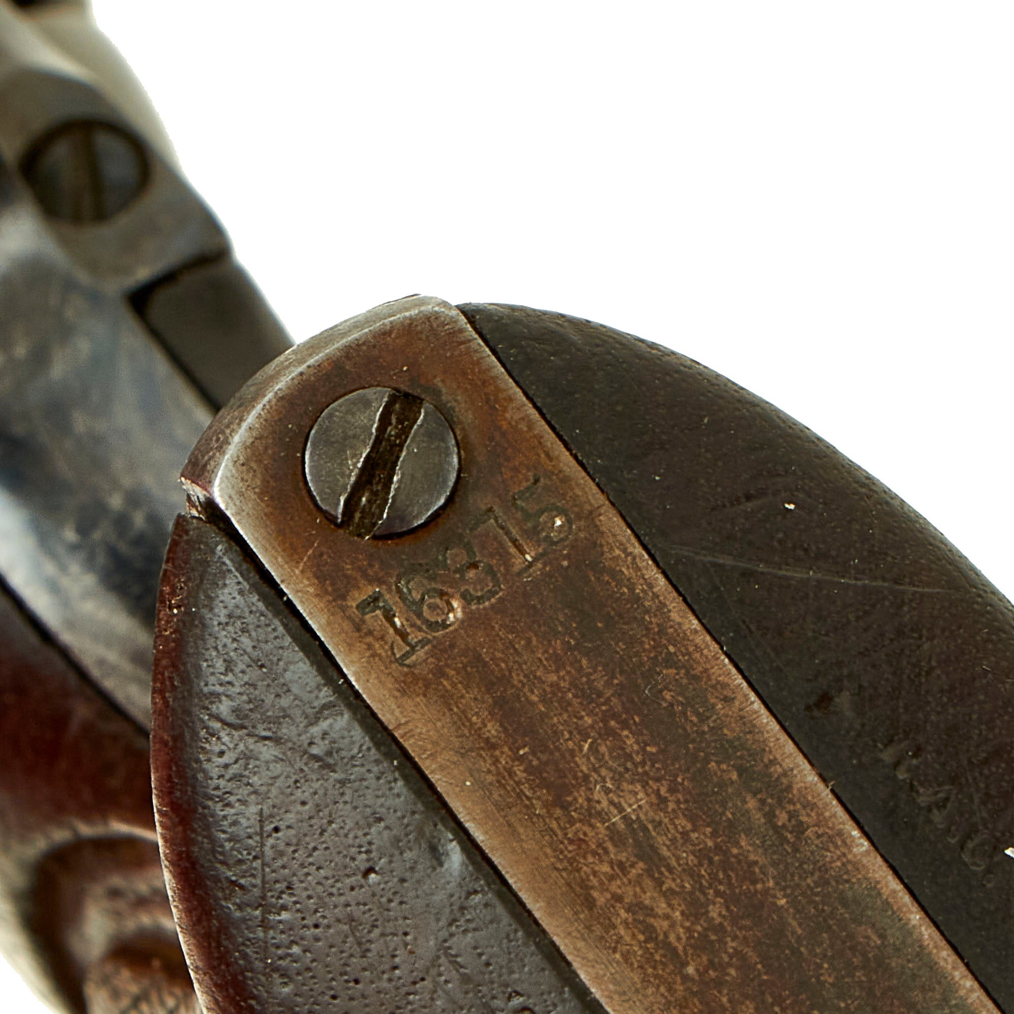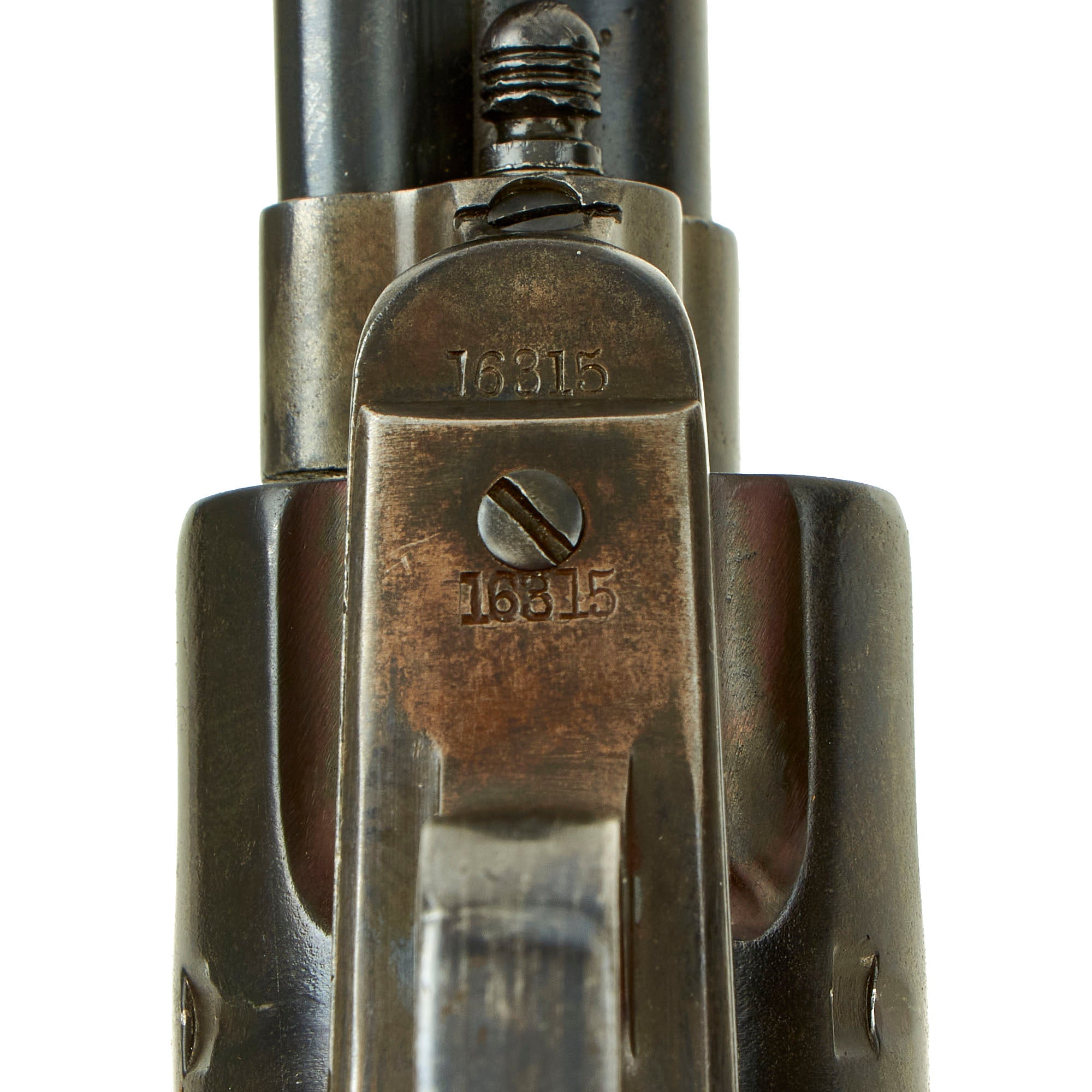 The revolver is marked with serial number 16315, which dates production to 1875, very early during the service life of the Single Action Army. This same number is stamped on the trigger guard and grip frame, somewhat rare to see on these artillery reworked models. The cylinder is not serial number marked, and the barrel is marked 5070 under the ejector, so it is definitely a non-matching arsenal replacement. There is also assembly number 5423 marked on the loading gate. It is in full working order and condition, with a great lightly worn look and carved grips, sure to delight any Americana collector with an interest in the Spanish-American War.