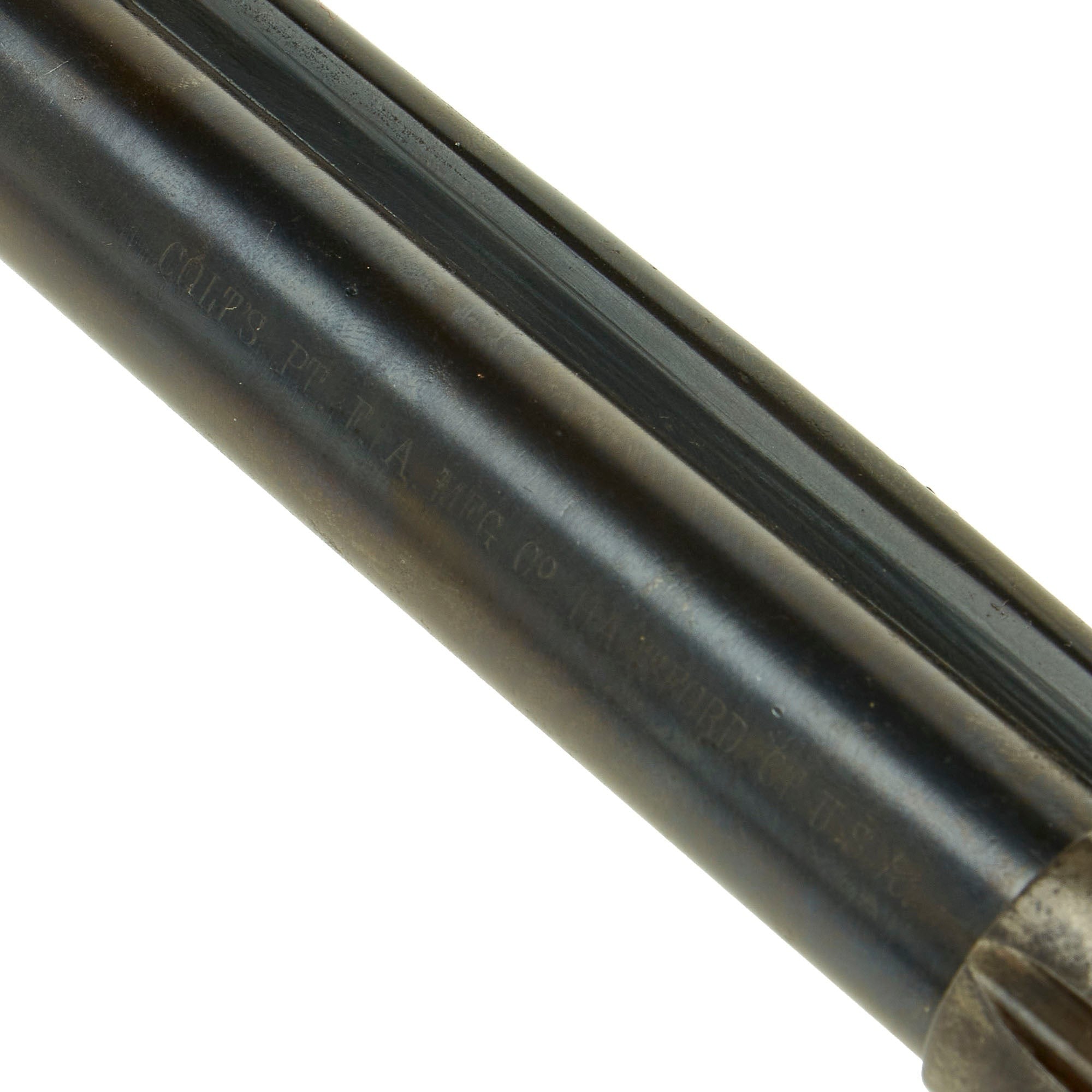 These are the first pattern markings with only two lines, and this was made before the "Prancing Pony" logo began appearing on the frame. Next to them is a large U.S. surcharge, indicating U.S. Army acceptance. The initials D.F.C. next to a P proof mark are stamped on the bottom of the barrel, for ordnance sub-inspector David F. Clark, who inspected a total of 13,000 Single Action Army revolvers from 8 government different contracts during his 8-year tenure at Colt from 1880 to 1887.