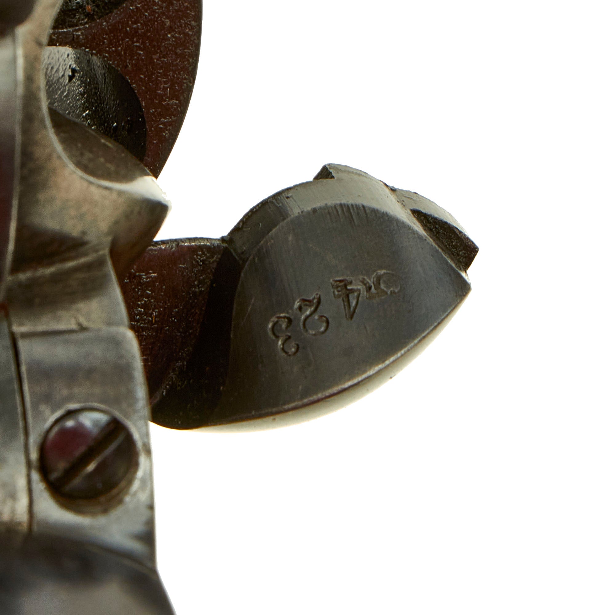 The wooden grip is stamped with R.A.C. on the bottom of both sides, for Rinaldo A. Carr, a civilian employee of the War Department who was the sub-inspector on the Double Action Army revolvers, which were being made at the same time that the "Artillery Models" were being refit. This marking is absolutely PERIOD CORRECT for the history of this revolver. There is no caliber marking on the trigger guard, however we have checked the cylinder and barrel with real cartridges to confirm. This revolver is definitely chambered for .45 Colt, also known as .45 "LONG" Colt, one of the most legendary handgun cartridges of the old west. When you hear people talk of a "Colt 45", this model gun is the reason why.