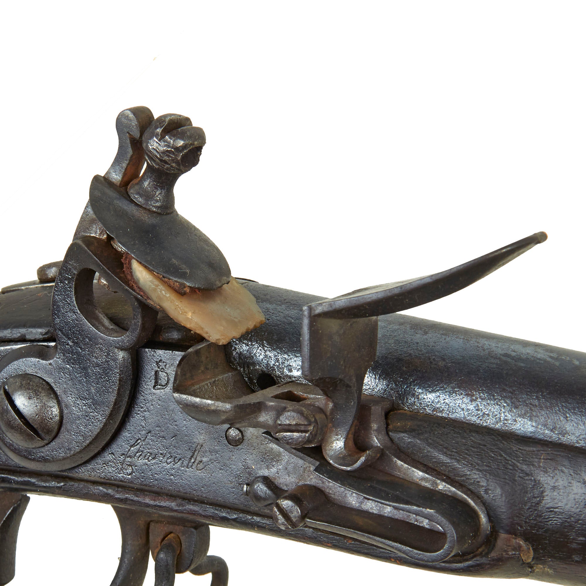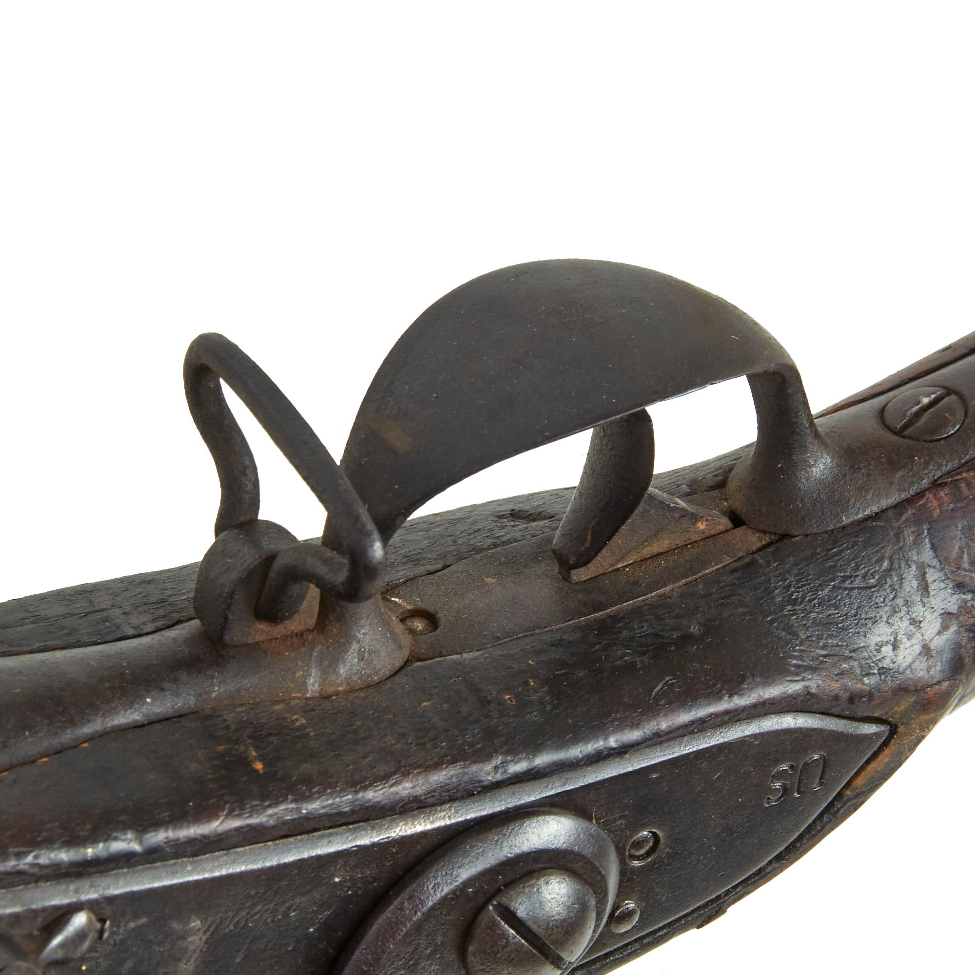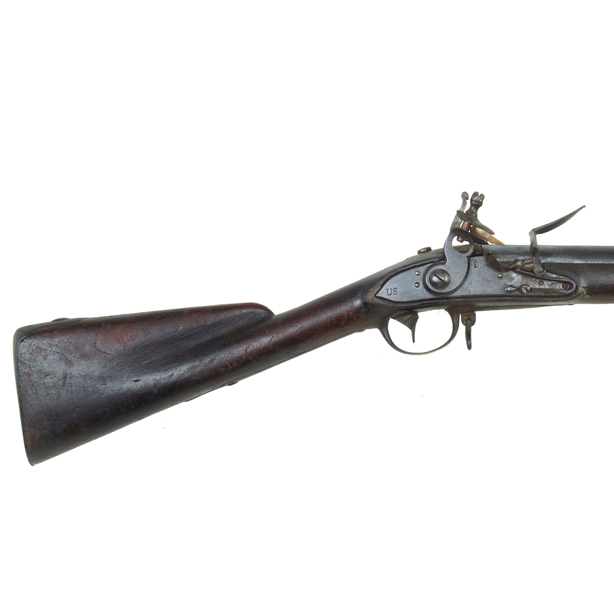 It is also marked on the lock with a STAR / D proof mark, which indicates that the 1768 modifications were applied. This would usually also be marked on the breech of the barrel, however those markings have been lost to powder burn, along with any other markings on the barrel. There is still a clear U.S. surcharge on the tail of the lock plate, indicating acceptance by the United States. There would sometimes be a "U. STATES" brand on the bottom of the butt stock, but we cannot see any markings on the stock except for the D on the left butt stock from Charleville.