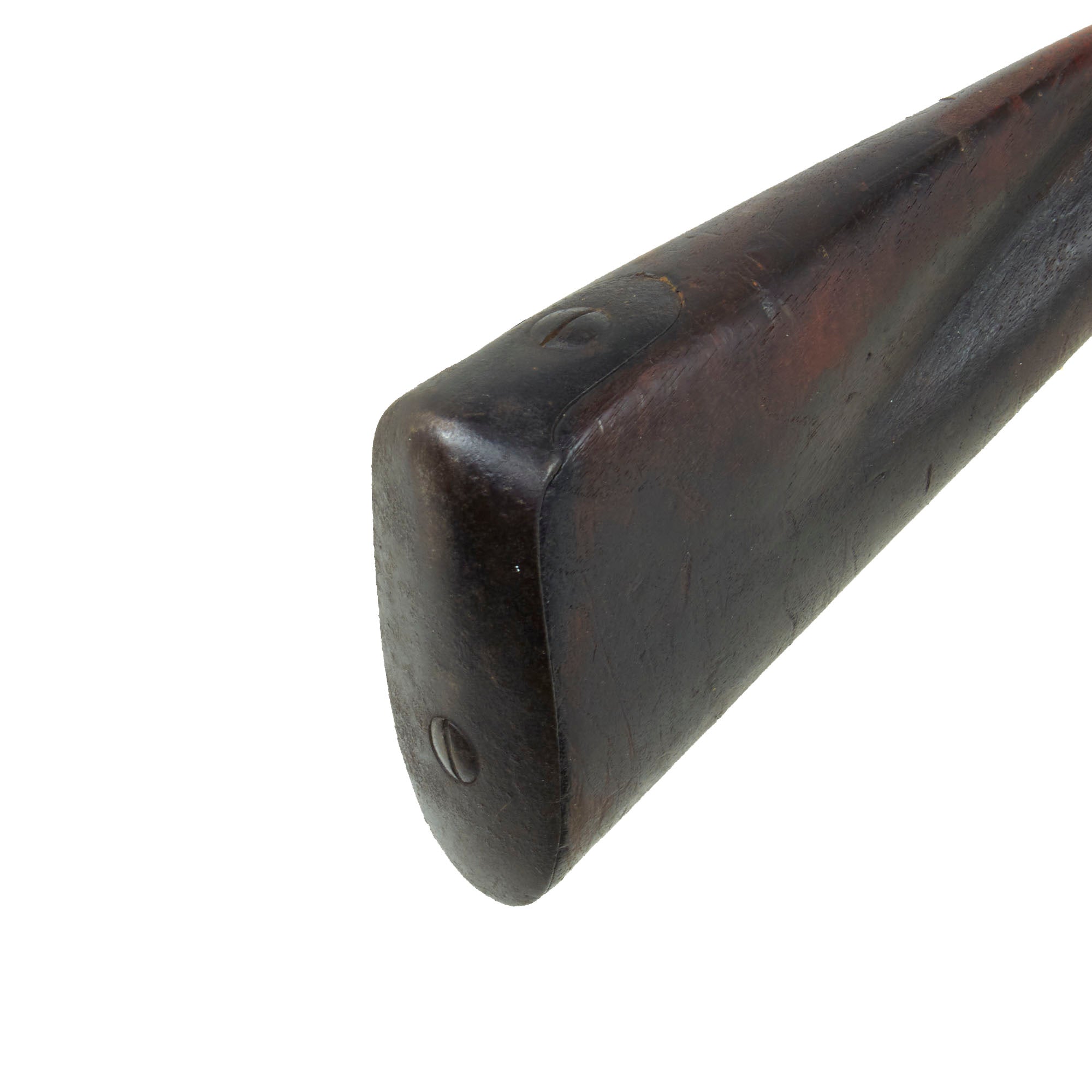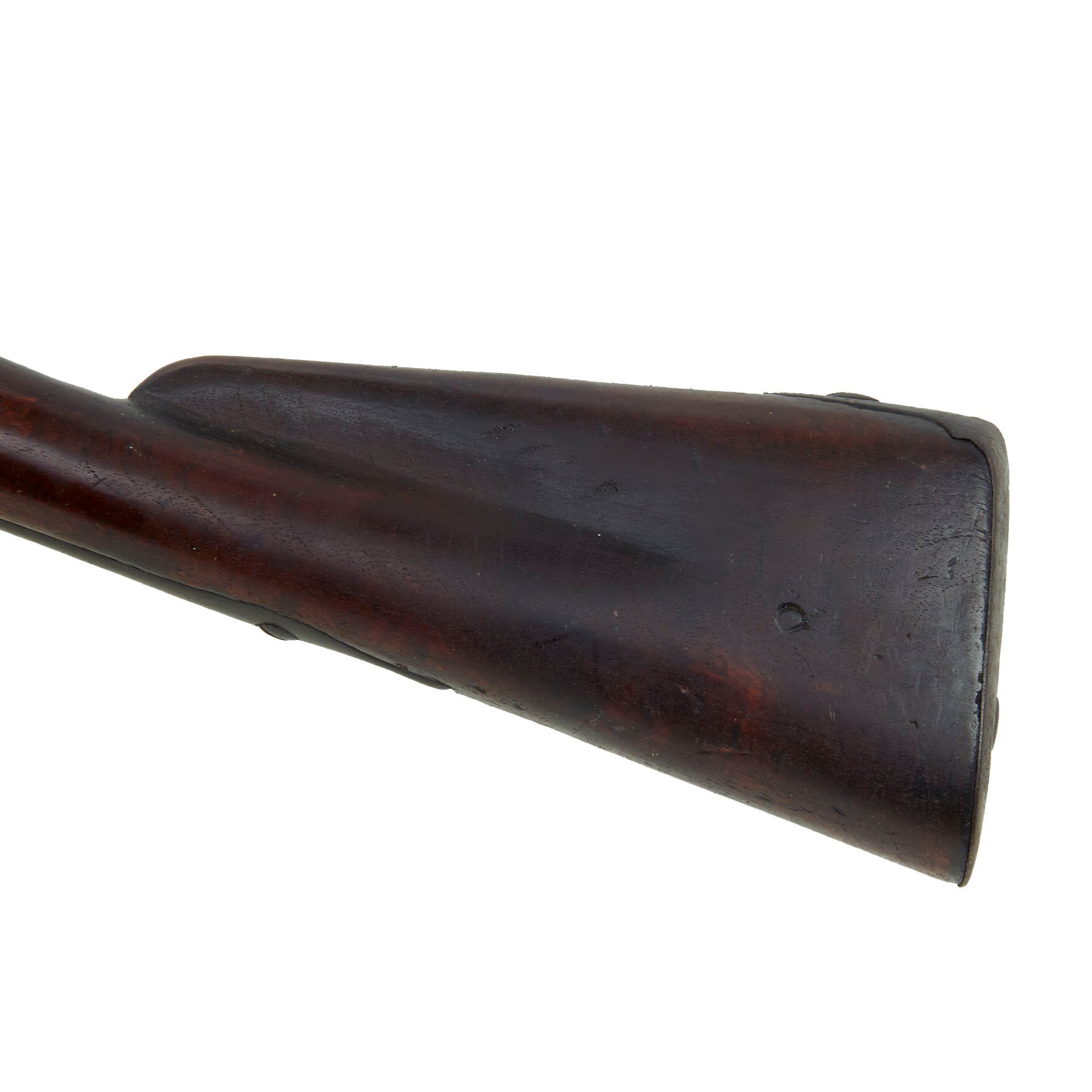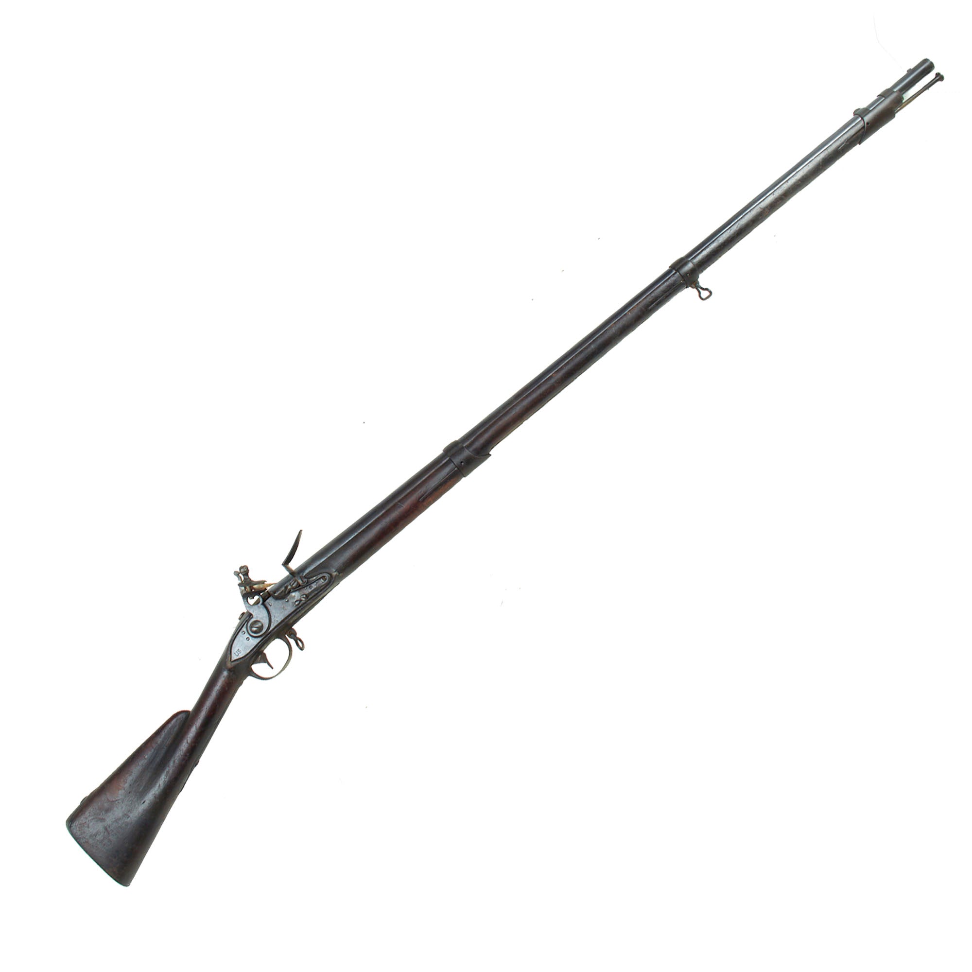 It is also marked on the lock with a STAR / D proof mark, which indicates that the 1768 modifications were applied. This would usually also be marked on the breech of the barrel, however those markings have been lost to powder burn, along with any other markings on the barrel. There is still a clear U.S. surcharge on the tail of the lock plate, indicating acceptance by the United States. There would sometimes be a "U. STATES" brand on the bottom of the butt stock, but we cannot see any markings on the stock except for the D on the left butt stock from Charleville.
