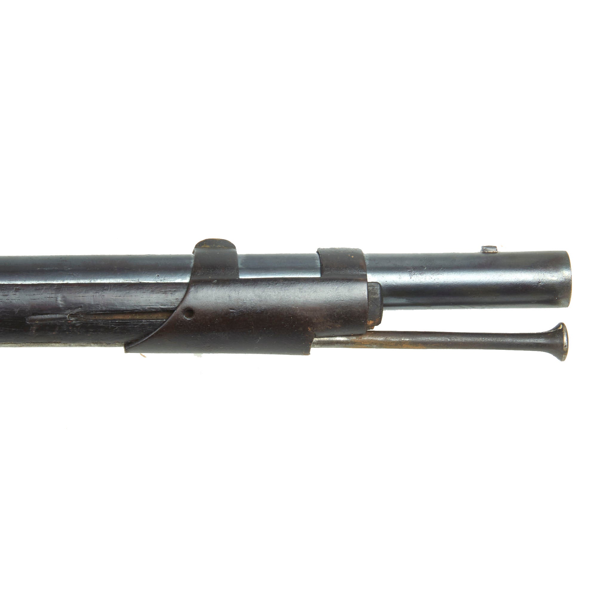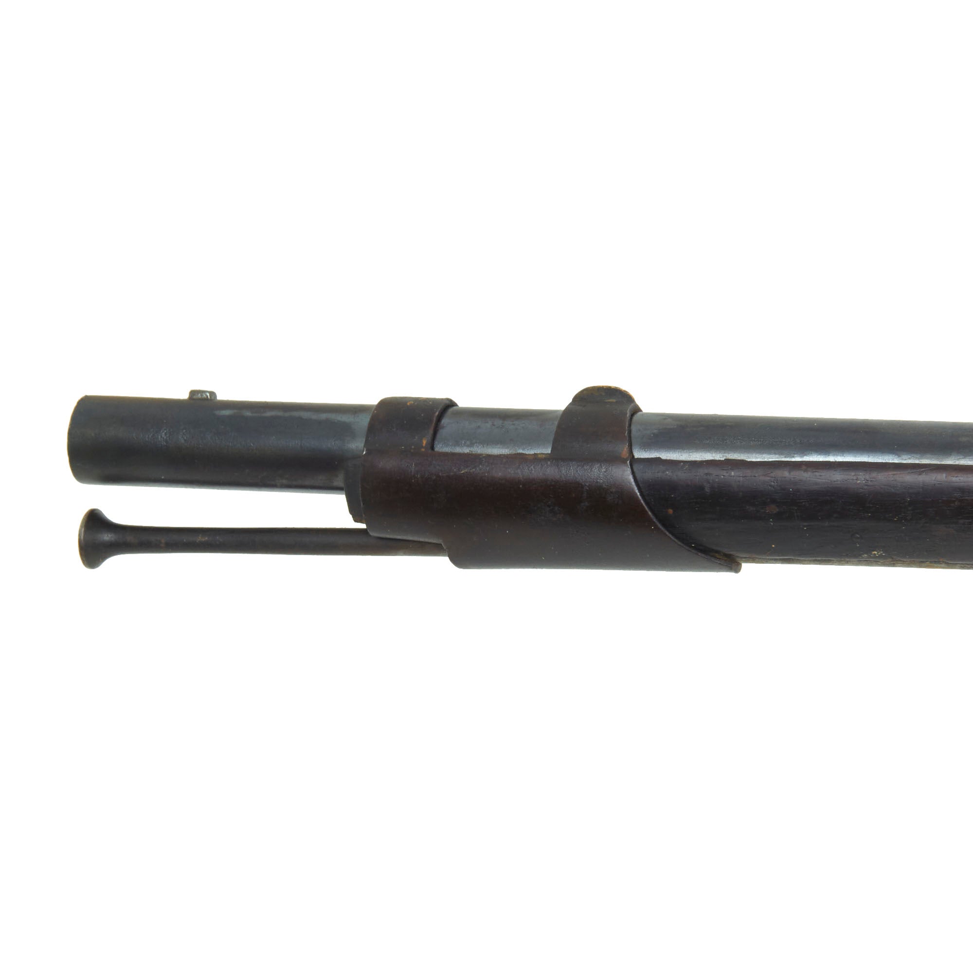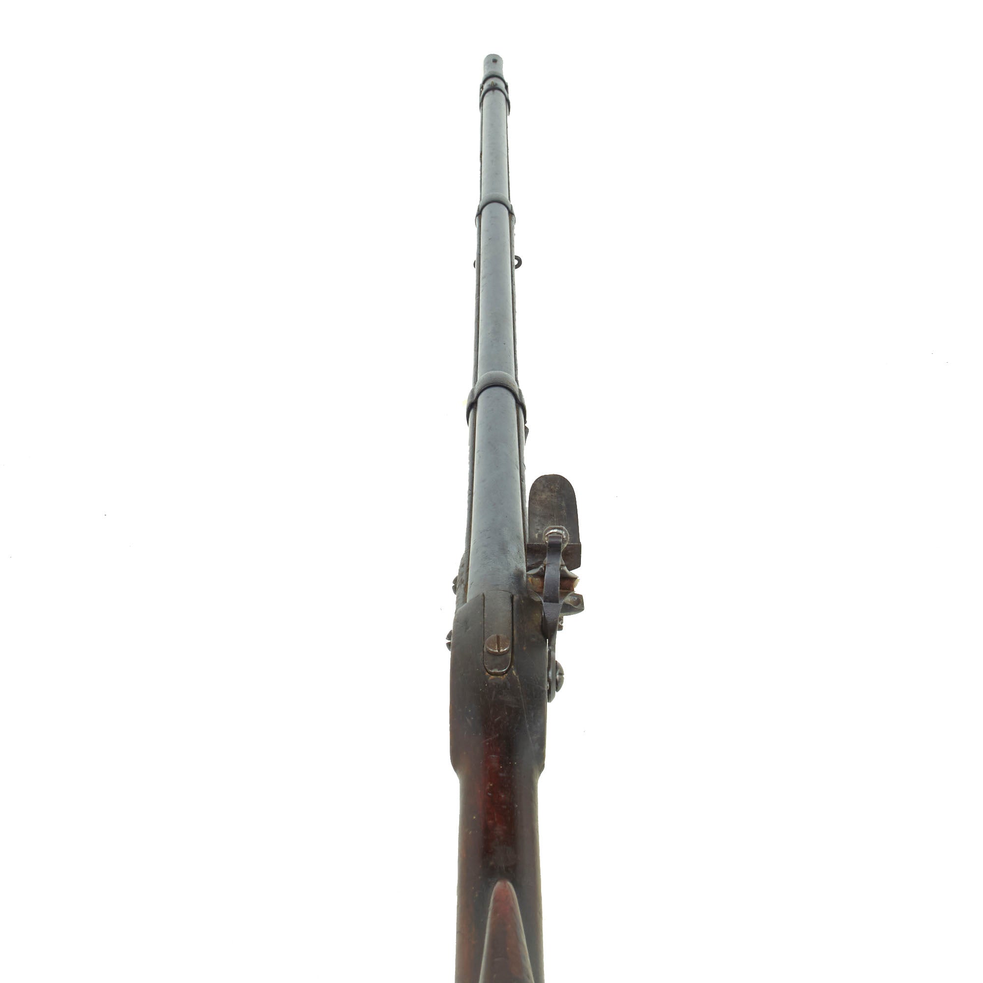 Differing from the Brown Bess not only using all steel mounts the barrel is secured by three-barrel bands, and not pins. Condition overall is lovely, with the expected wear and damage from service and age. The stock does show some past damage and old repairs around the lock and barrel tang area, a very common areas to see these due to the recoil forces. Both sling swivels are still present, as is the ramrod, which still retains threading on the interior end. We checked and the lock does cock, but at present we were not able to get it to fire due to an issue with either the trigger or tumbler. It can be disengaged and returned to the forward position by pulling it back a bit and pulling the trigger.