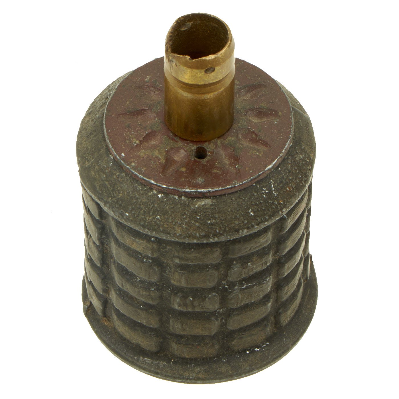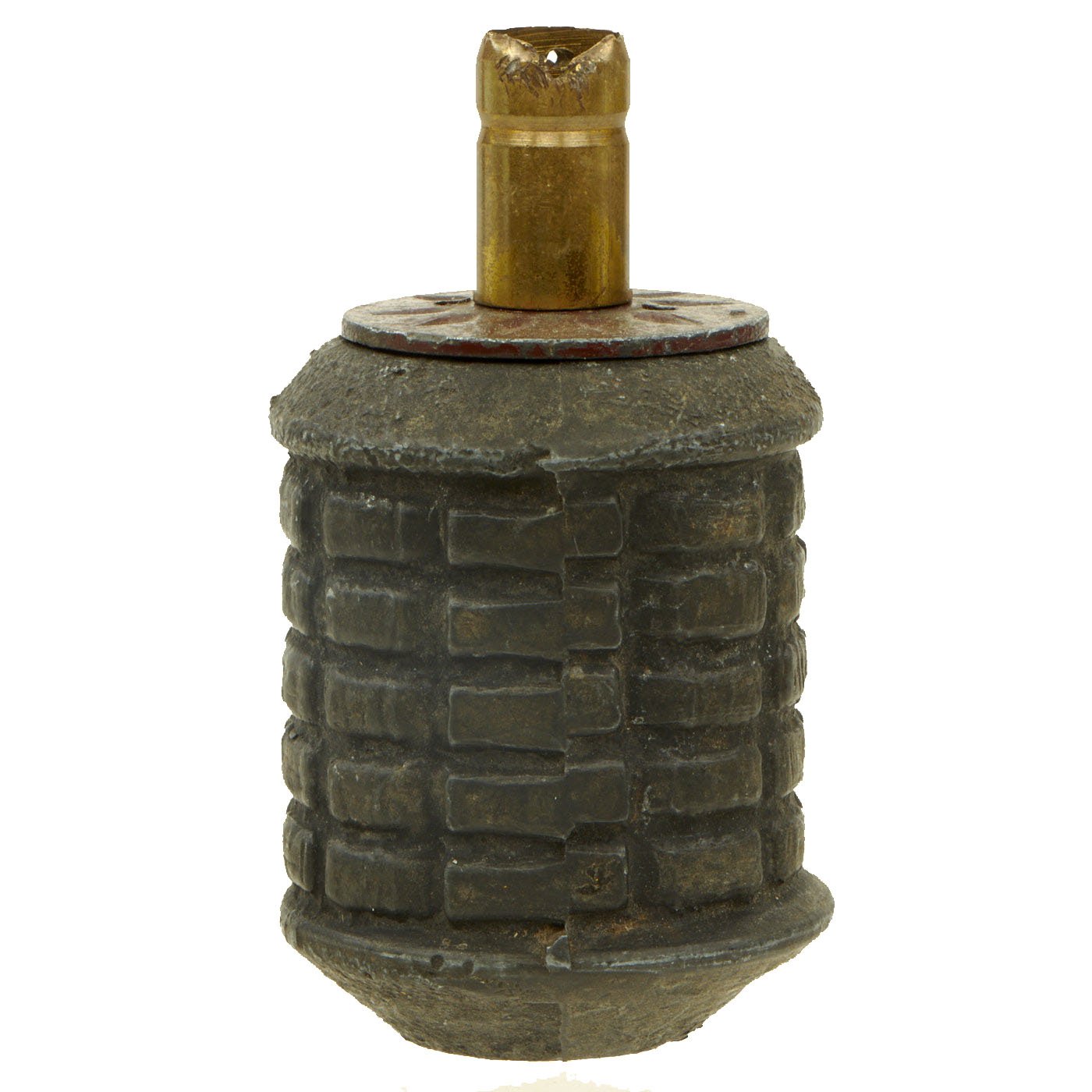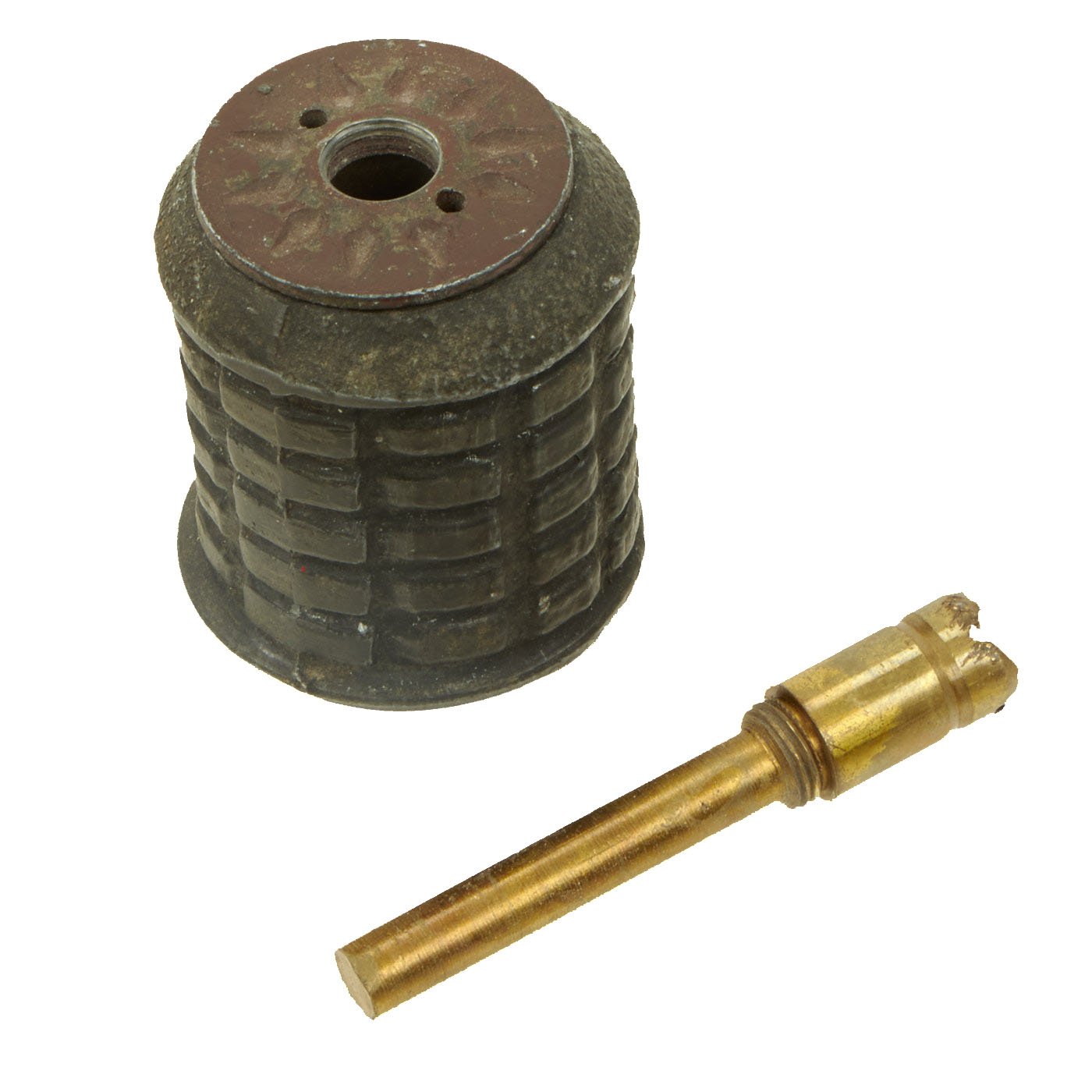 Original Item: Only One Available. This is an very nice inert Japanese Type 97 Hand Grenade, which was originally part of a U.S. WWII Japanese Mine Training Aid Set No. 2. This example is offered in very good condition, complete with the fuse still attached to the top, which can be removed to inspect the interior. The replicated internals, cap, and pin are all missing from the fuse, and the label that is on the bottom has been removed.