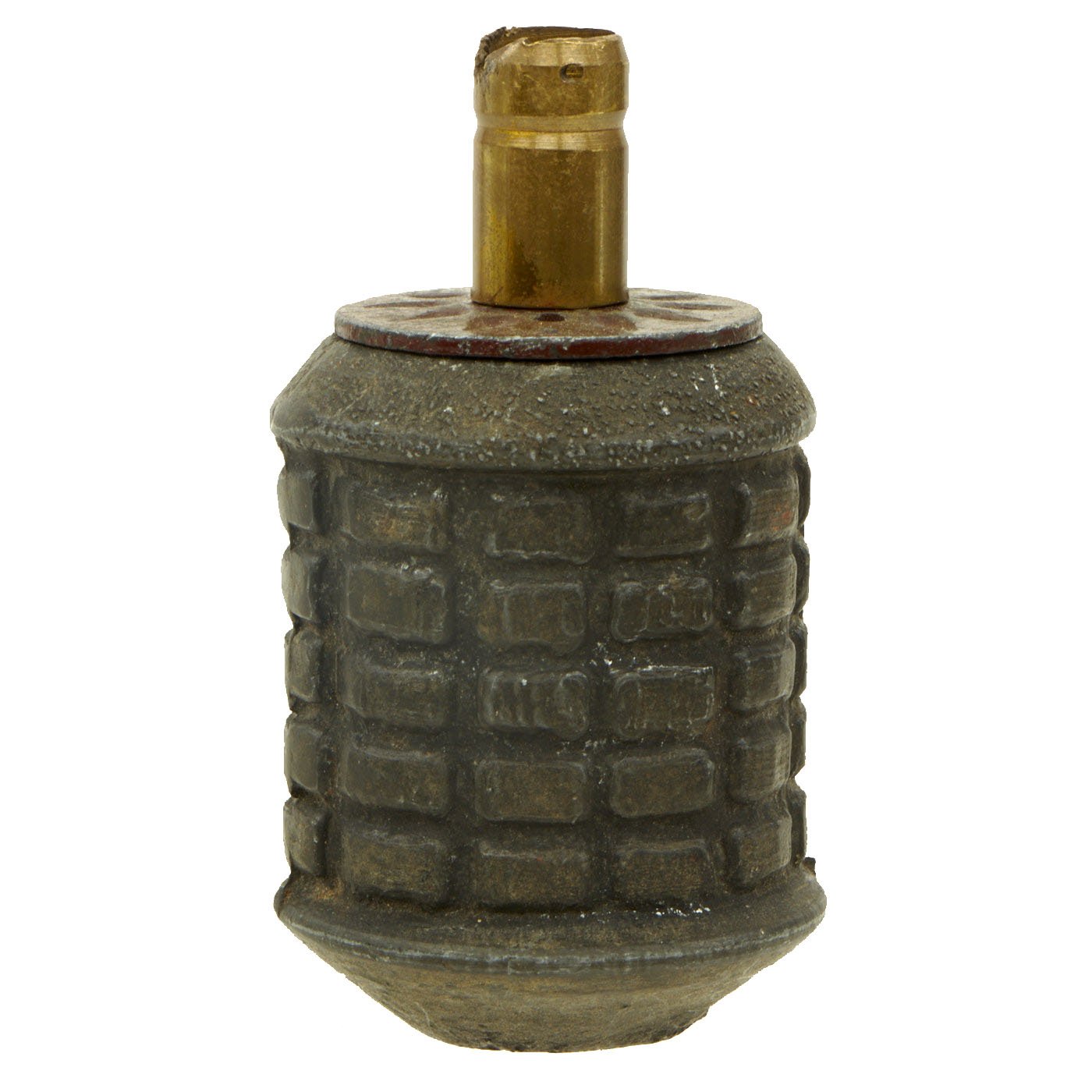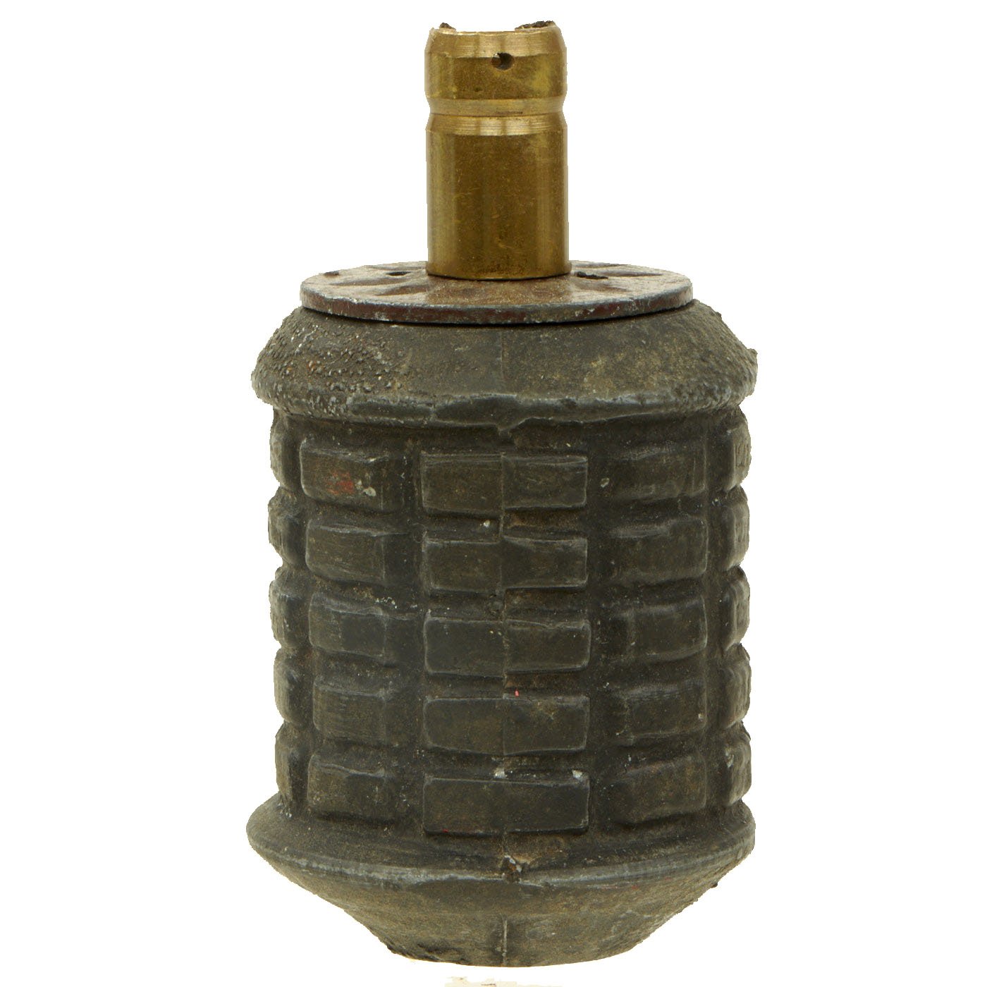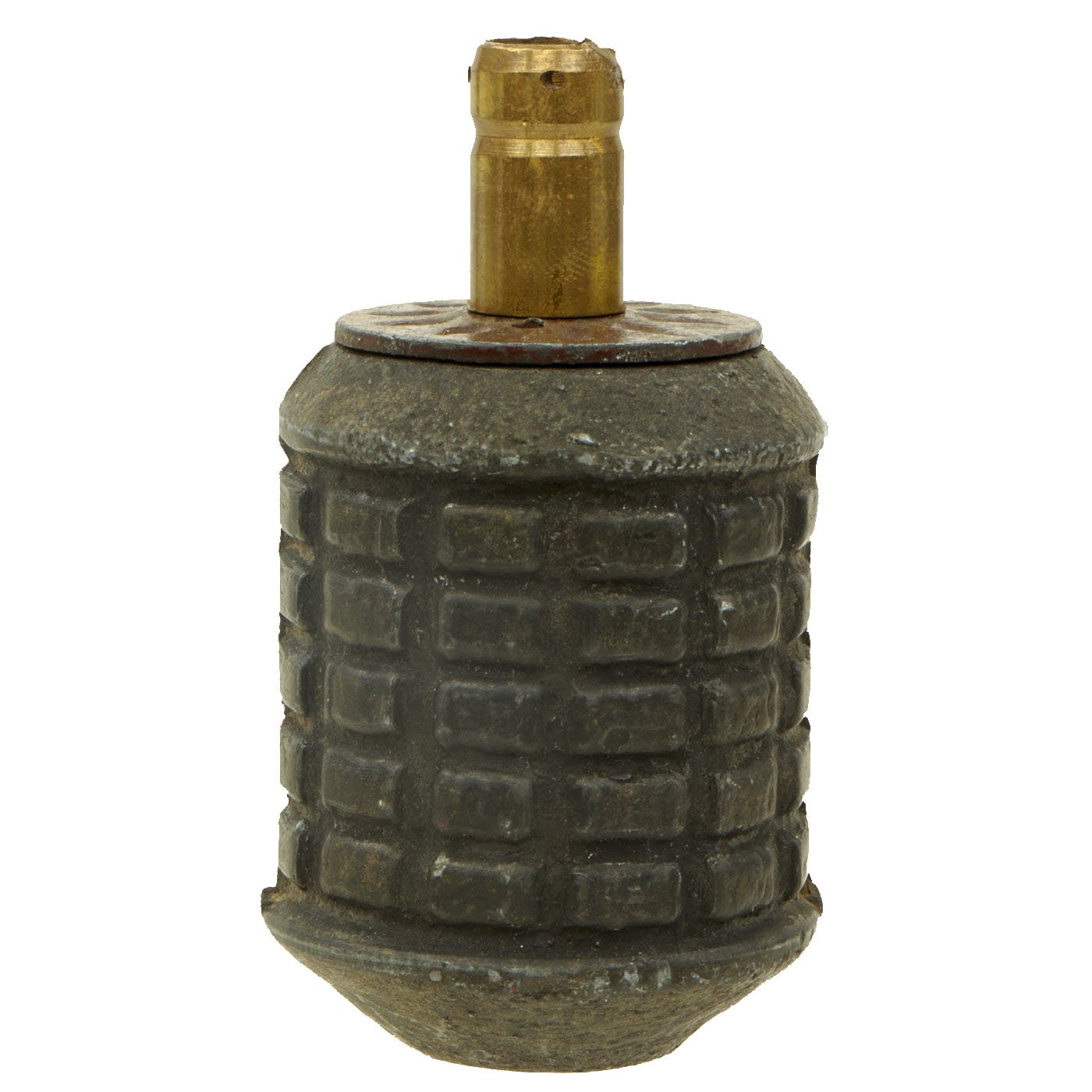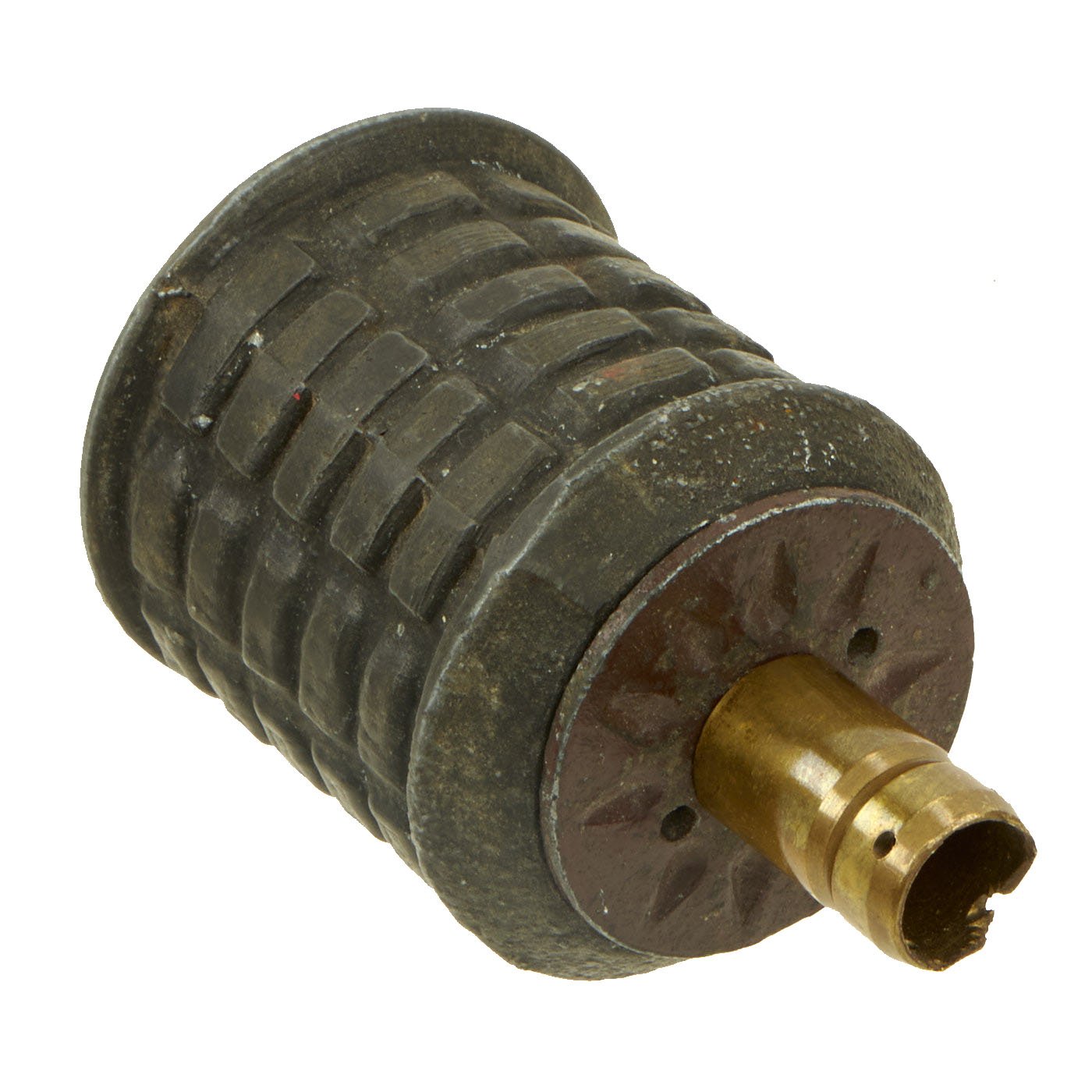 Original Item: Only One Available. This is an very nice inert Japanese Type 97 Hand Grenade, which was originally part of a U.S. WWII Japanese Mine Training Aid Set No. 2. This example is offered in very good condition, complete with the fuse still attached to the top, which can be removed to inspect the interior. The replicated internals, cap, and pin are all missing from the fuse, and the label that is on the bottom has been removed.