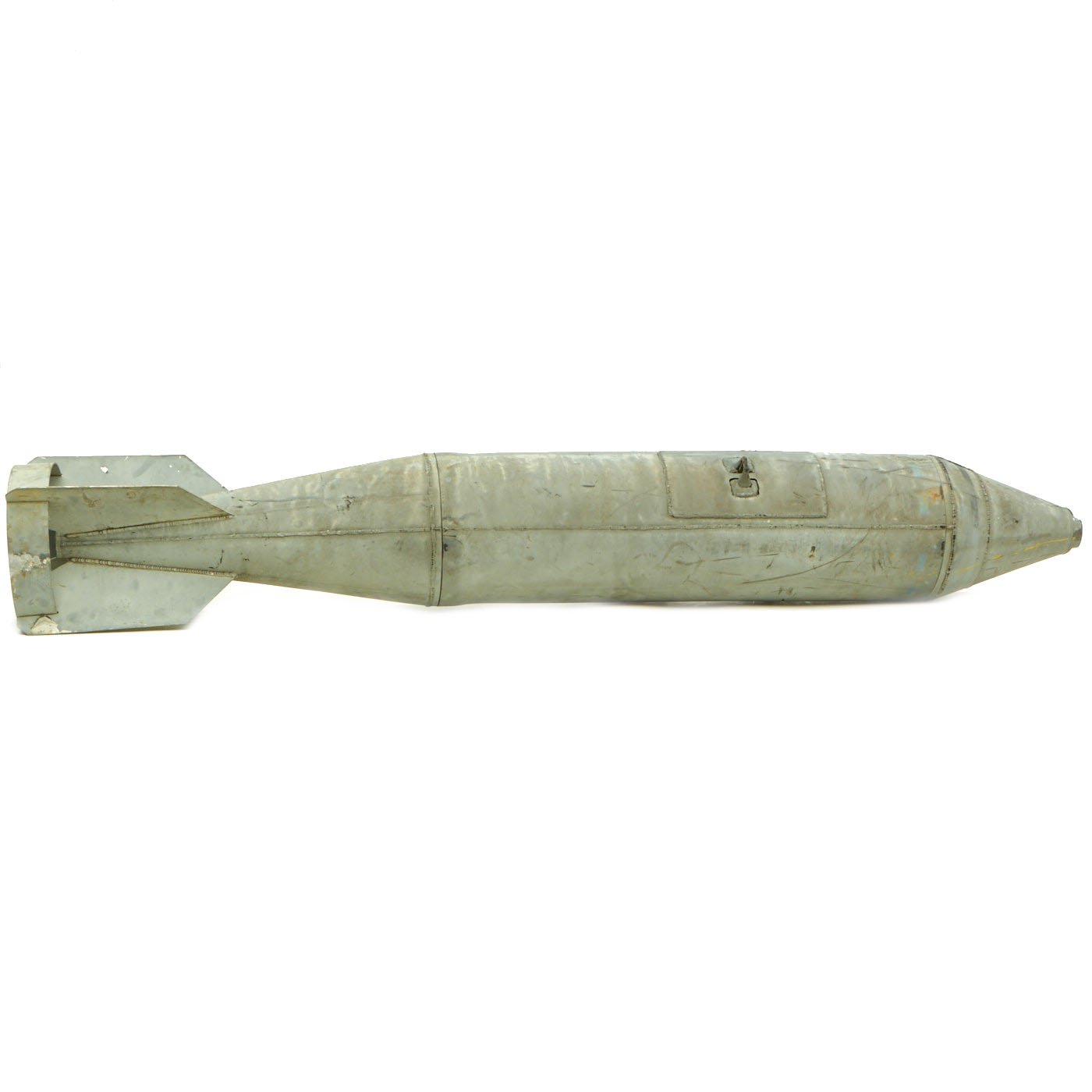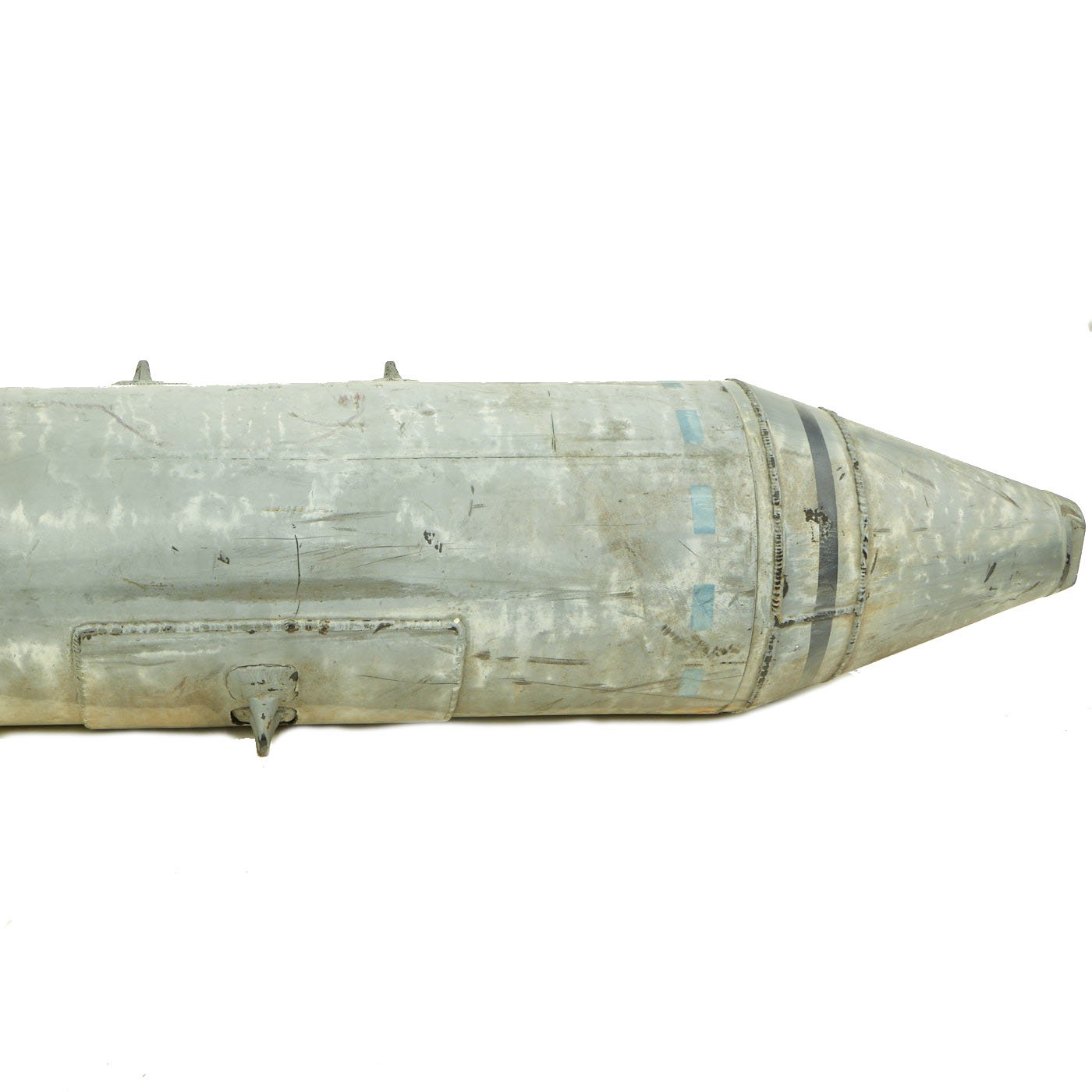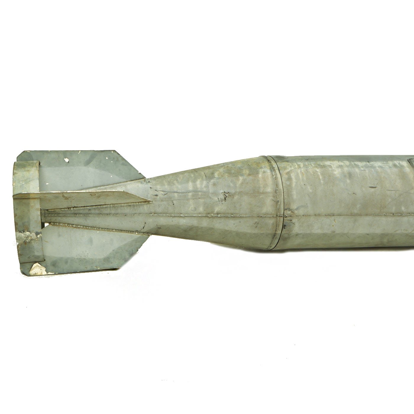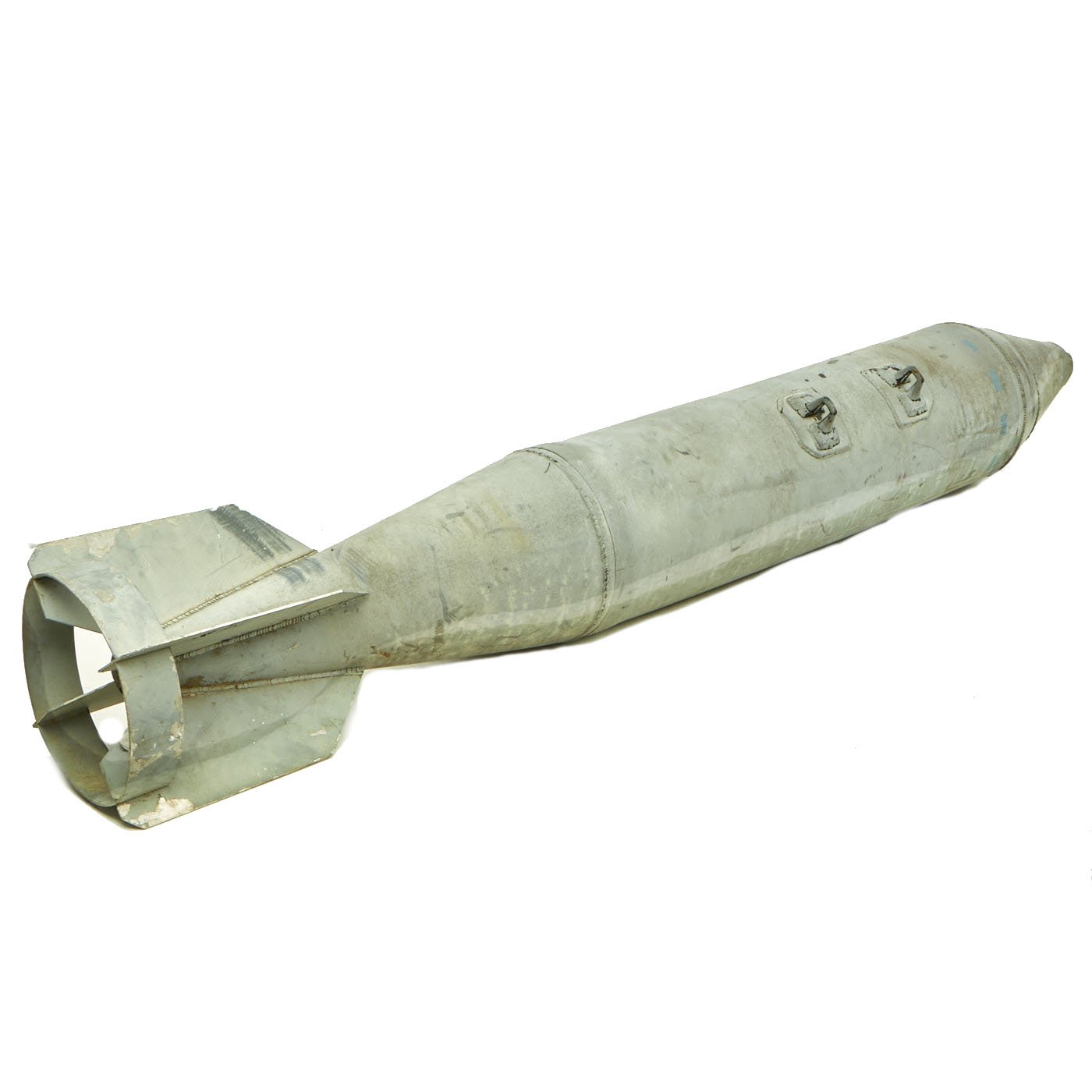 Original Item: Only One Available. This is an inert training bomb designed to appear like a version of the FAB-500 General Purpose Bomb, perhaps the FAB-500 M-46. The FAB-500 is a Soviet designed, general purpose, air-dropped bomb with a total weight of 500 kilogram with a high-explosive warhead, primarily used by the Russian Air Force, former Soviet republics and customer Countries. The original M-54 model was rolled out in 1954, shaped for internal carriage by heavy bombers, a low-drag M-62 version in 1962 was intended for fighter bomber external hard point carriage. The bomb is unguided, features a single nose fuse, and is compatible with most models of Soviet aircraft. The FAB-500 was largely employed over Afghanistan by Soviet and allied Afghan forces during the 1980s. It has been used most recently over Syria by both Russian and Syrian warplanes.