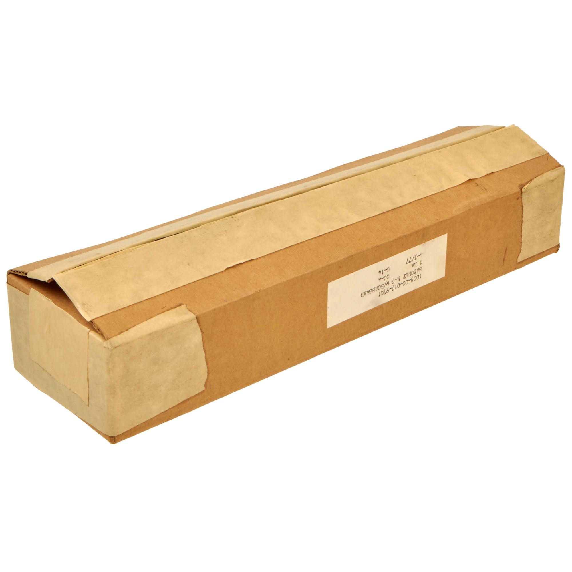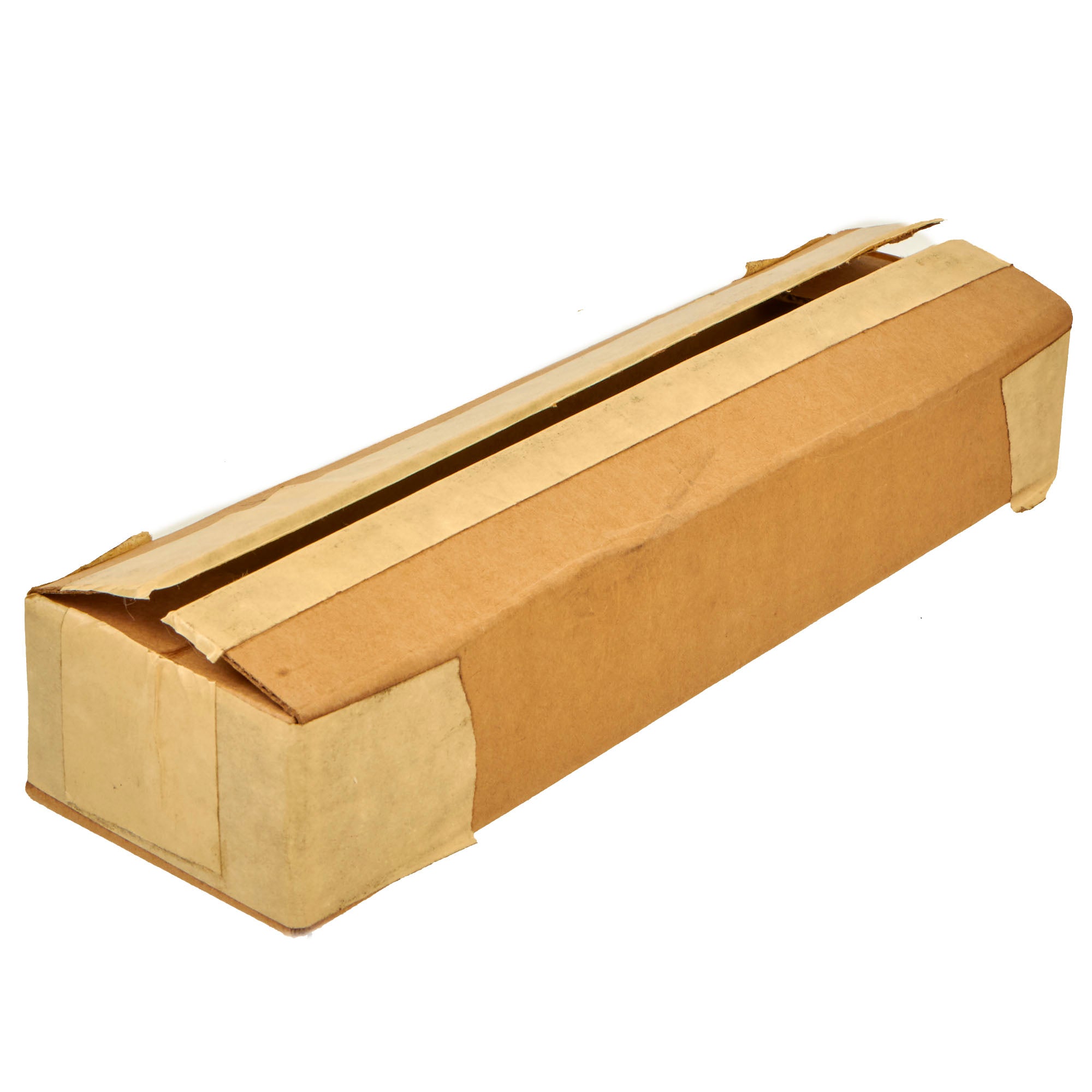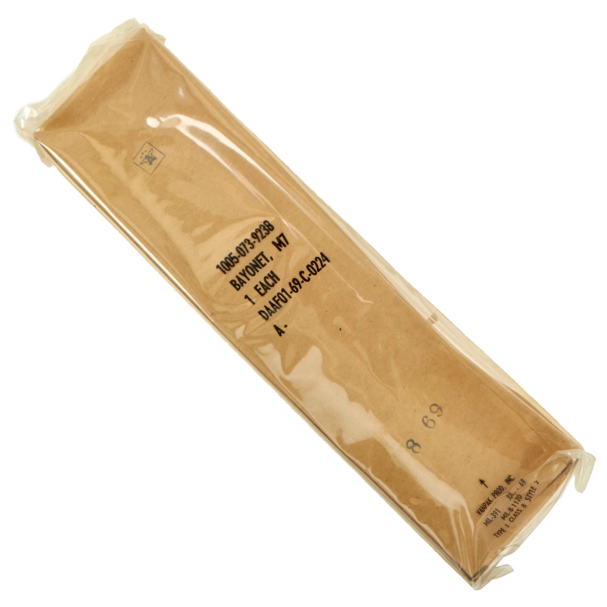 Original Item: Only One Available. This is a fantastic unopened and unissued M7 bayonet still in its original box! We have not opened the packaging, only the box to confirm contents. If you should choose to open the items, be mindful, although these are still packaged, there could be minor oxidation present. The contents came in a box that differs from the original box in which this set would have come in, so the numbers may not match on the internal contents. The bayonet “repack” box is dated 3/77.