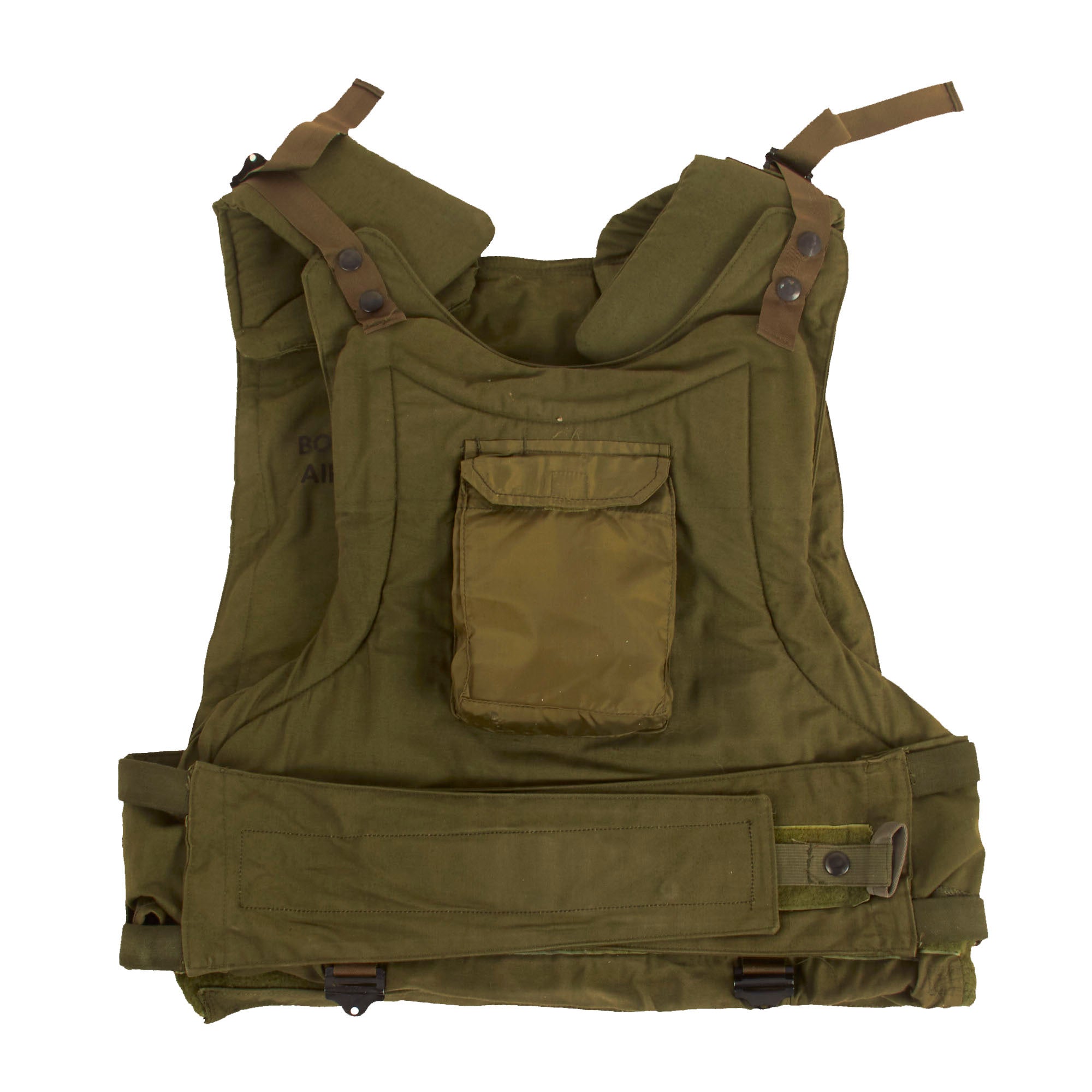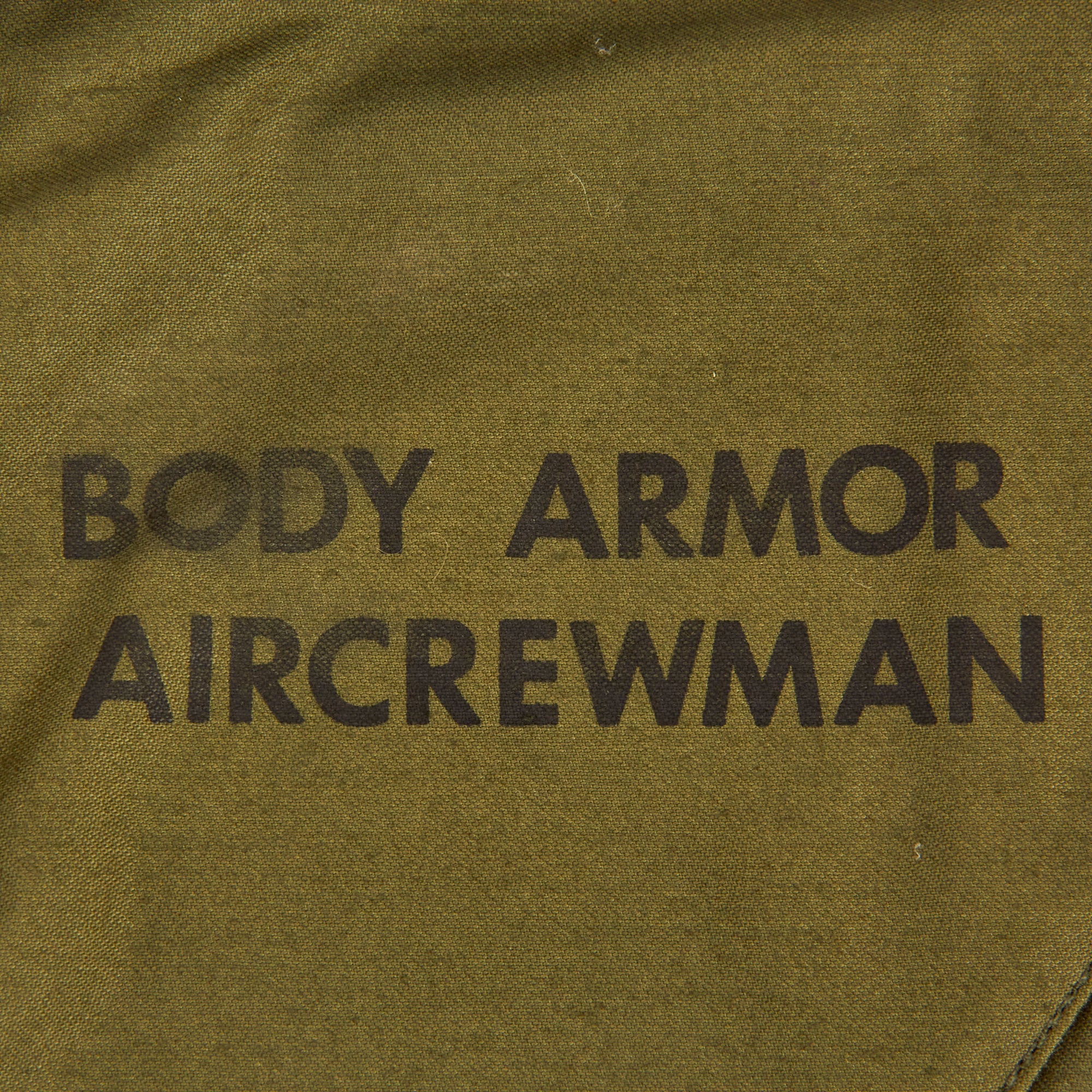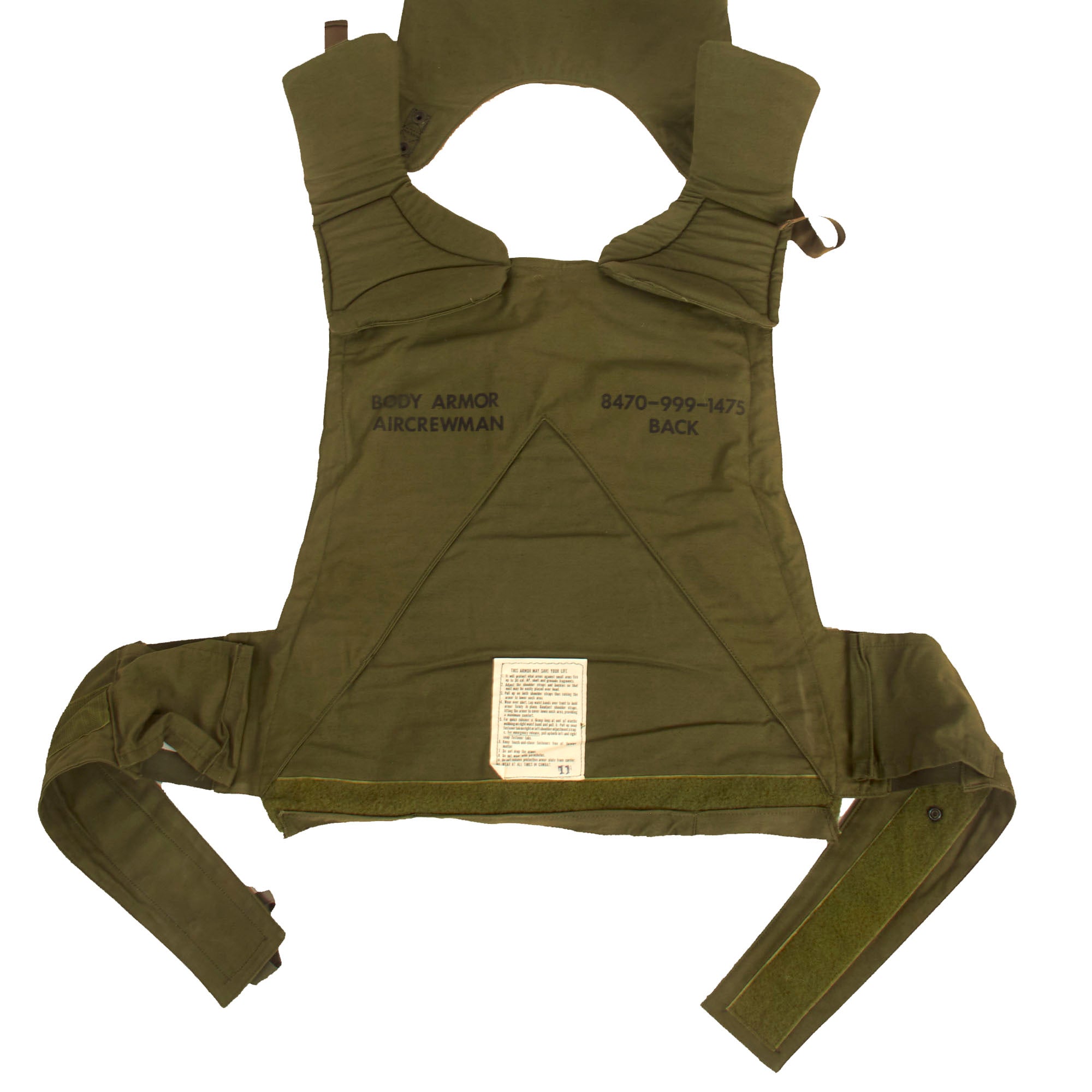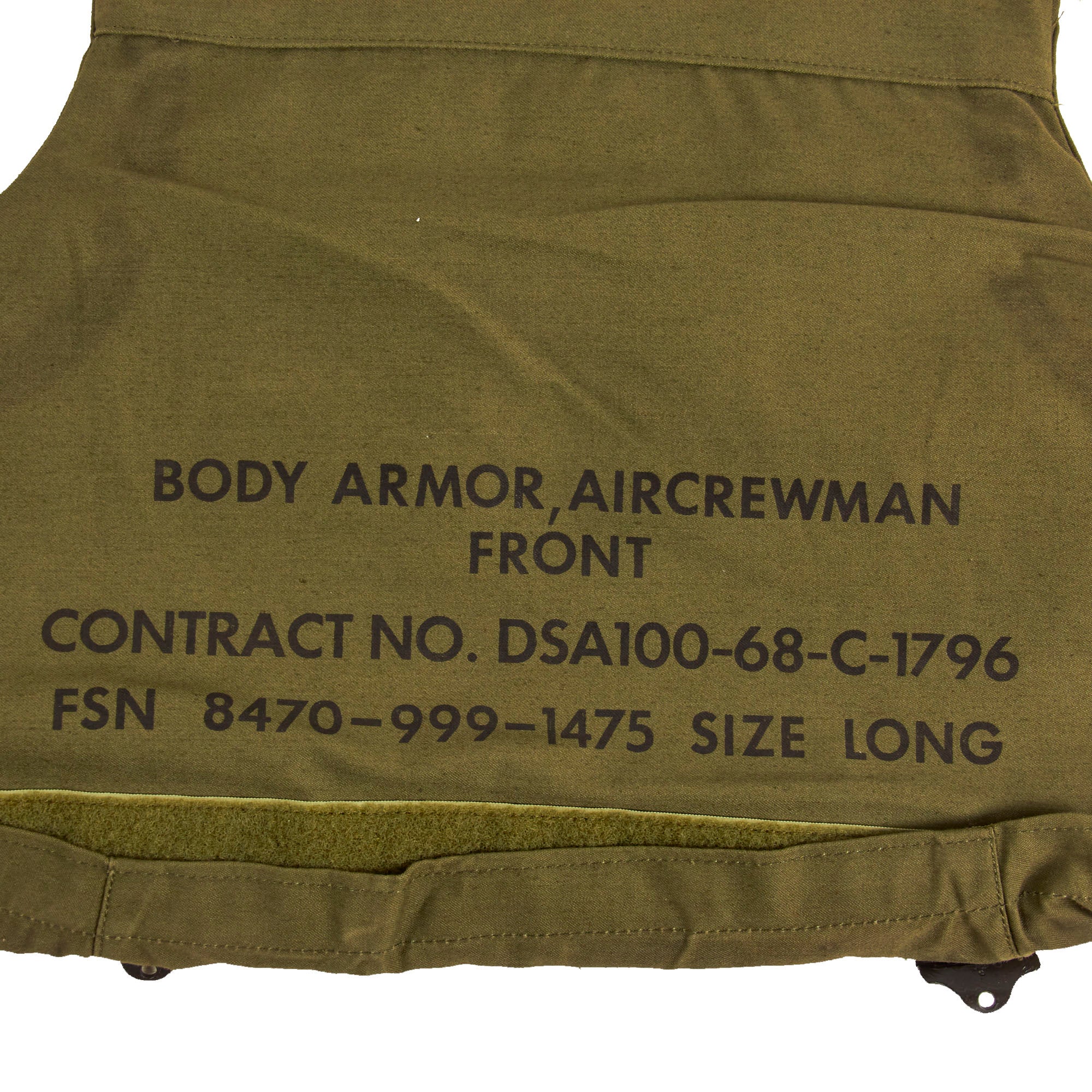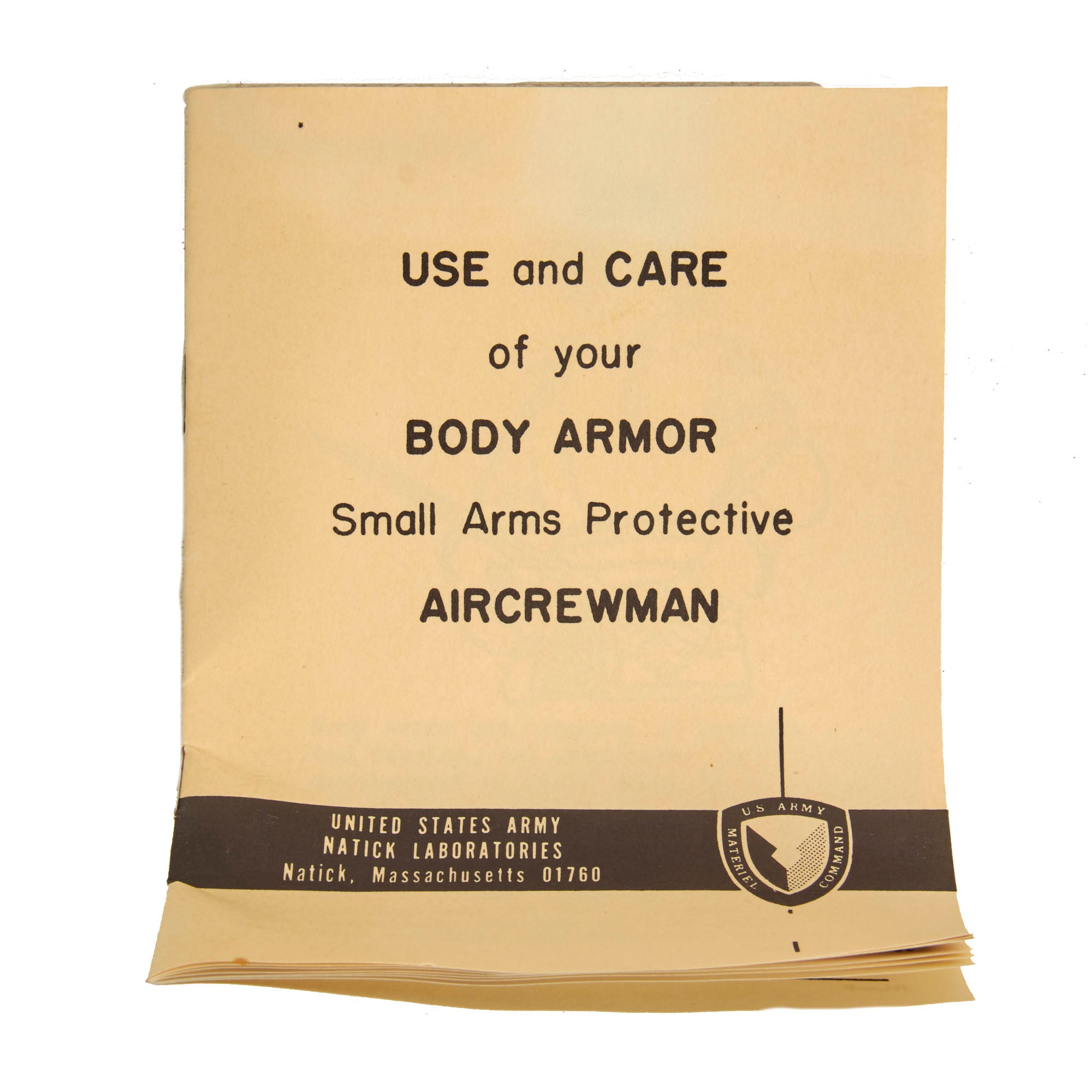 Original Item: Only One Available. Made from two components officially named BODY ARMOR AIRCREWMAN FRONT and BODY ARMOR AIRCREWMAN BACK, this vest dates from the Vietnam War (1968 Contract) and was used by helicopter gun ships and and airmobile recon units during the war. These would normally have armor plates fitted into the pockets of the vest, however this example looks to never have been issued for combat use, so the plates were never fitted. It even retains the original U.S. Army USE and CARE manual in the front pocket, which is in excellent condition, though a bit curled from storage.