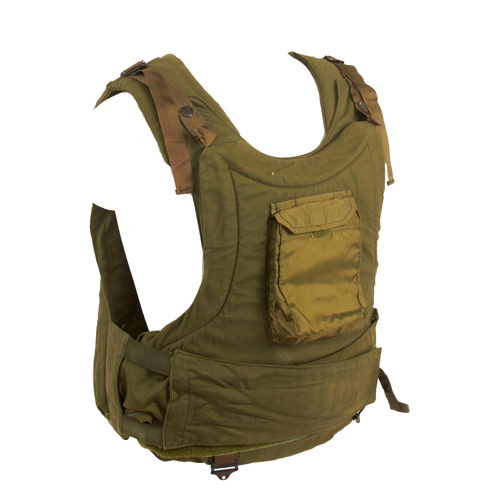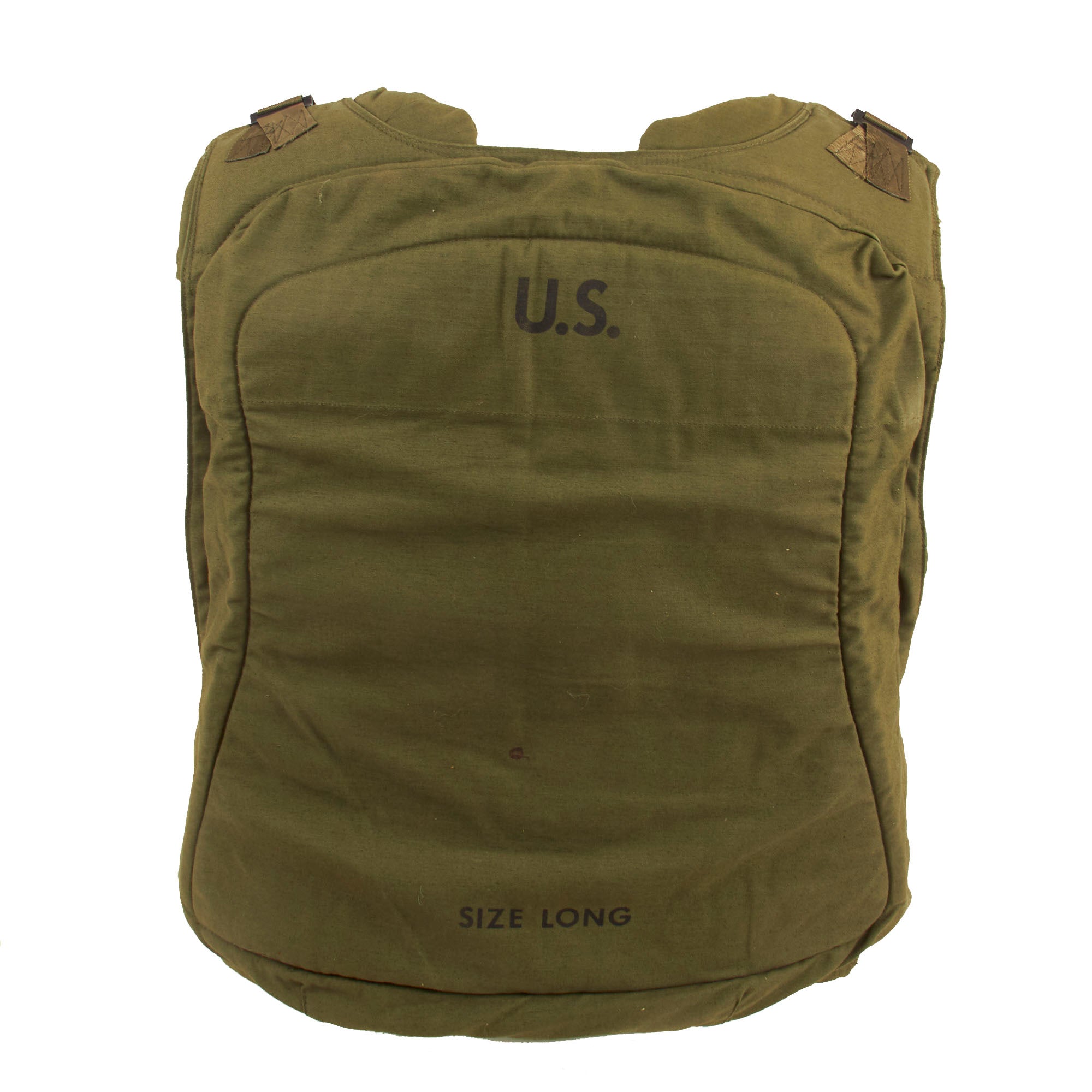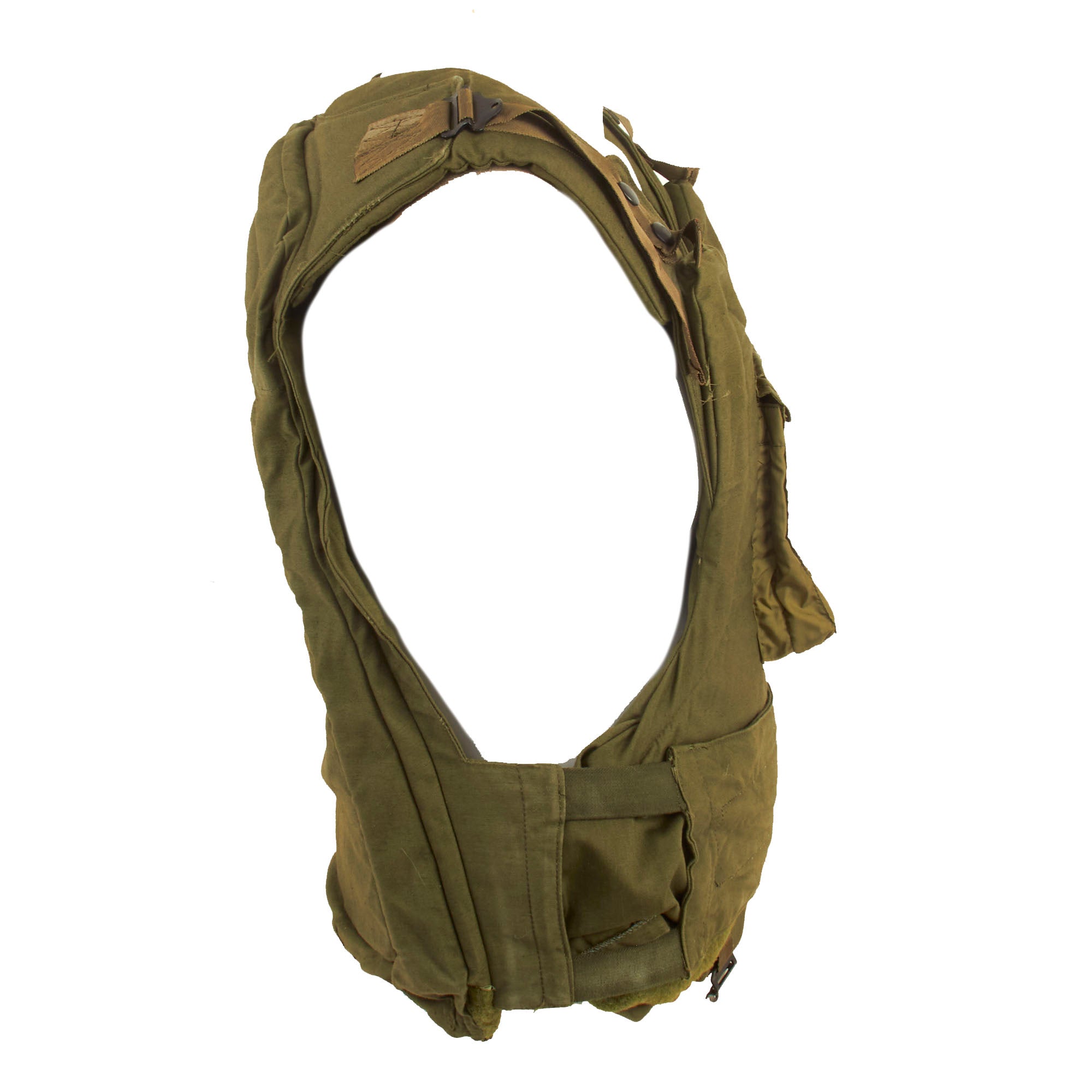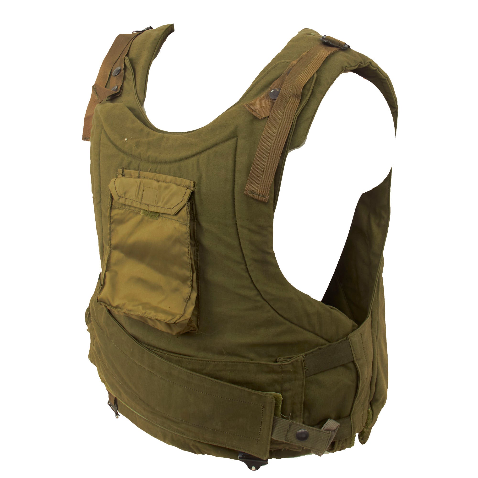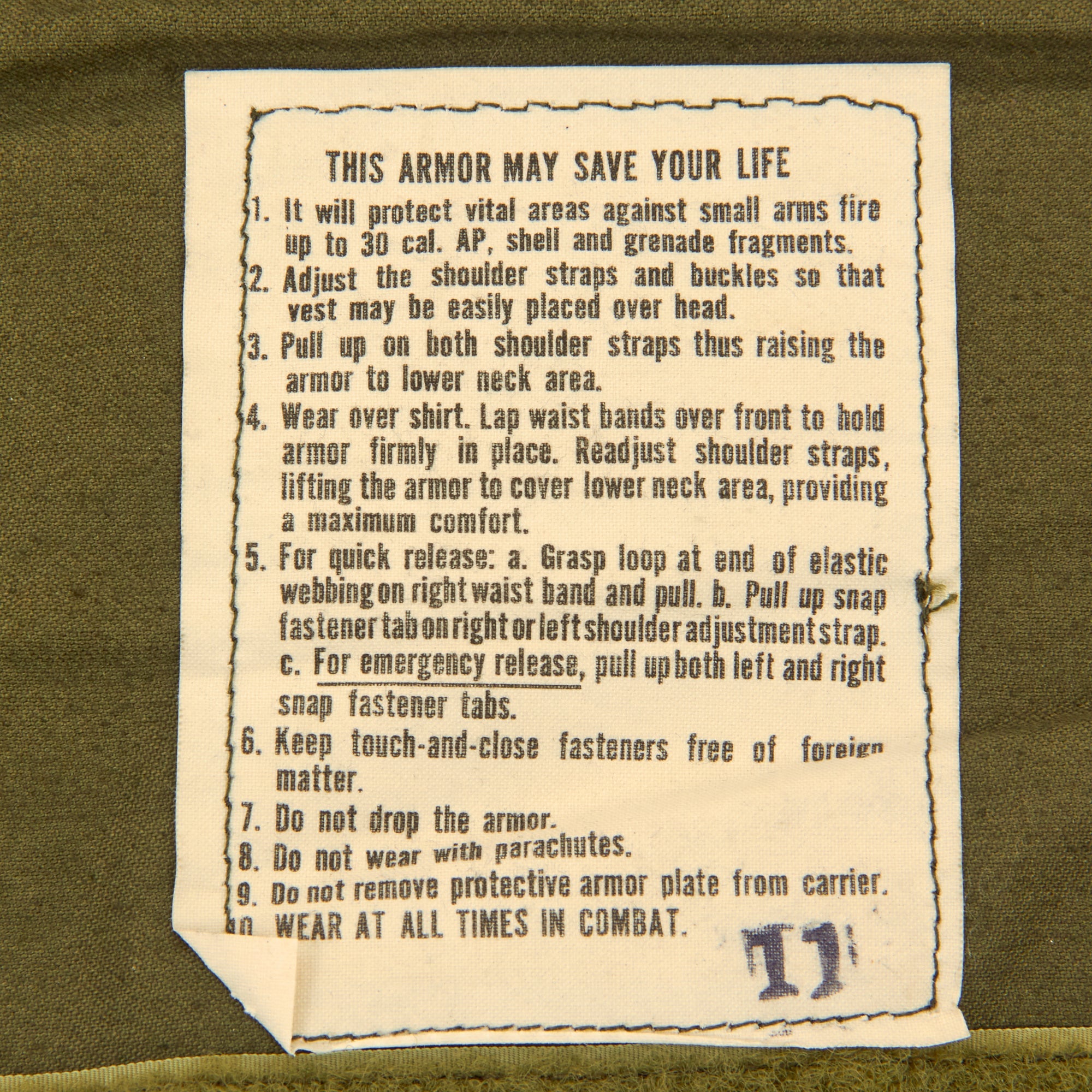 Original Item: Only One Available. Made from two components officially named BODY ARMOR AIRCREWMAN FRONT and BODY ARMOR AIRCREWMAN BACK, this vest dates from the Vietnam War (1968 Contract) and was used by helicopter gun ships and and airmobile recon units during the war. These would normally have armor plates fitted into the pockets of the vest, however this example looks to never have been issued for combat use, so the plates were never fitted. It even retains the original U.S. Army USE and CARE manual in the front pocket, which is in excellent condition, though a bit curled from storage.