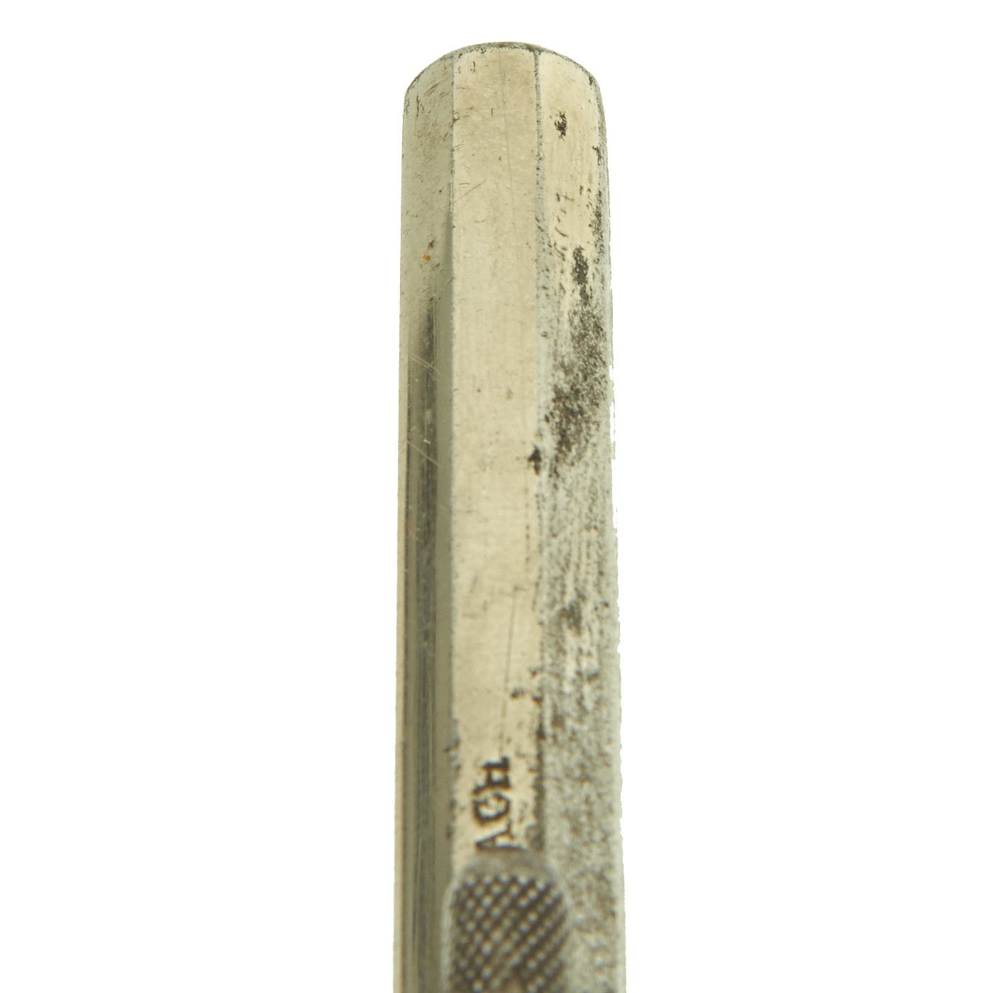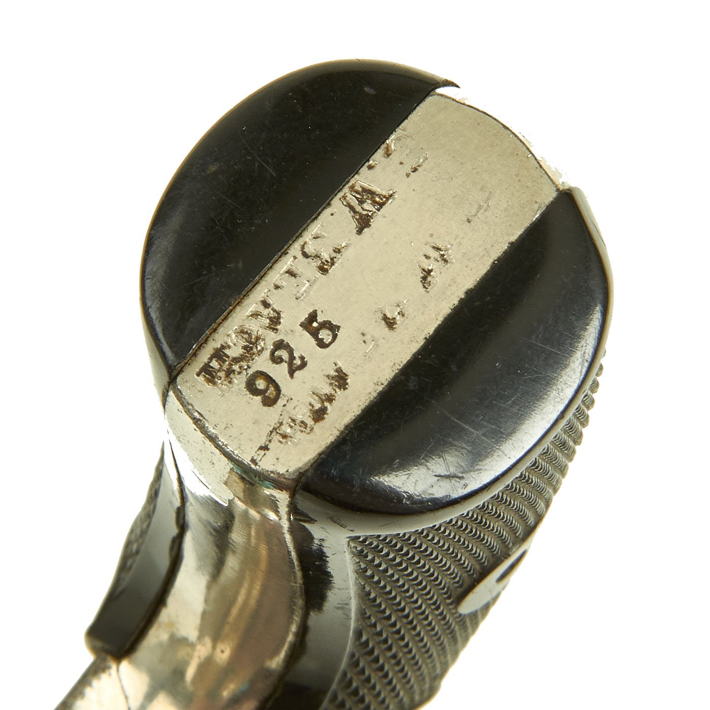 This lovely revolver has lovely black checkered Gutta Percha grips with a Naval “Fouled Anchor” on the top, and is nickel plated overall and fully engraved. The revolver cycles well but needs slight adjustment with the hammer holding in full cock position.