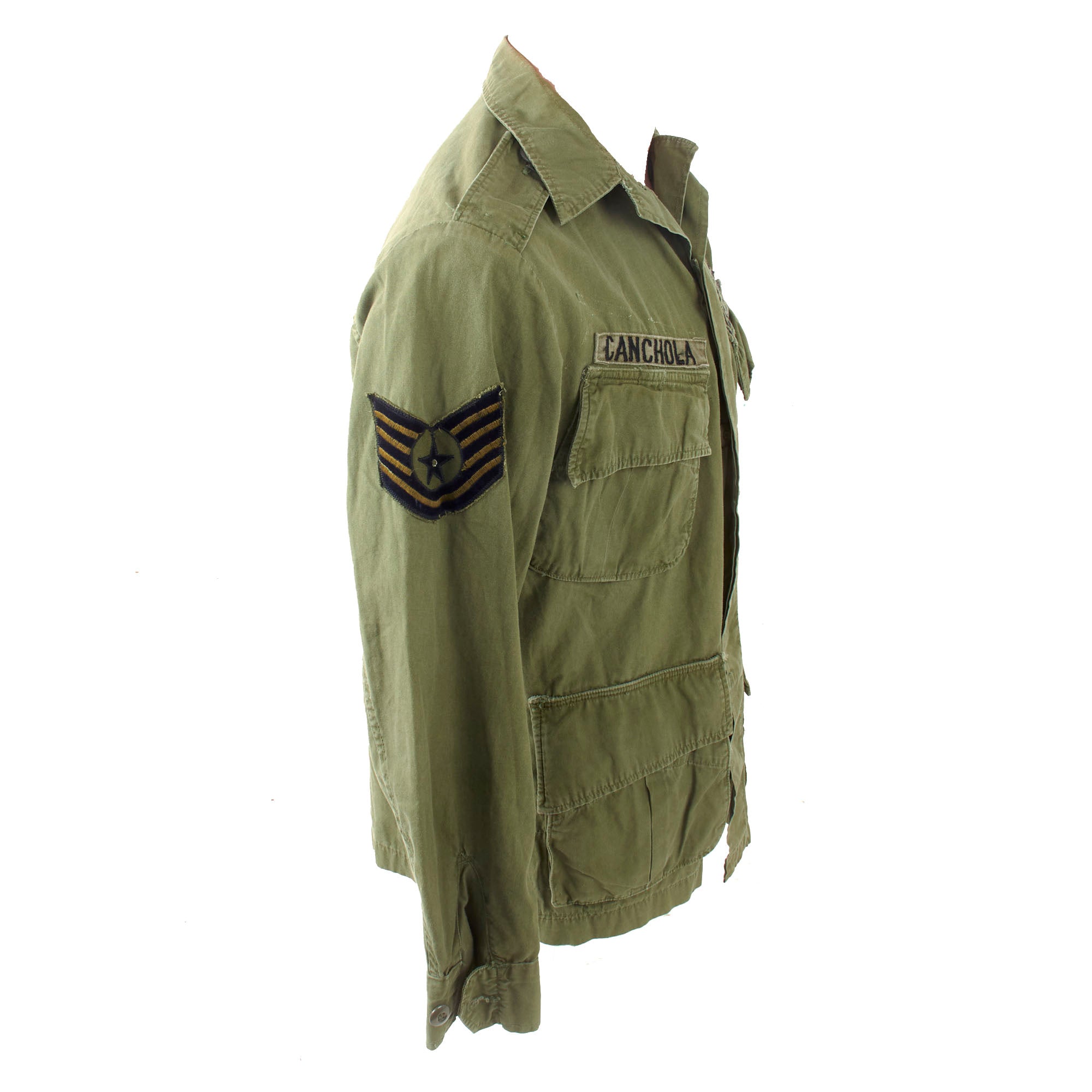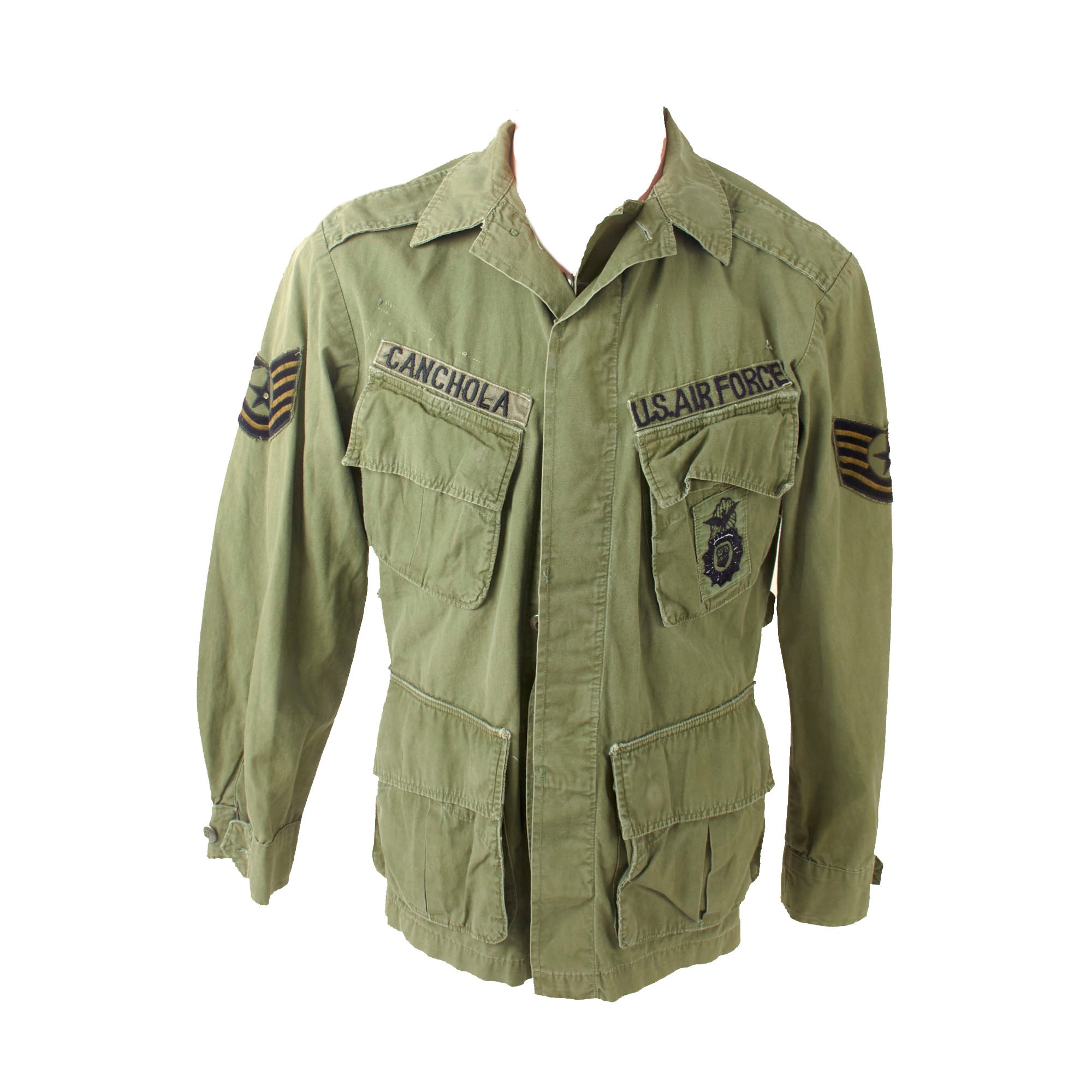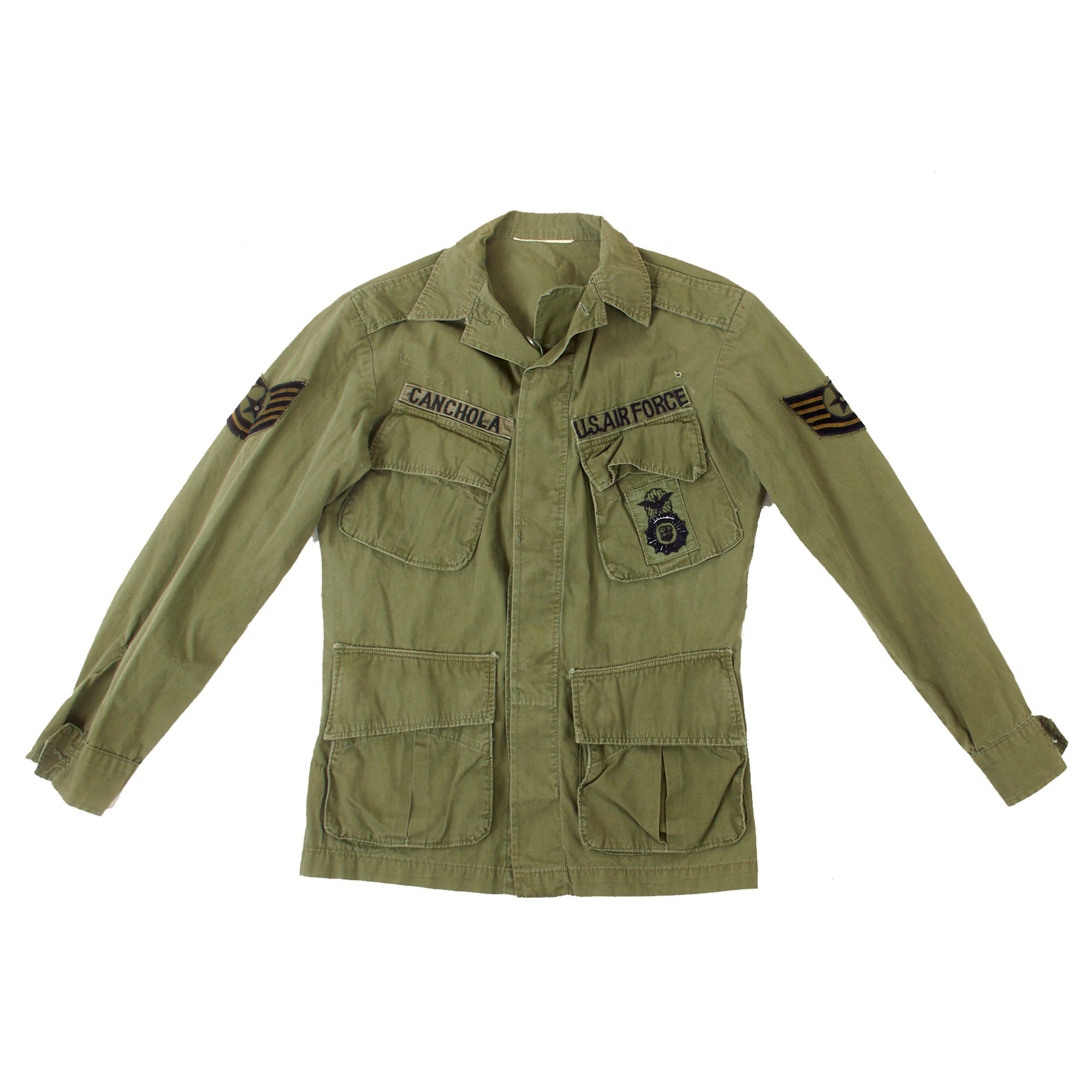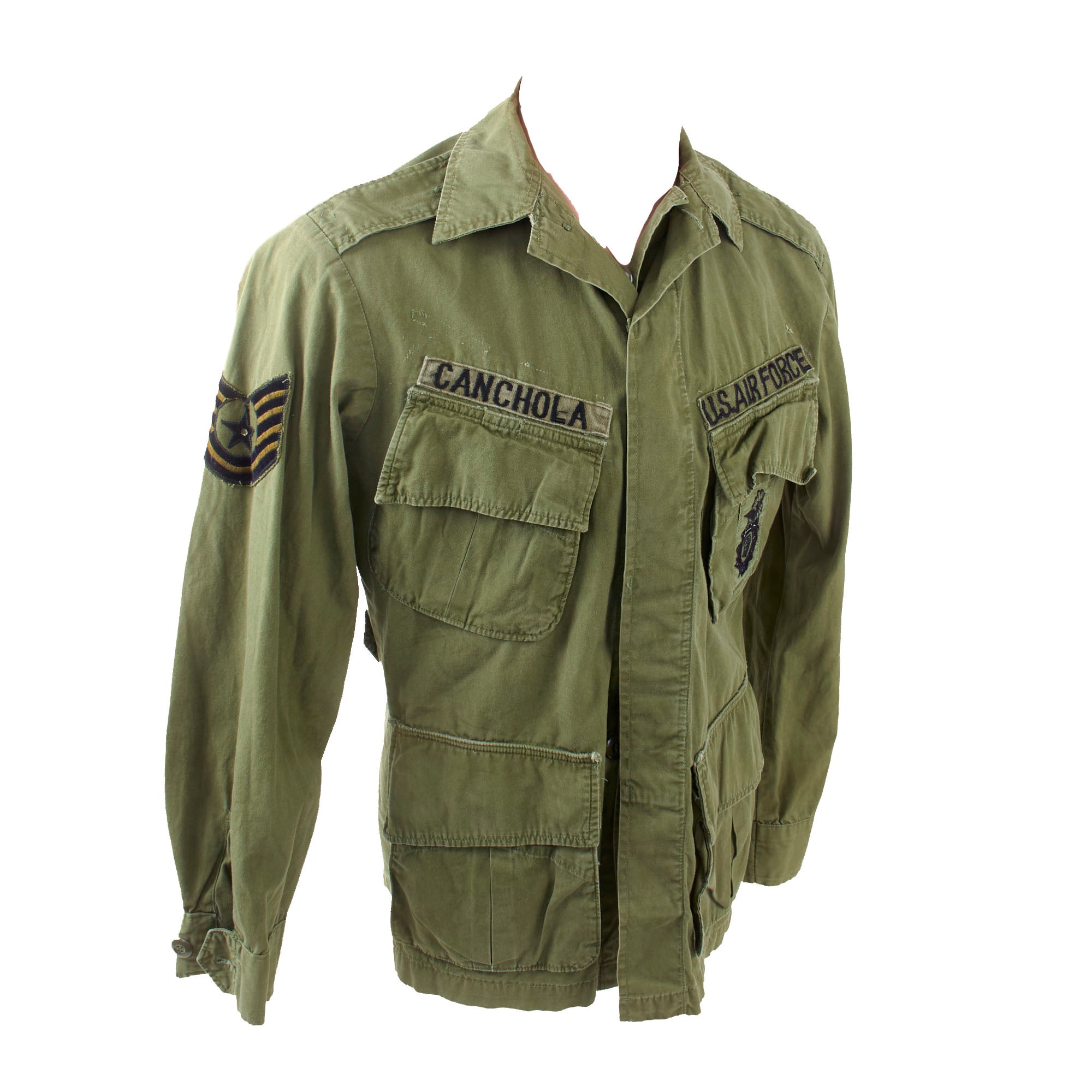 This is a great 2nd Pattern Poplin jungle fatigue shirt with great period-applied “Incountry” Vietnamese-made insignia for the U.S. Air Force Security Police. The shirt has nametapes for the US Air Force and the name CANCHOLA. On the left breast pocket is the insignia of the US Air Force Security Police, and on the sleeves are Air Force ranks for Technical Sergeant.