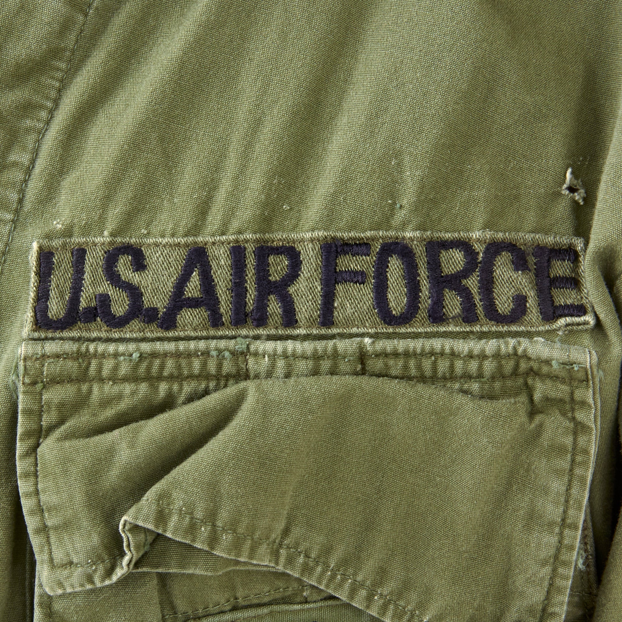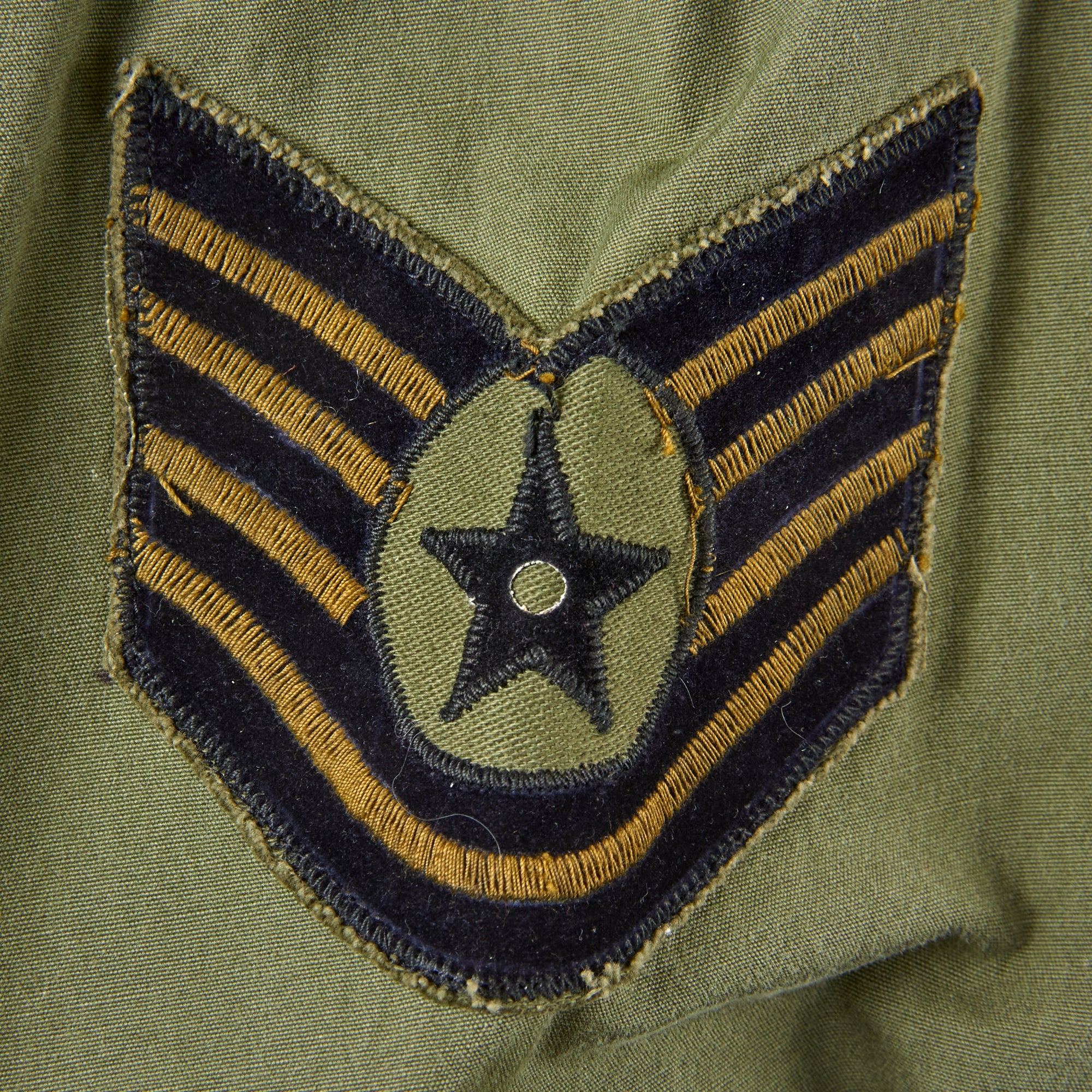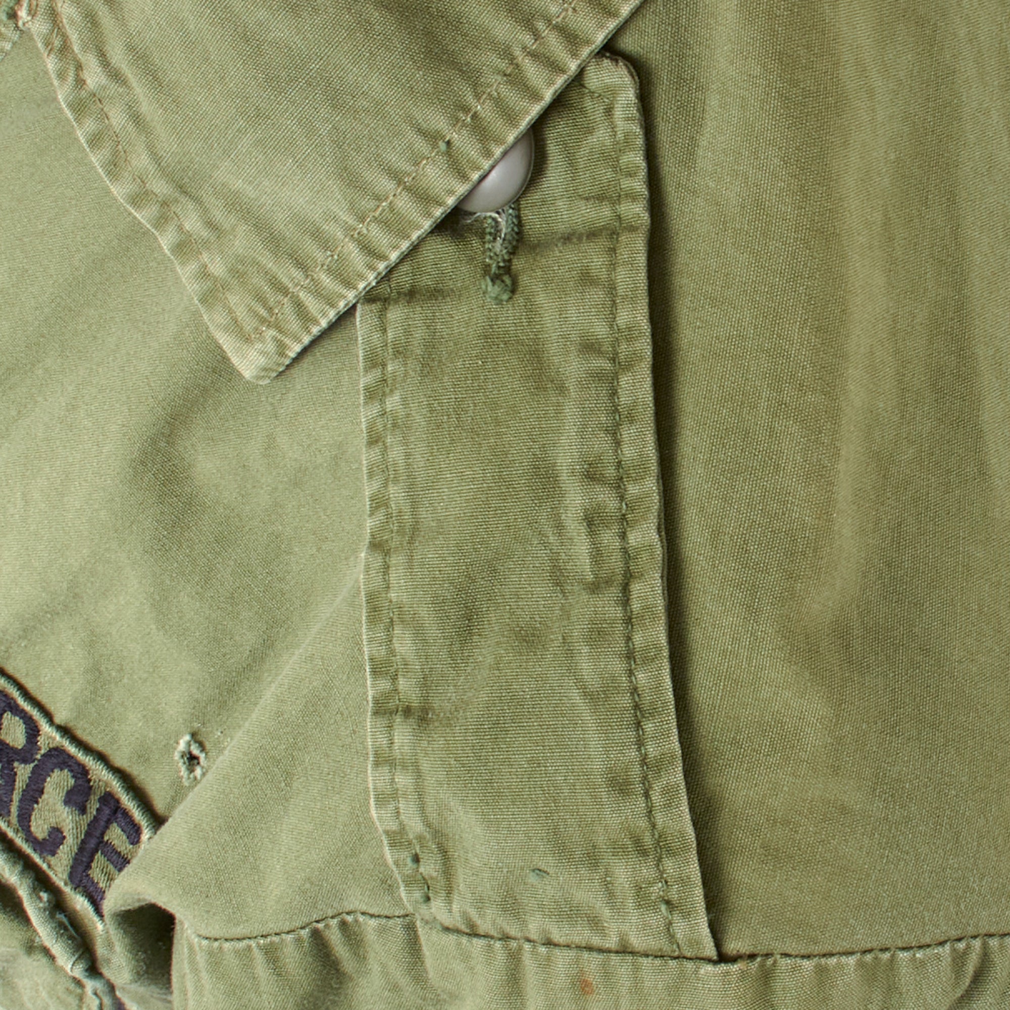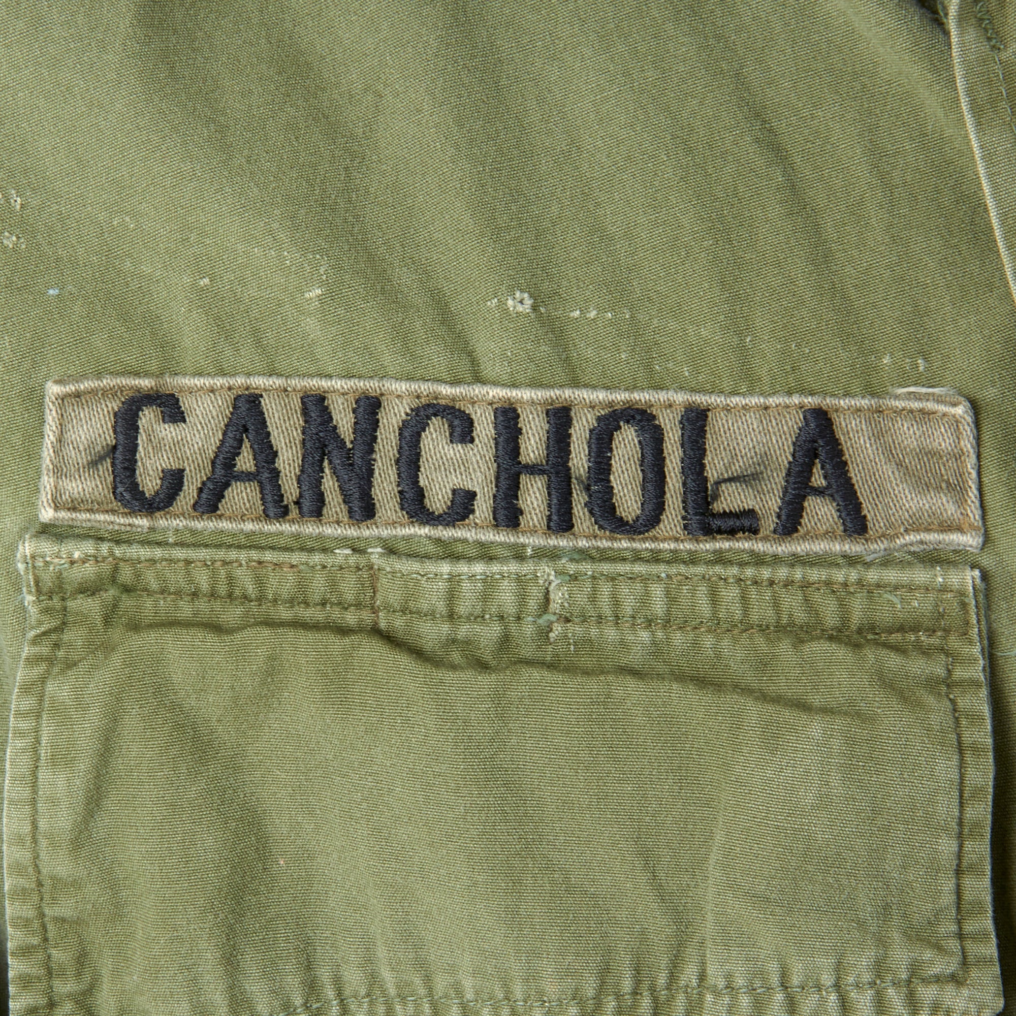 This is a great 2nd Pattern Poplin jungle fatigue shirt with great period-applied “Incountry” Vietnamese-made insignia for the U.S. Air Force Security Police. The shirt has nametapes for the US Air Force and the name CANCHOLA. On the left breast pocket is the insignia of the US Air Force Security Police, and on the sleeves are Air Force ranks for Technical Sergeant.