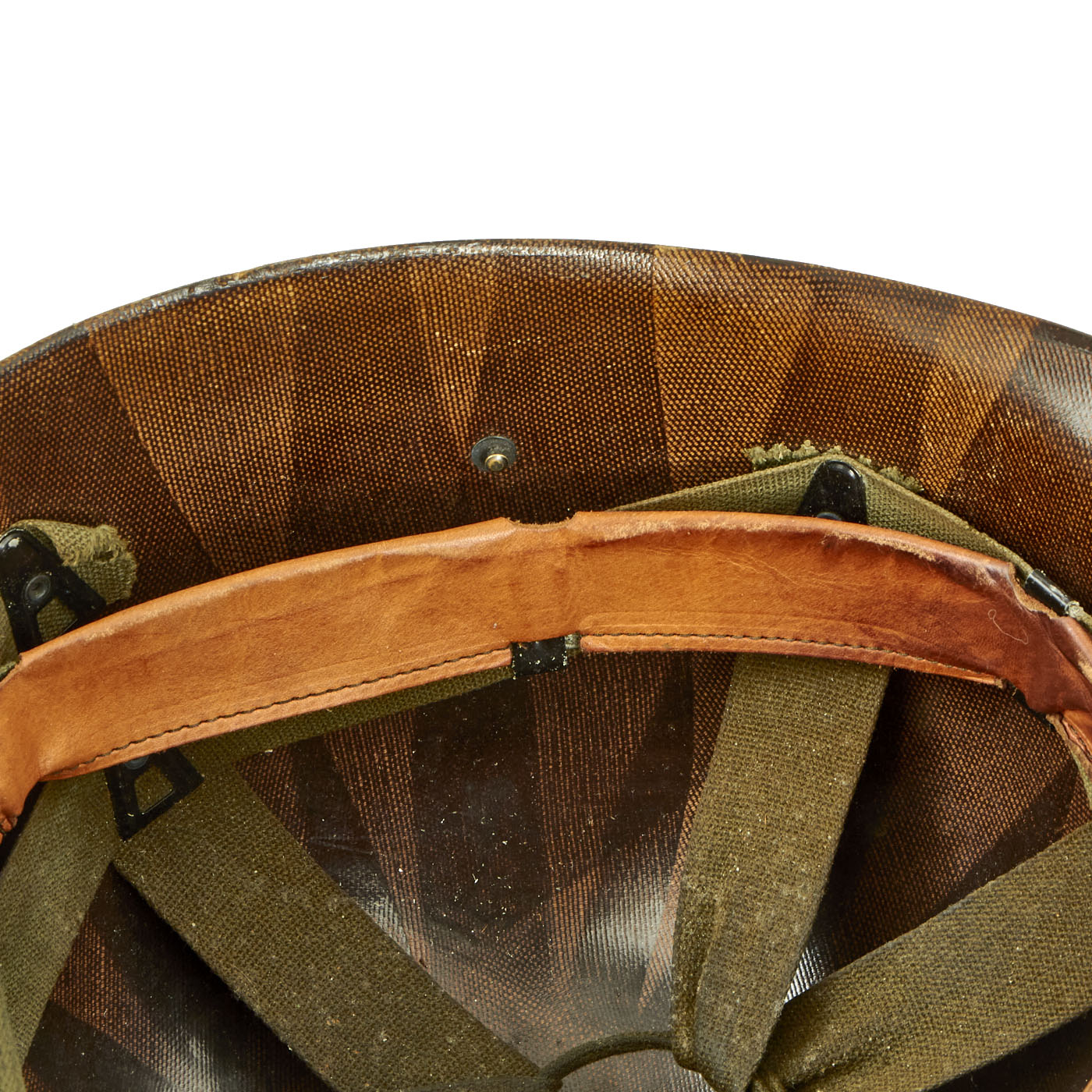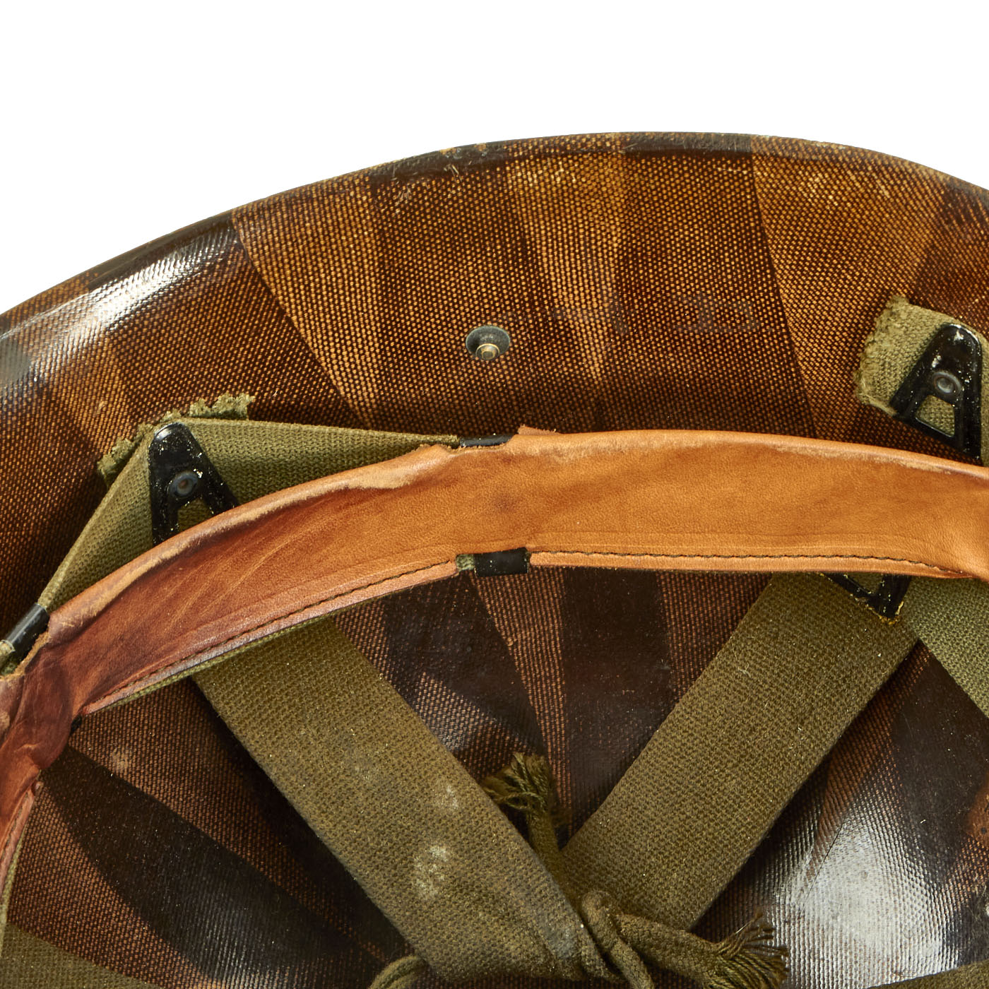 The helmet comes complete with high pressure early Vietnam War era liner, which is stamped with MICARTA 1956 inside the crown. The liner does not have a frontal eyelet, indicating that it is a post Korean war manufacture. A new suspension system for the M1 Helmet Liner was introduced in 1964, however this one still retains the immediate Post Korean war liner and webbing, which is nearly identical to the WWII issue liners.