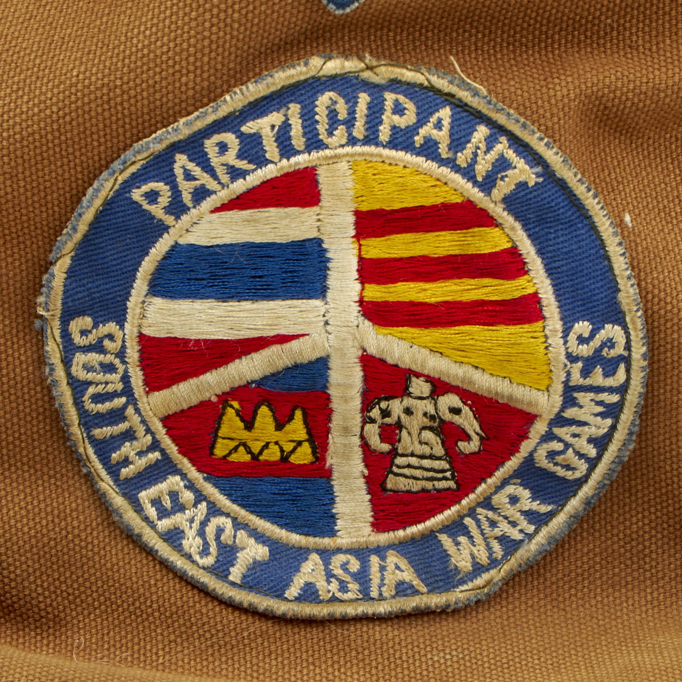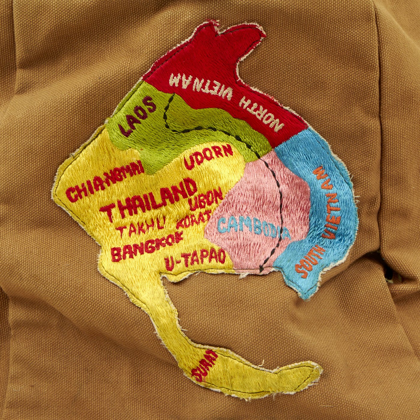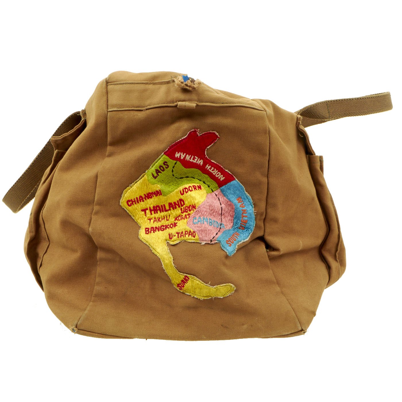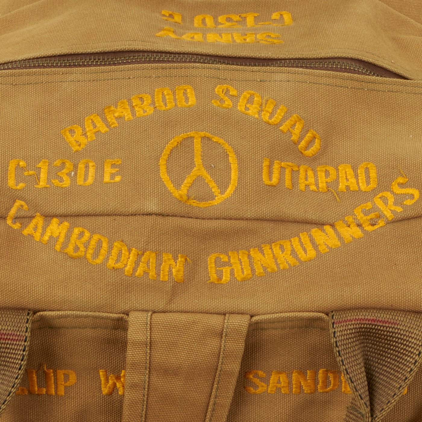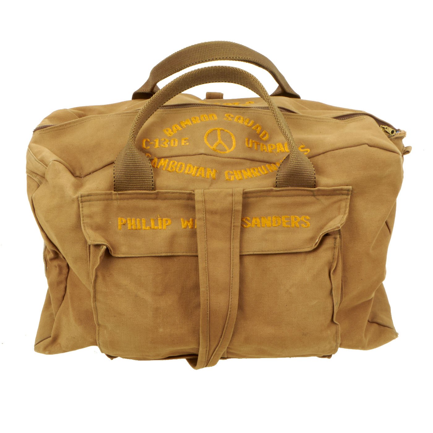 Original Item: Only One Available. Since the early days of warfare, soldiers abroad are always on the hunt for locally made and sourced items to either use or bring home after the war. That was the case for Phillip Wayne Sanders who was either a crewman or a pilot on a C-130E “Hercules” they affectionately named “Sandy”. The crew named themselves the “Bamboo Squad Cambodia Gunrunners”, which is seen embroidered on the top flap of the kit bag, directly across from “SANDY C-130 E” which is also embroidered on the top flap on the opposite side. On both sides of the bag are patches sewn into it. One patch, a rather large one, is of southeast asia with what appears to be the aircraft's flight pattern marked with black stitching going from Cambodia to north Vietnam. The opposite side of the bag has 2 patches. The top patch looks like a locally made patch in the shape of a shield with a cobra wrapped around Thailand, with U-Tapao marked in red. Below the shield patch is a circular patch with a peace sign in the middle with multiple flags in each space of the sign. Around the border, in white lettering, “Participant, South East Asia War Games” is embroidered. On the front facing portion of the bag, above the pocket on the pocket flap, Phillip Wayne Sanders who we assume is the name of the crewman who utilized this bag, is embroidered.