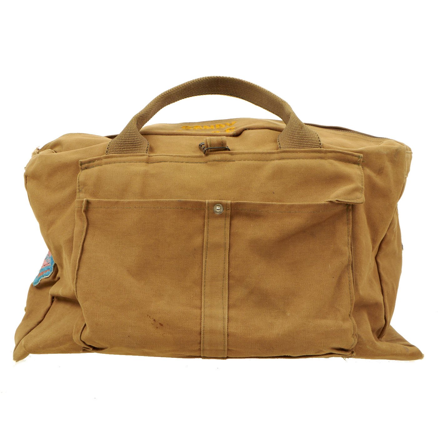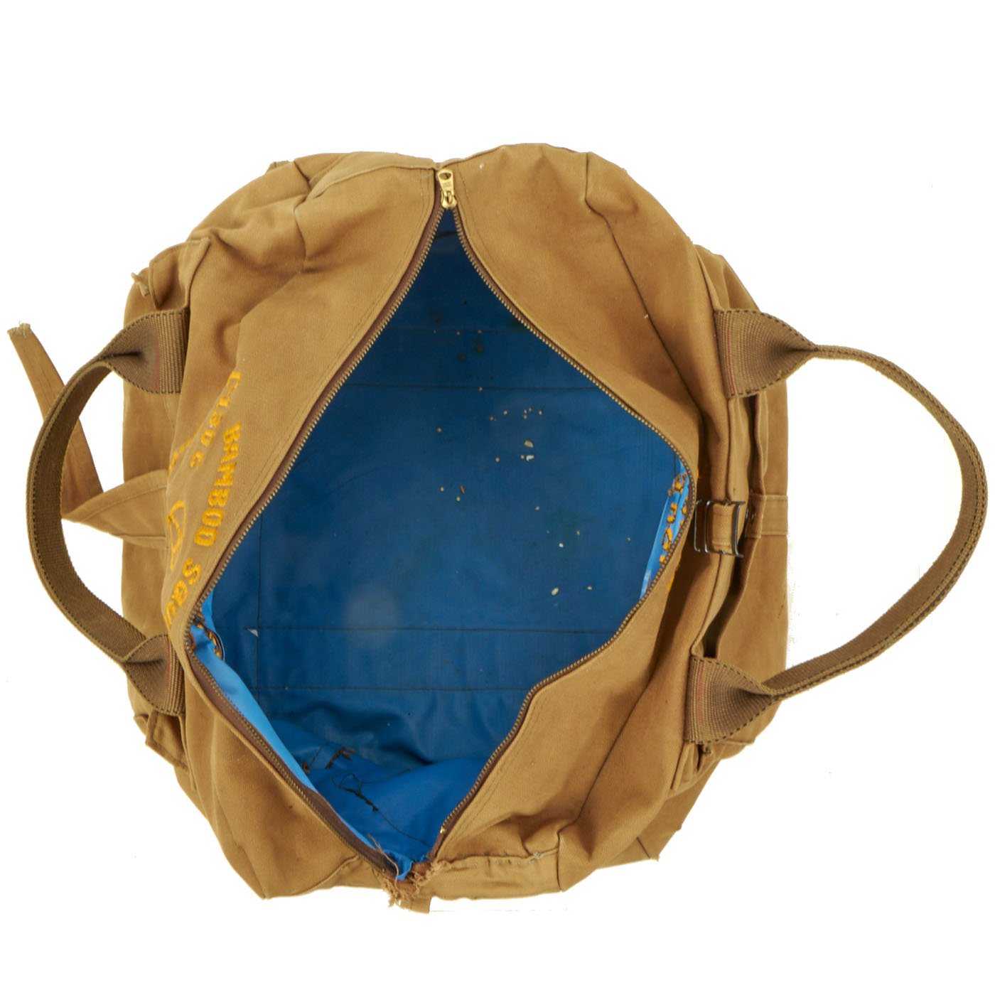 The condition of the bag shows signs of being used heavily. The color of the canvas has faded slightly, the yellow of the embroidery is slightly darkened due to age and use, the patches are still colorful and easily identifiable. The stitching on some of the seams is starting to come loose but appears to still be solid in construction. The only damage to be seen is a portion of the fabric where the zipper position would be if the bag was zipped shut, there's fraying in that location. The only other “damage” would be that the top cinch strap was shortened and stitched to help prevent further fraying of the cut end.