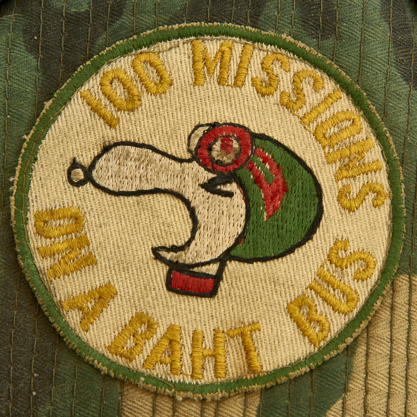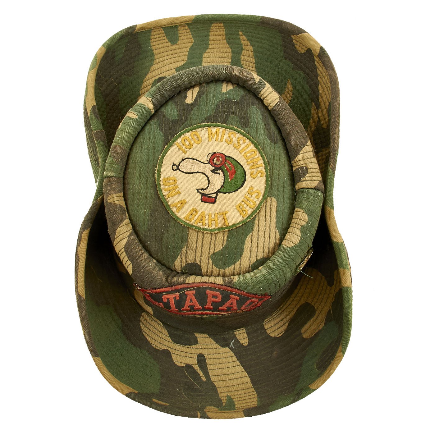 The top of the cap bears a souvenir patch with the Peanuts character "Snoopy" in the middle, wearing a flight cap. The "100 Missions in a Baht Bus" patch is an unofficial joke novelty patch, referring to the bus that could take soldiers into town at Korat RTAFB, another airfield in Thailand in use by the U.S. Air Force. The bus cost 1 or 2 "Baht", the Thai currency, and the road for the bus was at the end of the airfield. For pilots and air crew, 100 missions would be 100 missions "Over the Baht Bus." Ground crew then would wear this somewhat whimsical patch indicating 100 trips on the local bus. This patch made fun of boring but necessary administrative duties assigned to some aircrew. A great piece of Vietnam War Memorabilia.