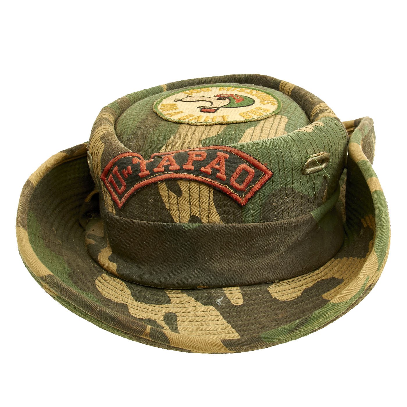 This cap is typical of the souvenir caps brought back from the Vietnam war theater, and has a patch on the front of the cap reading U - TAPAO, for the U-Tapao Royal Thai Navy Airfield in Thailand. The U.S. Air Force 4258th Strategic Wing, which was redesignated the 307th Strategic Wing in 1970, launched attacks over Cambodia and Laos as part of the war from the airfield.