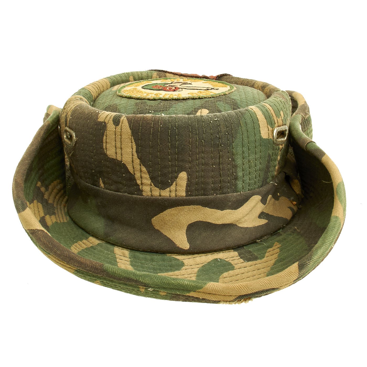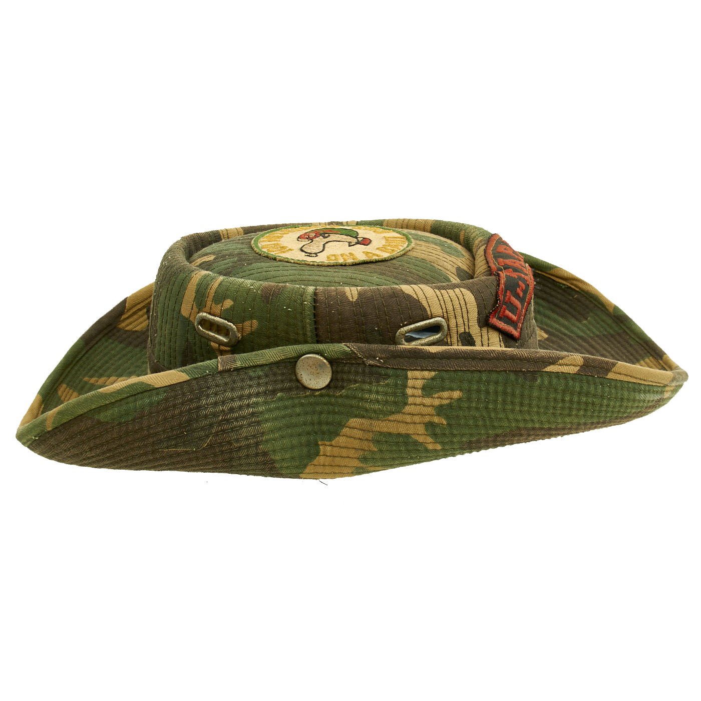 Original Item: Only One Available. This is a rare "in country" made Vietnam War boonie hat, often called a bush hat. There have been various designs over the years, but all have the same basic shape, with a wide brim, which in some designs have snaps over one or both ears to fold up the flaps for a different look.