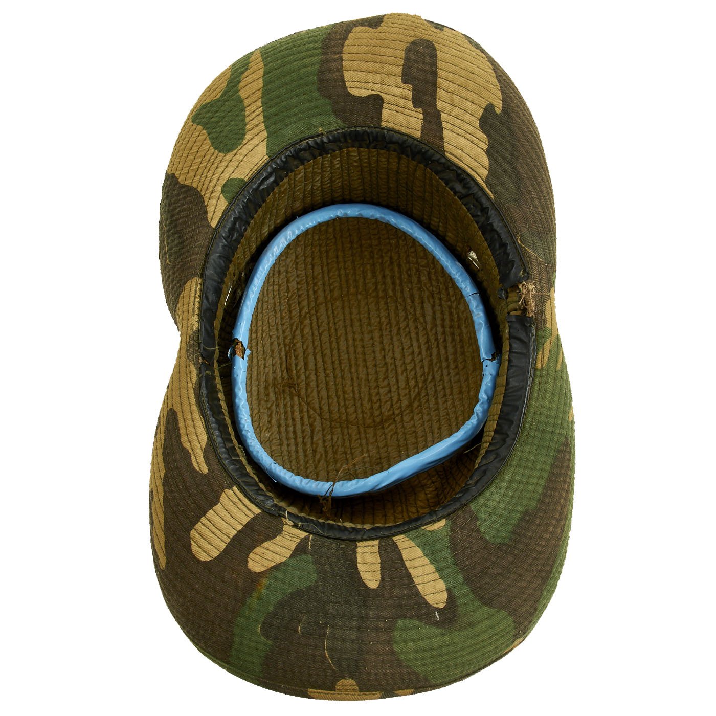 The cap itself is a lovely camouflage color, and has four vents on the crown, with both sides having snaps to hold up the brim. The size seems to be around 7 / 56 cm, but the cap has gotten stiff over the years, as plastic seems to have been used in the construction.
