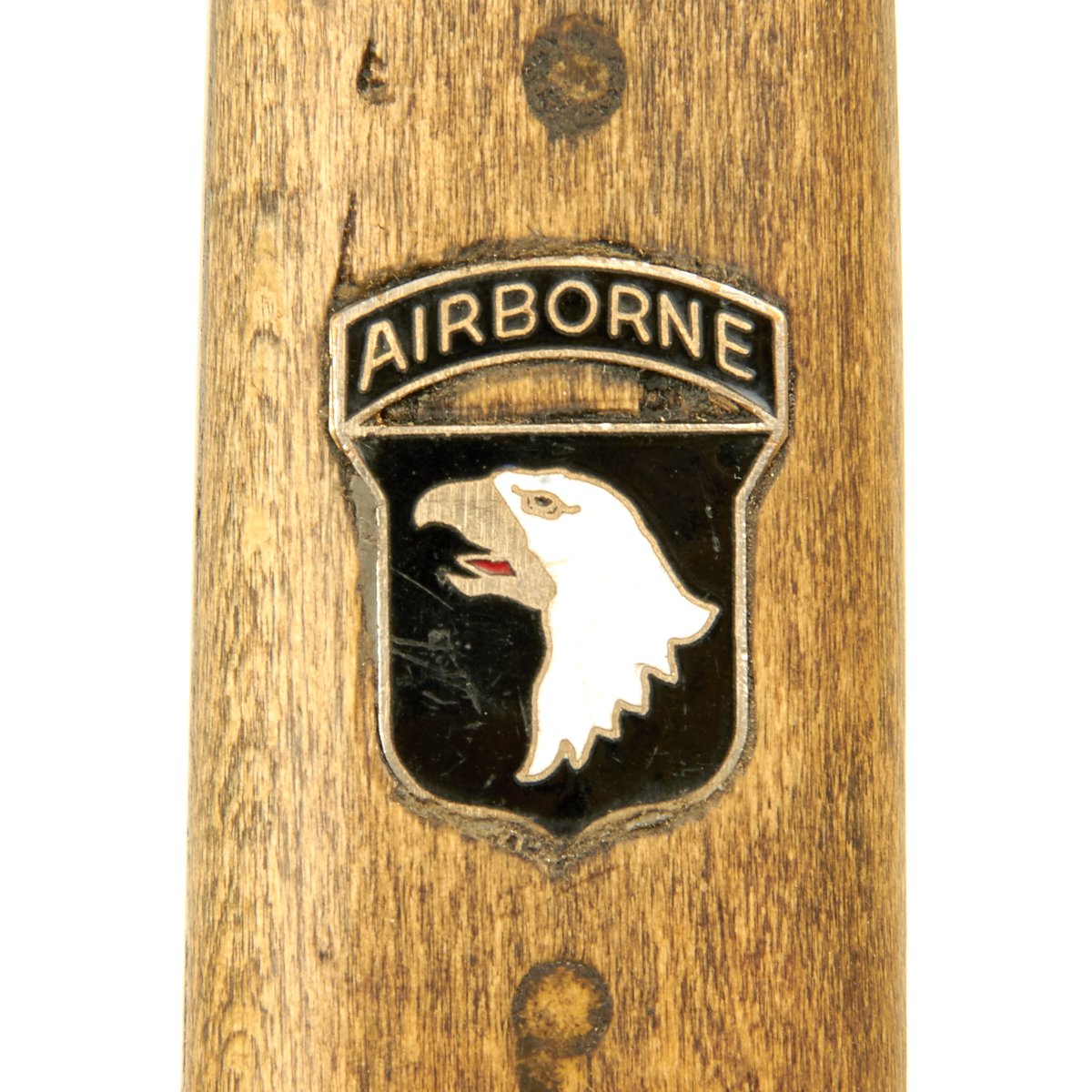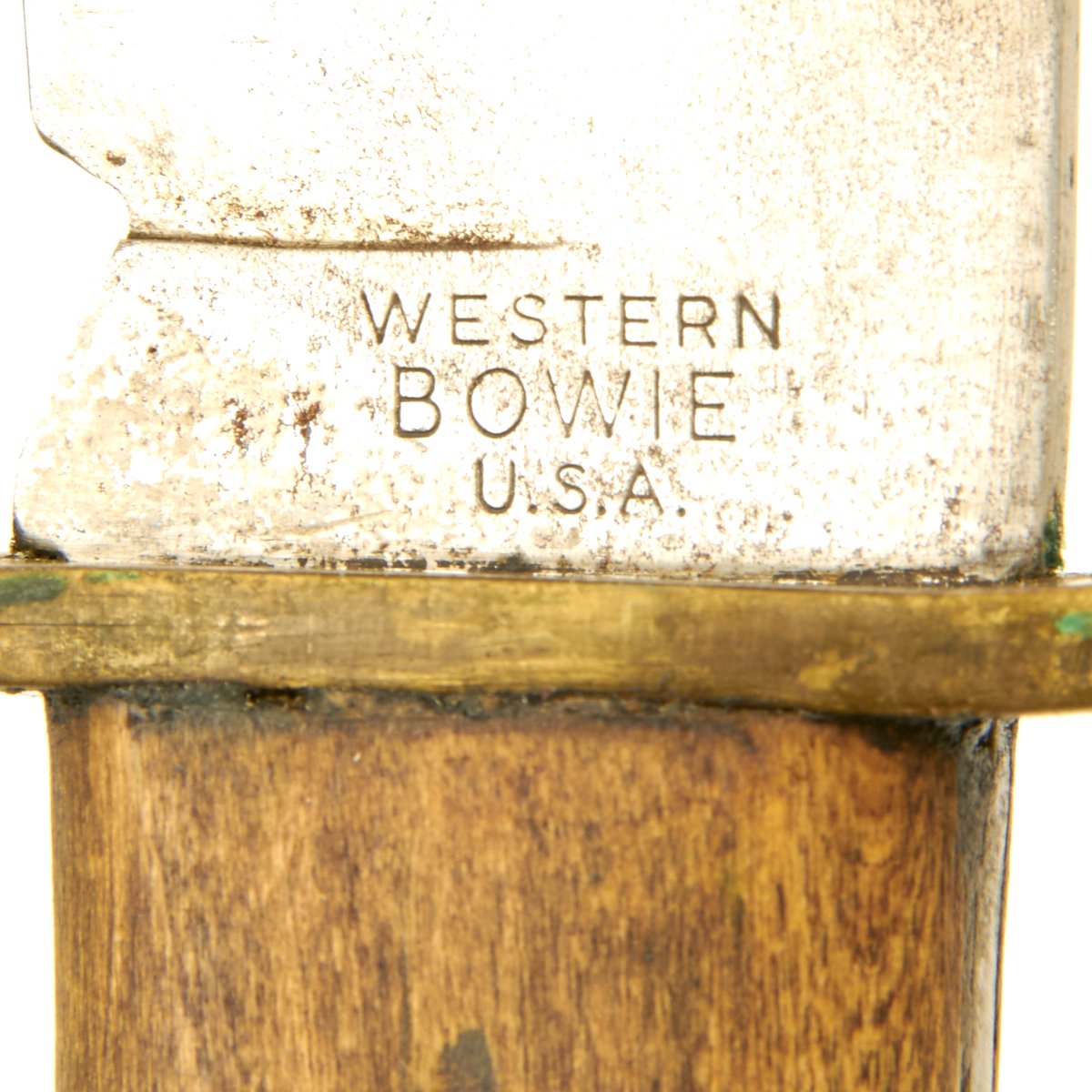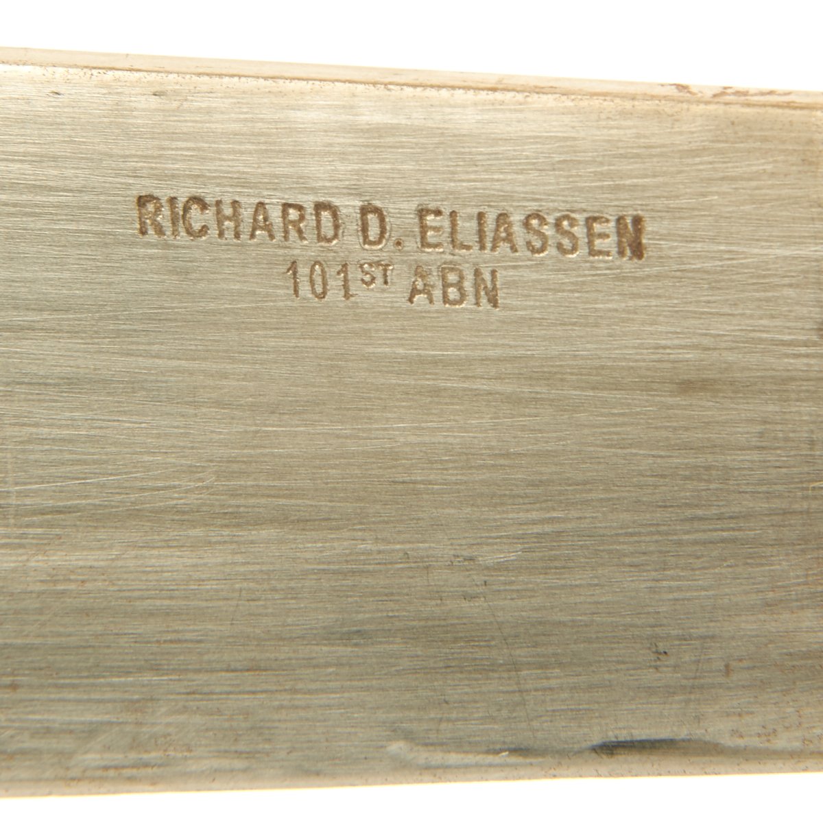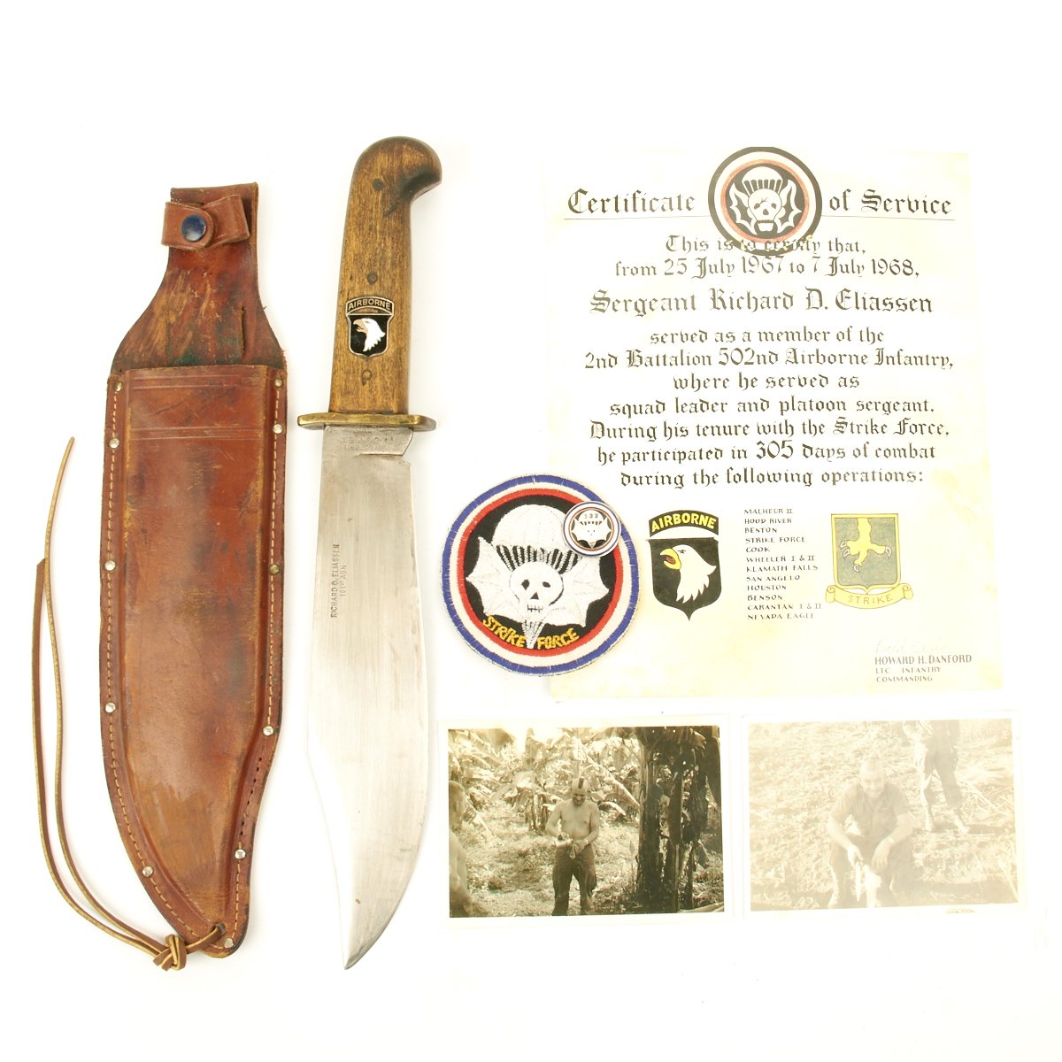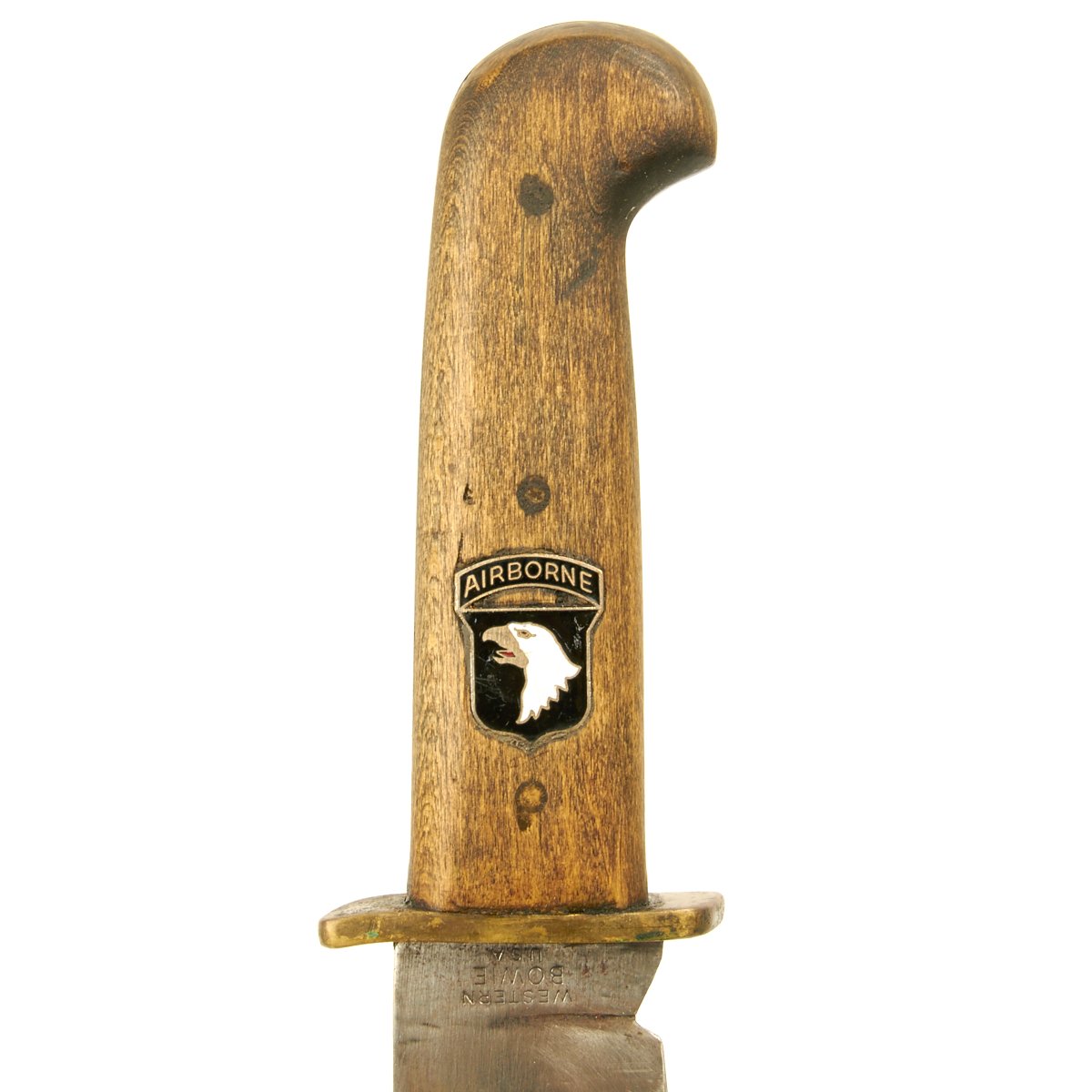 - Original Western Bowie USA knife with 101st Airborne insignia embedded in grip. 9.25 inch blade, 14.5 inches overall length. RICHARD D. ELIASSEN 10st ABN engraved into blade.