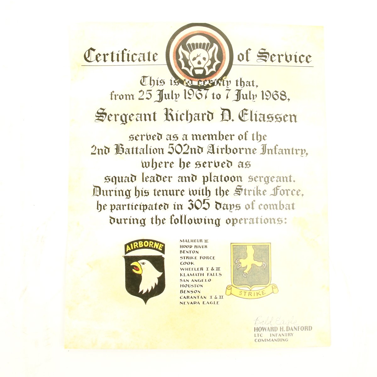 Original Item: One-of-a-kind set. This is a fantastic grouping that belonged Sergeant Richard D. Eliassen who served as a member of 502nd Airborne Infantry Regiment where he served as squad leader and platoon sergeant. During his tenure with the Strike Force, he participated in 305 days of combat (July 1976- July 1968) during the following operations: