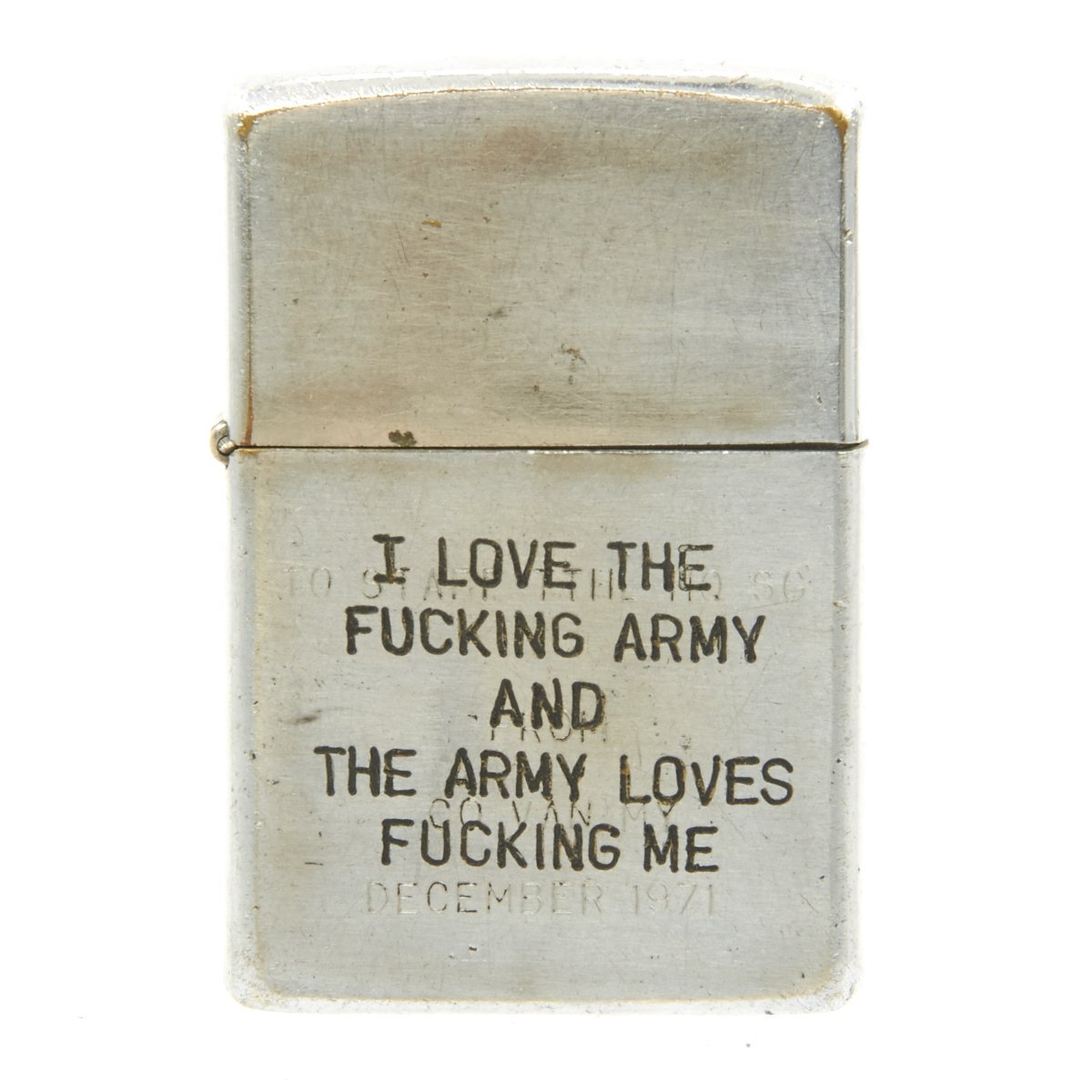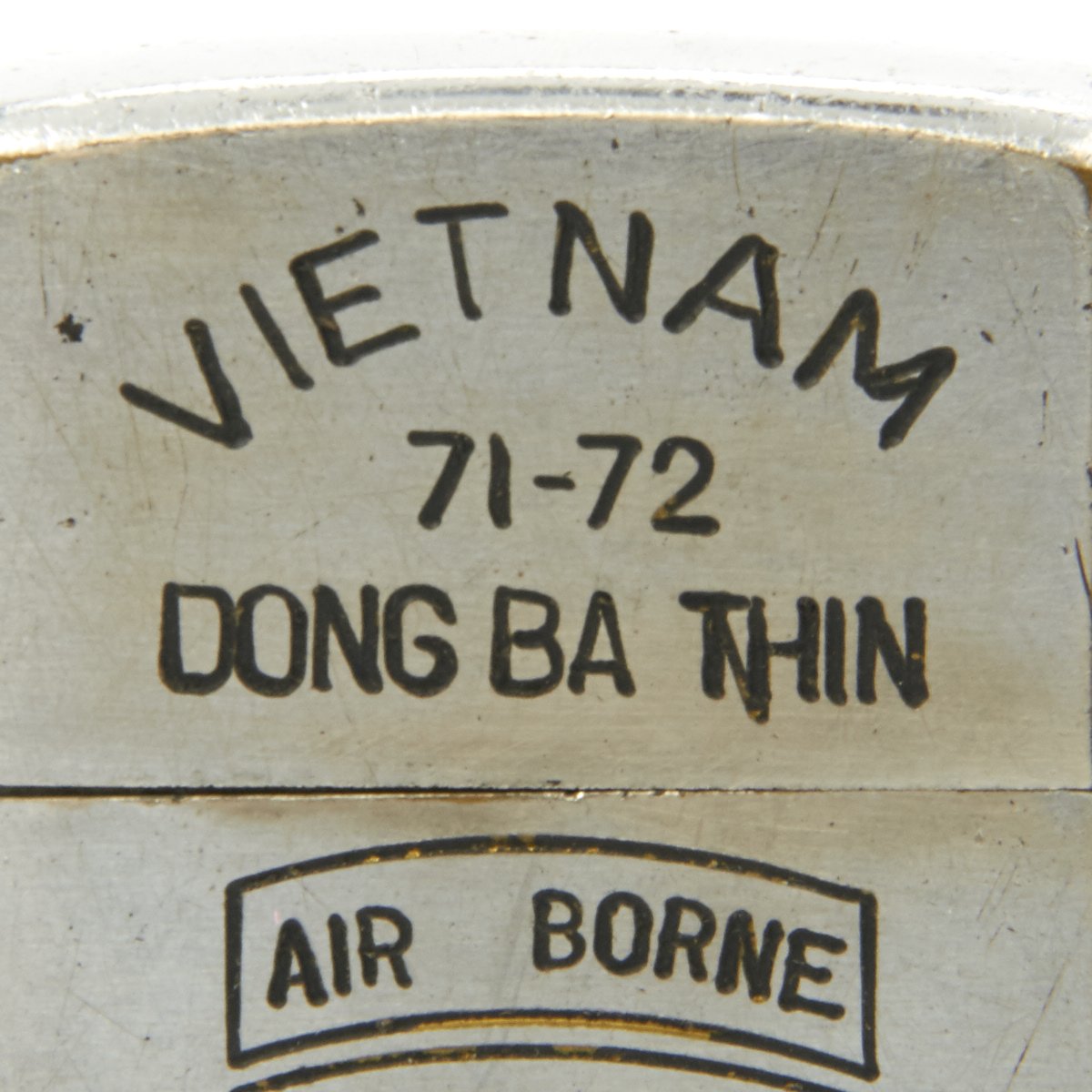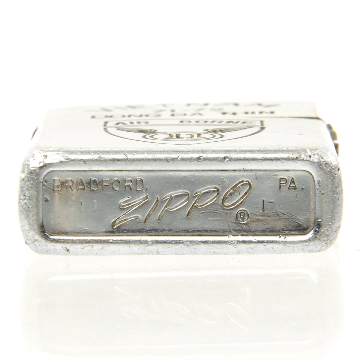 A note on how to verify that this is an authentic VIETNAM era zippo lighter- To determine a ZIPPO's with correct date marks (before 1975) check the zippo date according to the dating card supplied by the zippo firm. For the years between 1966 and 1975 (Vietnam war ended in April 1975) the codes are: four vertical bars each side of the italicized zippo logo for 1966. Then the bars were removed alternatively first on the right and then on the left. So for 1967 four bars on the left and three on the right, three each side for 1968 and so one until 1973 last year with vertical bar coding. Lighters from 1973 have one bar on the left and nothing on the right. In 1974, the code marks turn to slashes; four slashes on each side of the italicized zippo logo and in 1975 only three slashes on the right part.