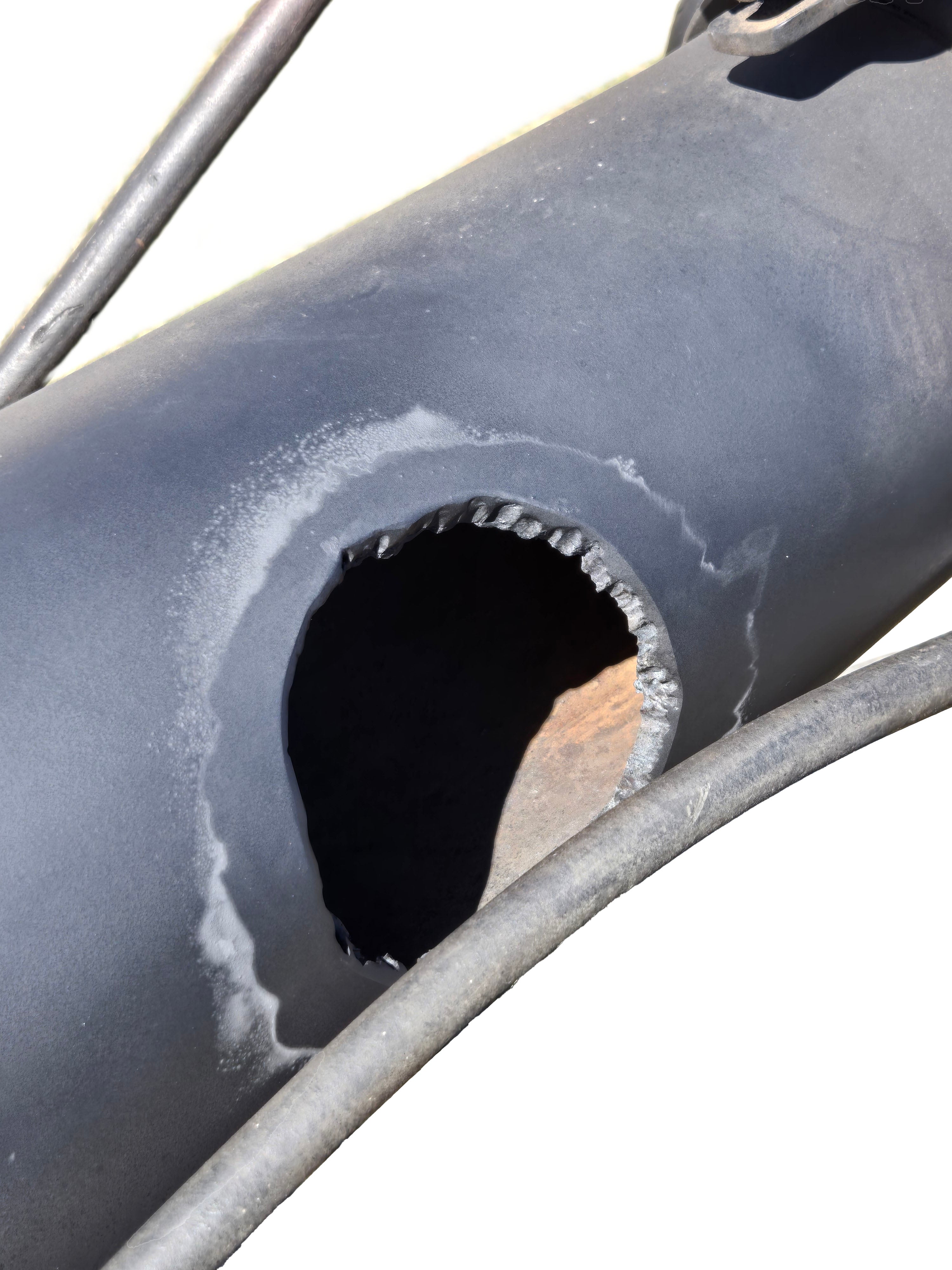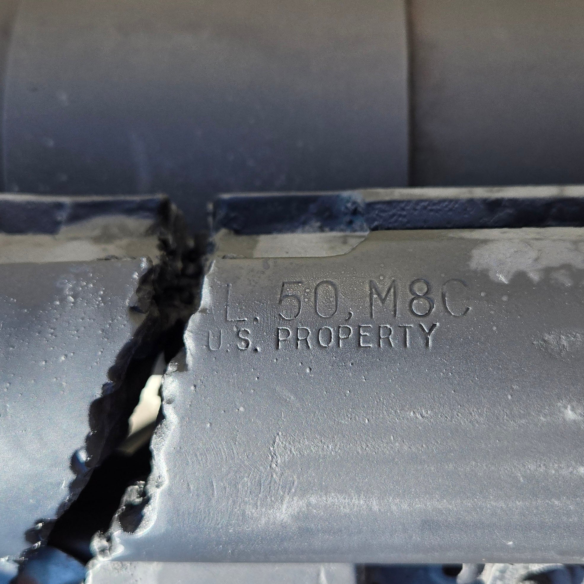 The M40A2 recoilless rifle has had two bore width holes cut through the side of the barrel, and steel cross pin welded across the bore to prevent loading. The rear breech is incomplete, and all firing mechanisms removed and/or deactivated. The levers to open and close the breech are missing, as are the trigger mechanisms. The M8C .50cal Spotting Rifle has had the receiver section angle cut completely through with a flame torch, removing at least 1/4" of material with each cut, and was left in place on the top of the recoilless rifle. Not Available for Export.
