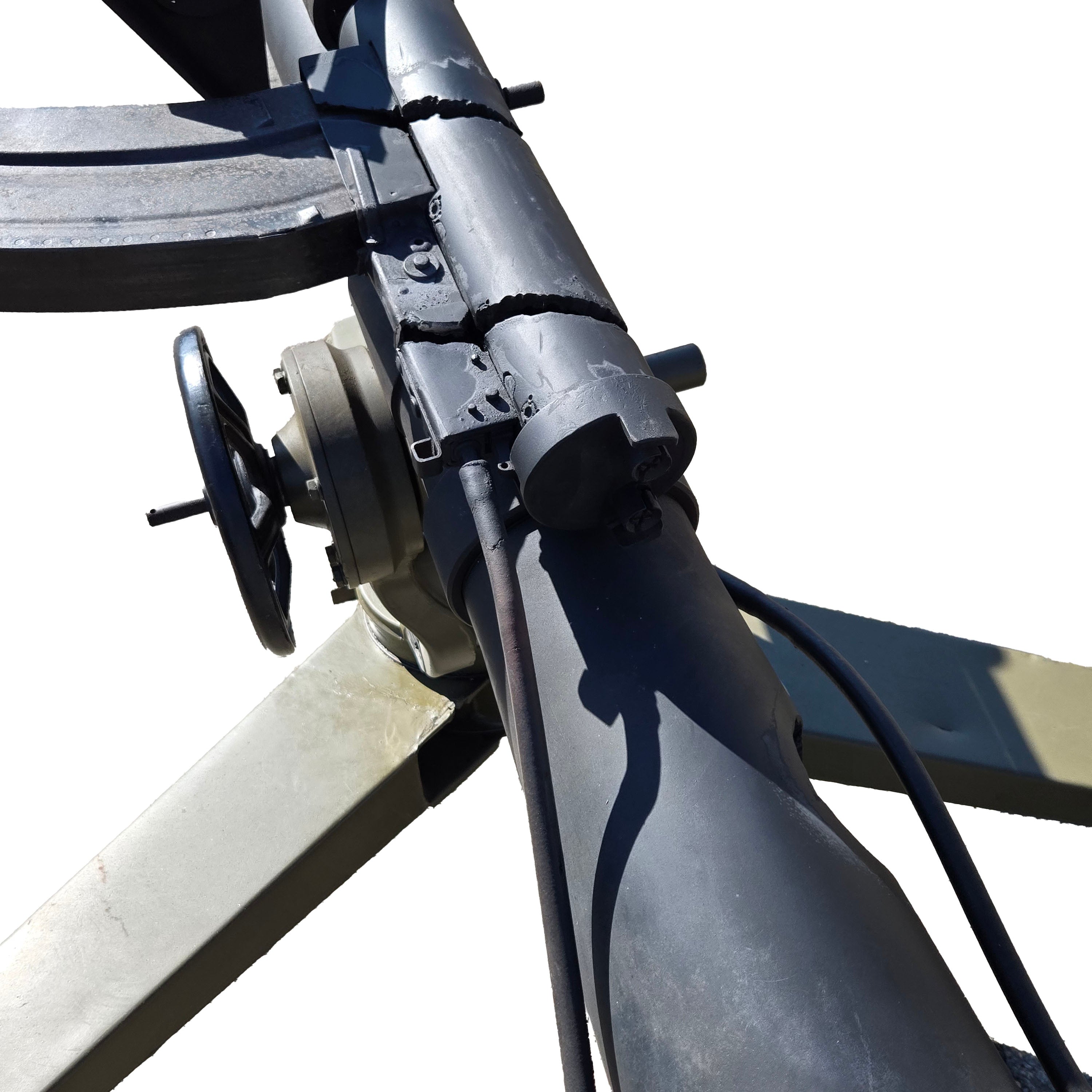 The M40 is shaped like a long tube with an M8C .50 cal spotting rifle above. The spotting rifle fires a round whose trajectory closely matches that of the 105 mm round and gives off a puff of smoke on impact with the target. On the left side, there is an elevating wheel, in the center of which is the trigger wheel used to fine adjust the elevation and at the same time firing the spotting rifle when pulled, and the gun when pushed. The mounting is a tripod, but the front leg has a castering wheel. On top of the mount is a traverse wheel. On the center of the traverse wheel is a locking wheel, when the wheel is down, the rifle is locked in traverse, and can only be moved right and left with the traverse wheel. When the wheel is raised, the rifle can be traversed by hand. Austria produced a two-wheeled mount for the M40.
