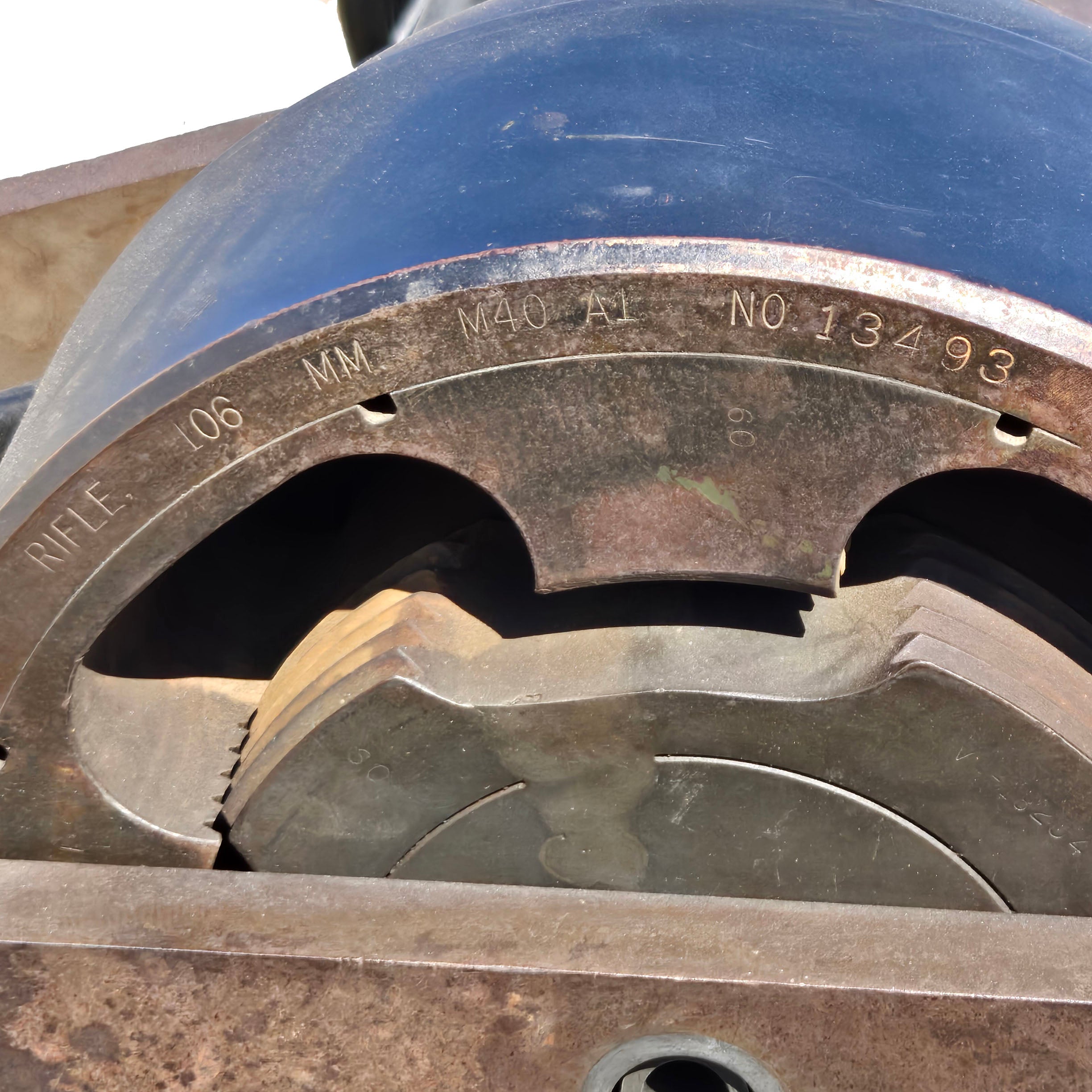 Of note is that the M40 series actually did have a bore of 105mm, however to avoid confusion with the ammunition from the failed 105mm M27 Recoilless rifle, they were marked 106mm. The spotting rifle also still has a partial [CA]L. 50, M8C / U.S. PROPERTY marking, with part removed by one of the flame cuts. The tripod itself still bears an original aluminum data plate, which reads as gives the model, serial number, and inspection date:-