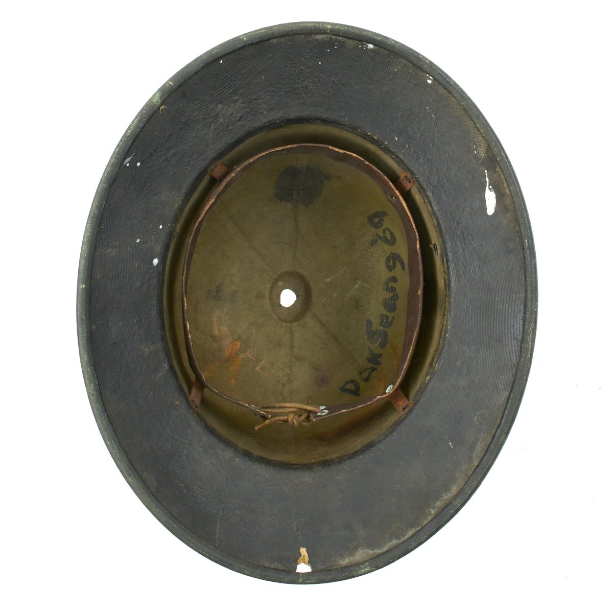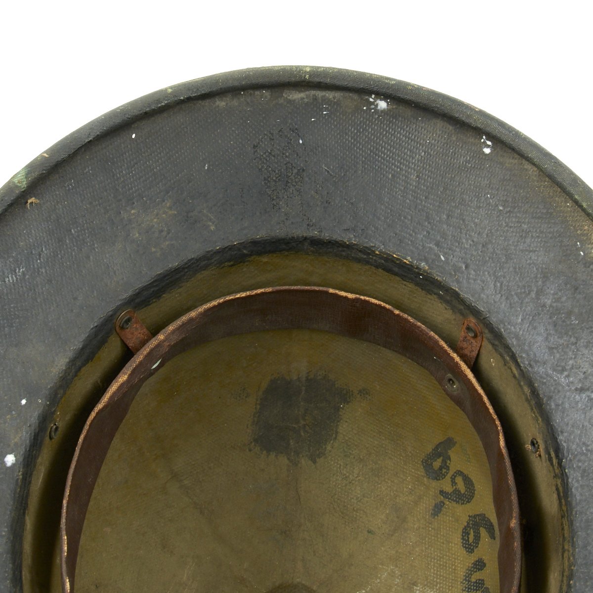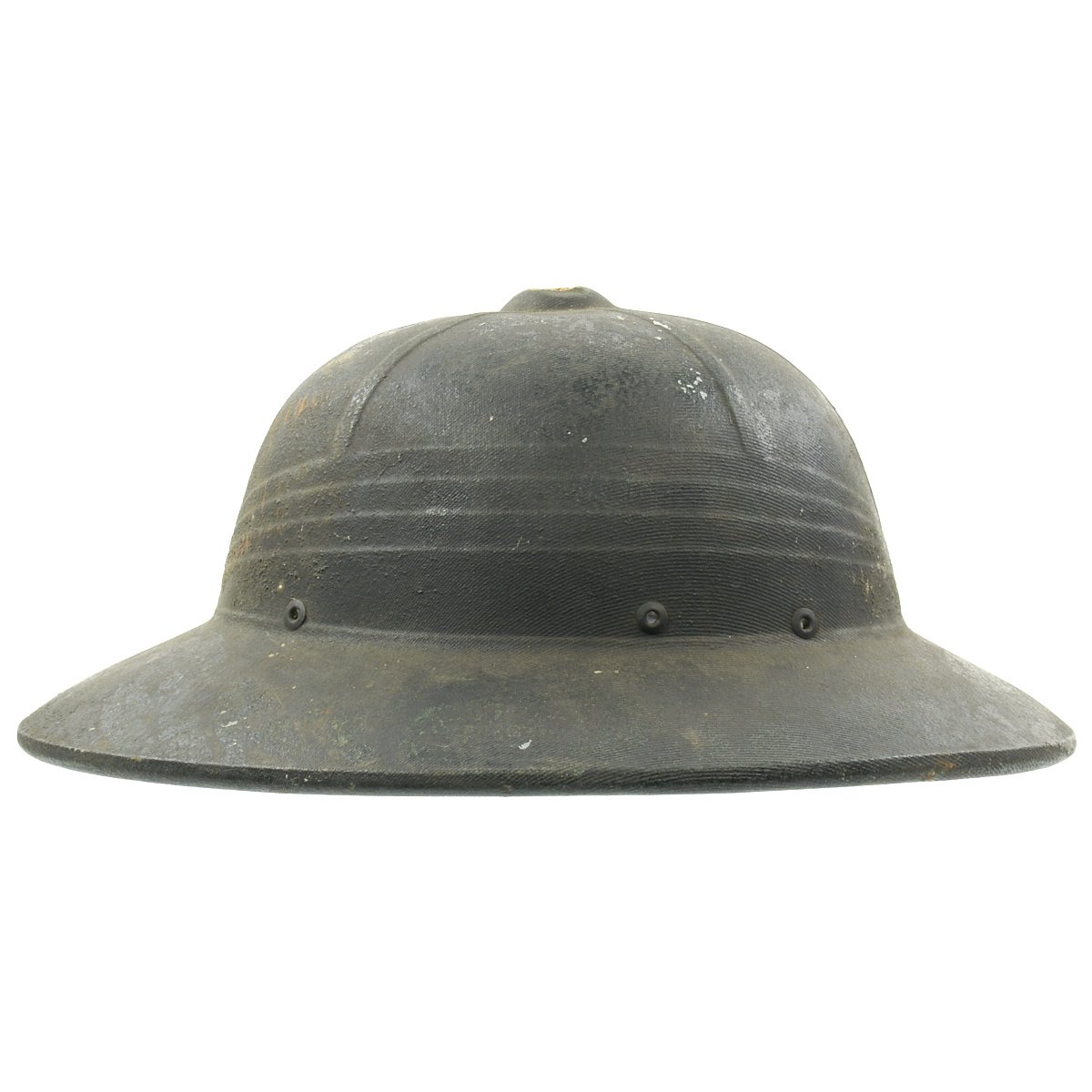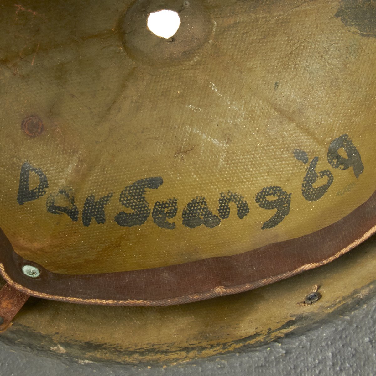 Original Item: One-of-a-kind. This is a Vietnam War Era 1960s pressed fiber helmet produced in dark green.This model of fiber helmets was originally used by the US Navy. A white version of this helmet was used by the Military Police Corps in tropical regions.This example has been painted black and on the interior was painted Dak Seang '69. It retains the original suspended liner sweatband but is missing the chinstrap. Overall condition is good but it has a hole at the crown and a small hole in the back of the brim which appears to have been used for carrying it hanging off a belt or on a lanyard.