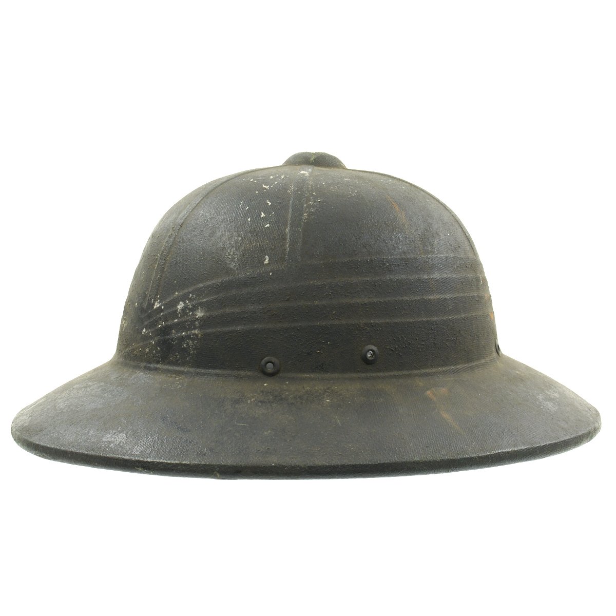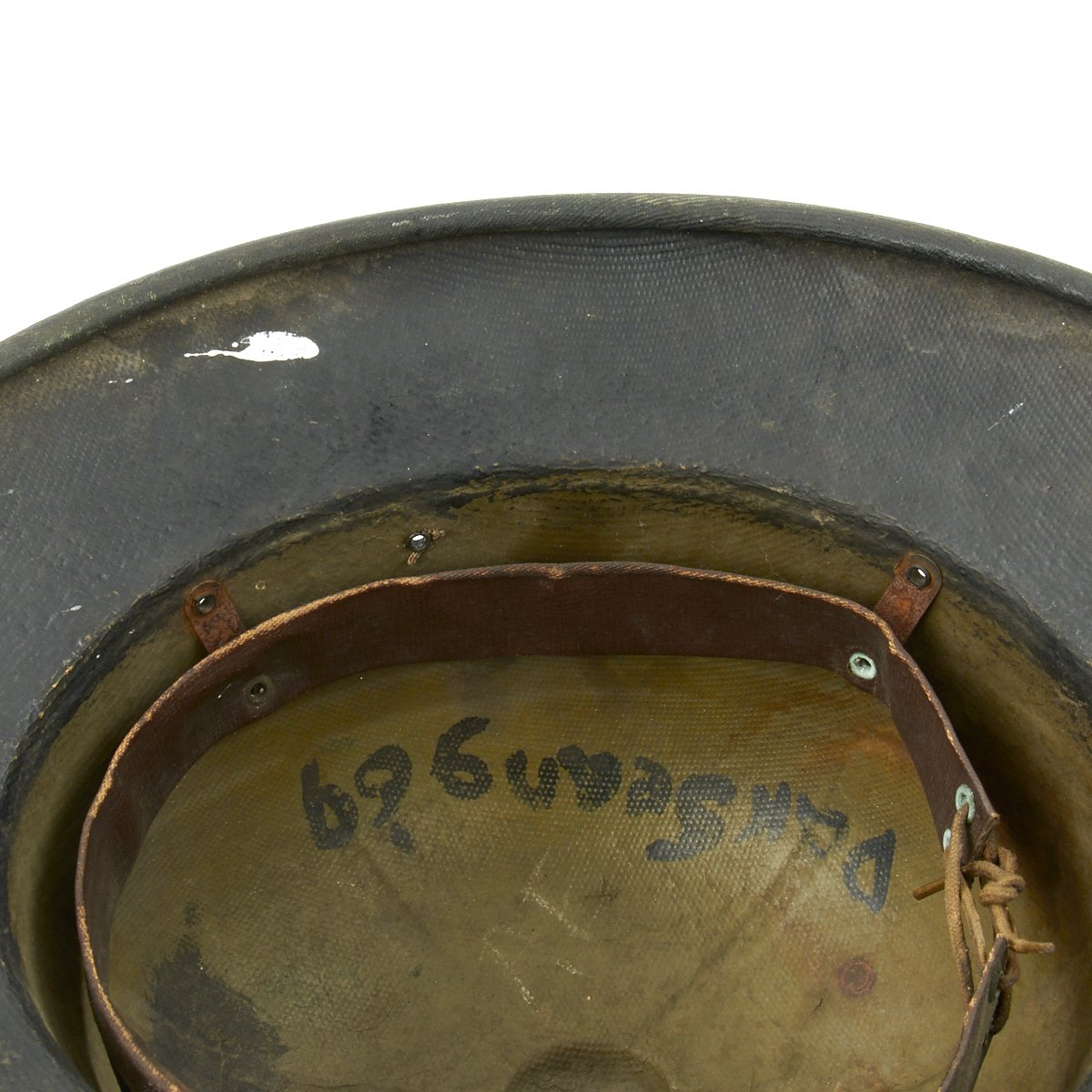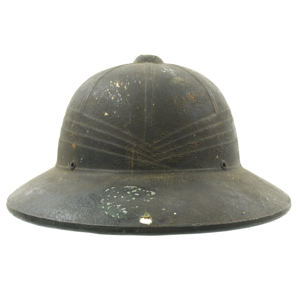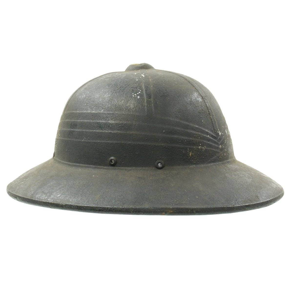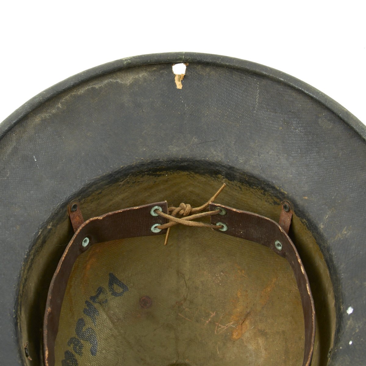 Original Item: One-of-a-kind. This is a Vietnam War Era 1960s pressed fiber helmet produced in dark green.This model of fiber helmets was originally used by the US Navy. A white version of this helmet was used by the Military Police Corps in tropical regions.This example has been painted black and on the interior was painted Dak Seang '69. It retains the original suspended liner sweatband but is missing the chinstrap. Overall condition is good but it has a hole at the crown and a small hole in the back of the brim which appears to have been used for carrying it hanging off a belt or on a lanyard.