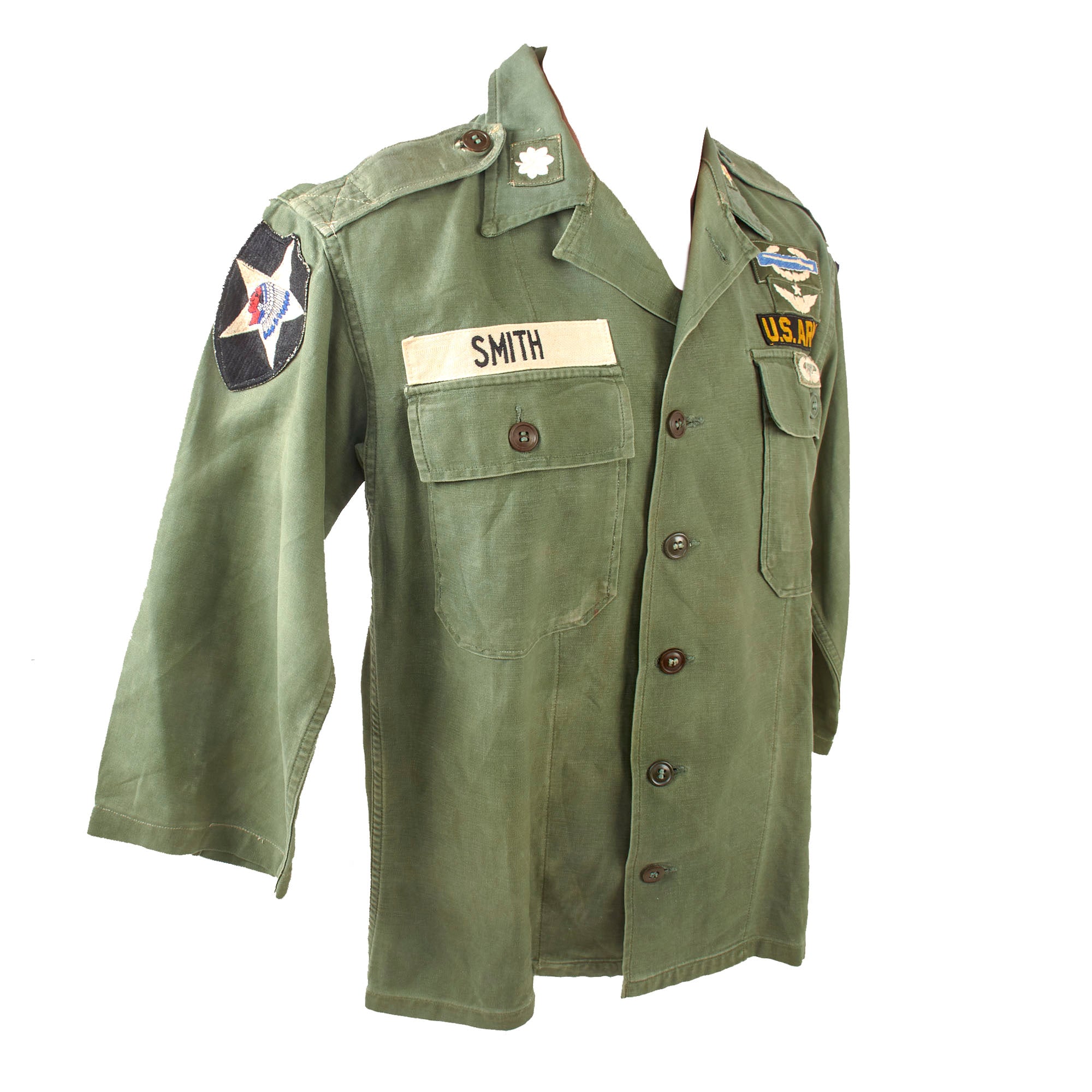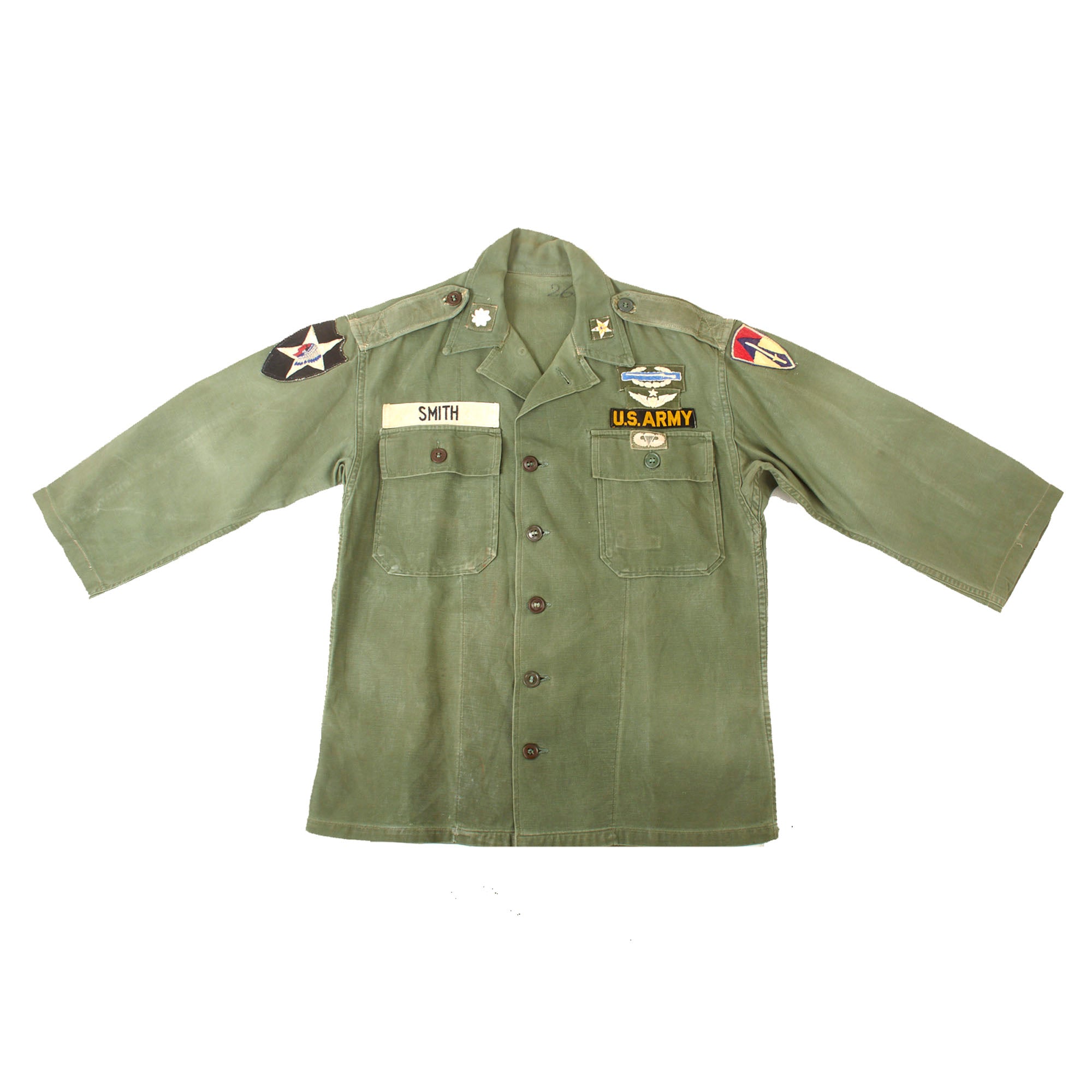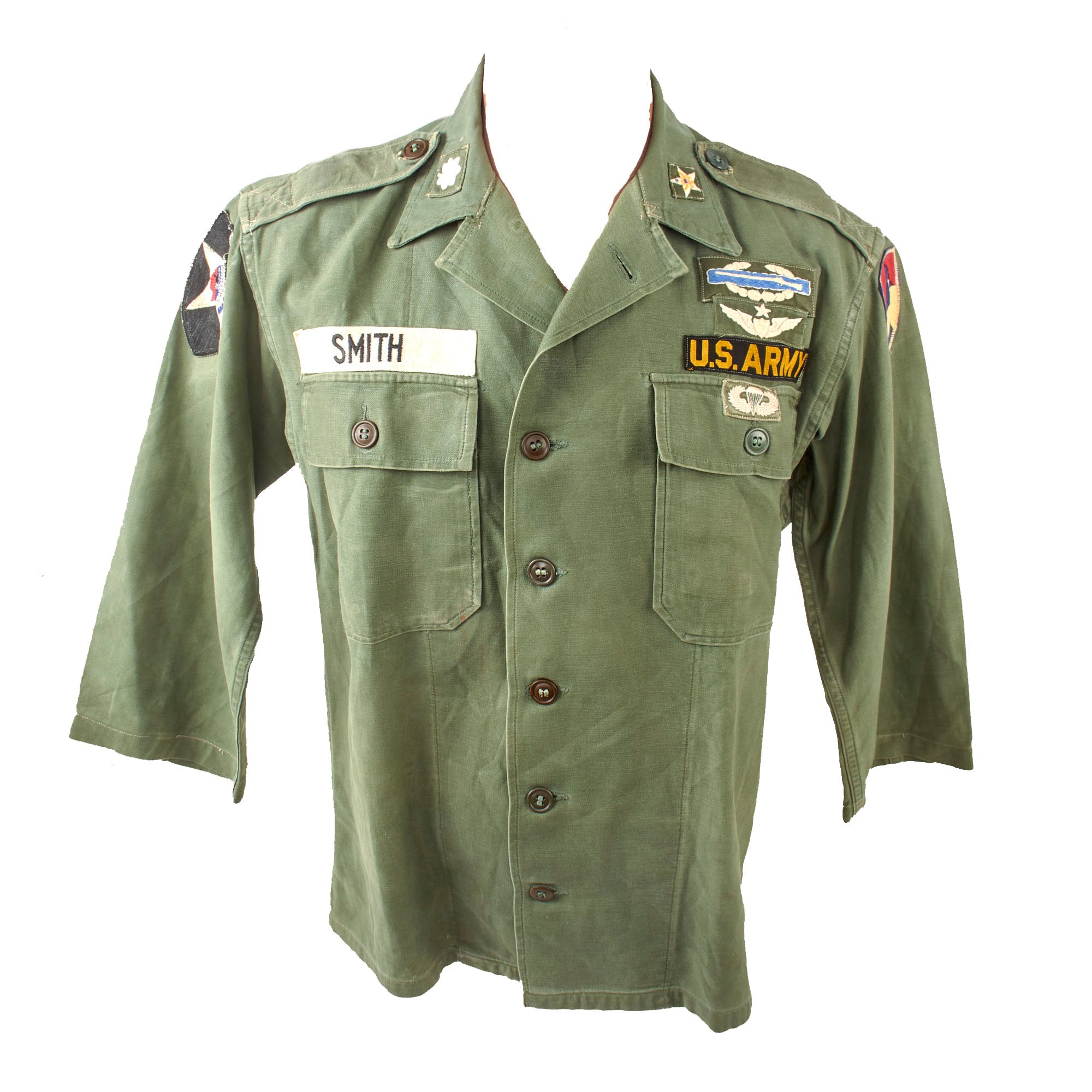 The shirt has a US Army nametape and “SMITH” last name tape, a theater-made 1st Field Force patch on the left shoulder, and a 2nd Infantry Division patch on the right shoulder. There is a Lieutenant colonel rank patch and star patch on the collar. There is a cloth CBI over a set of Master Pilot wings, and under the US Army tape is a cloth set of Paratrooper wings.