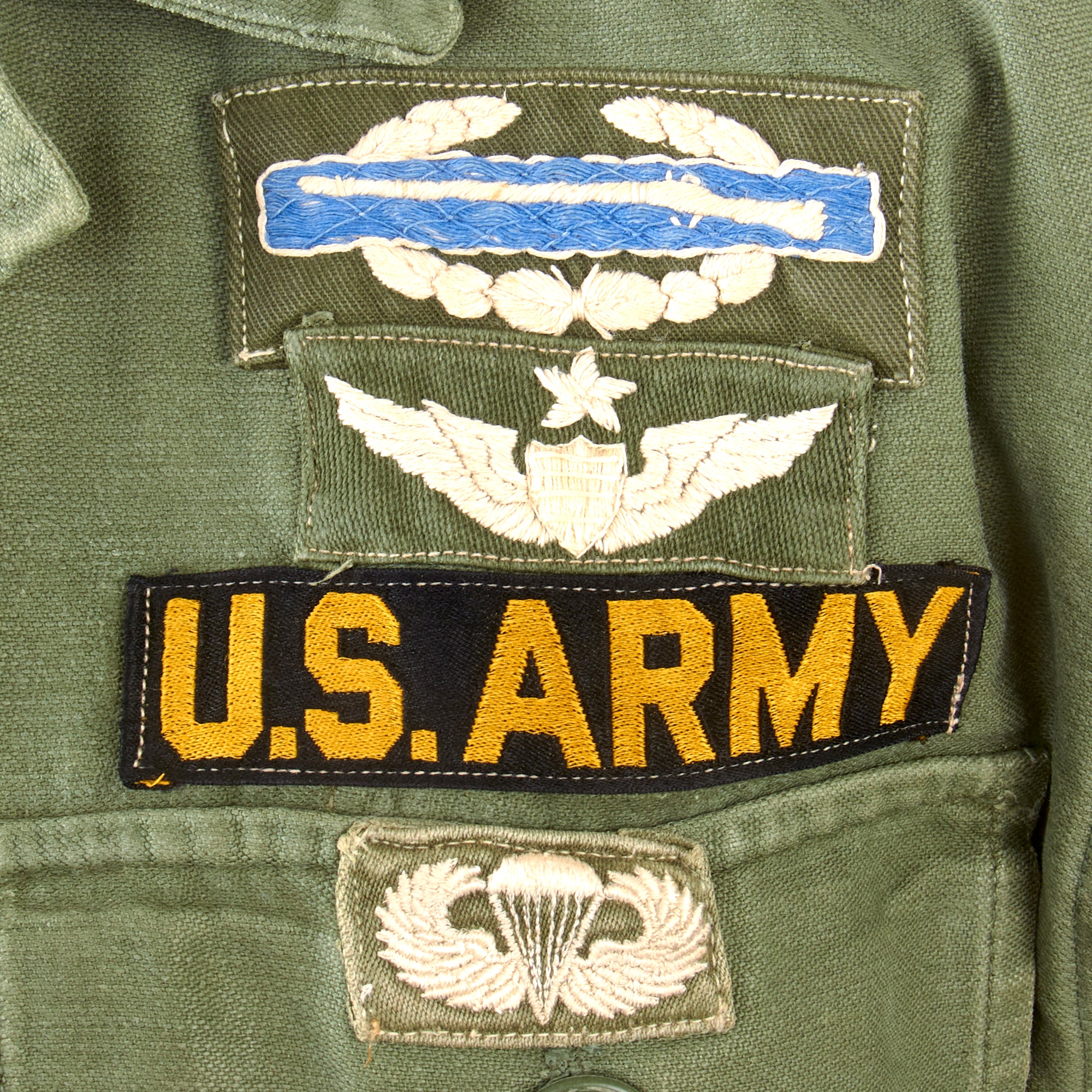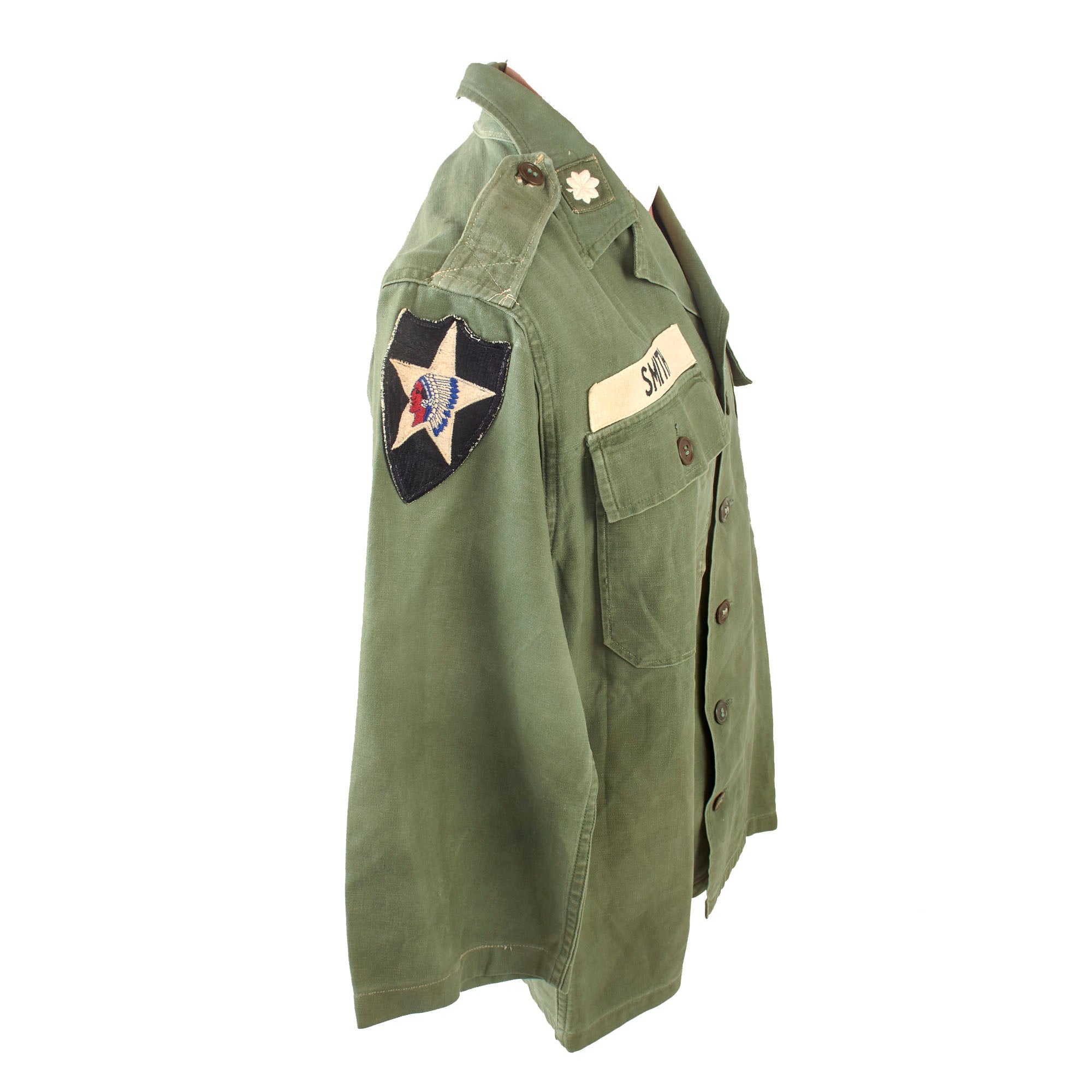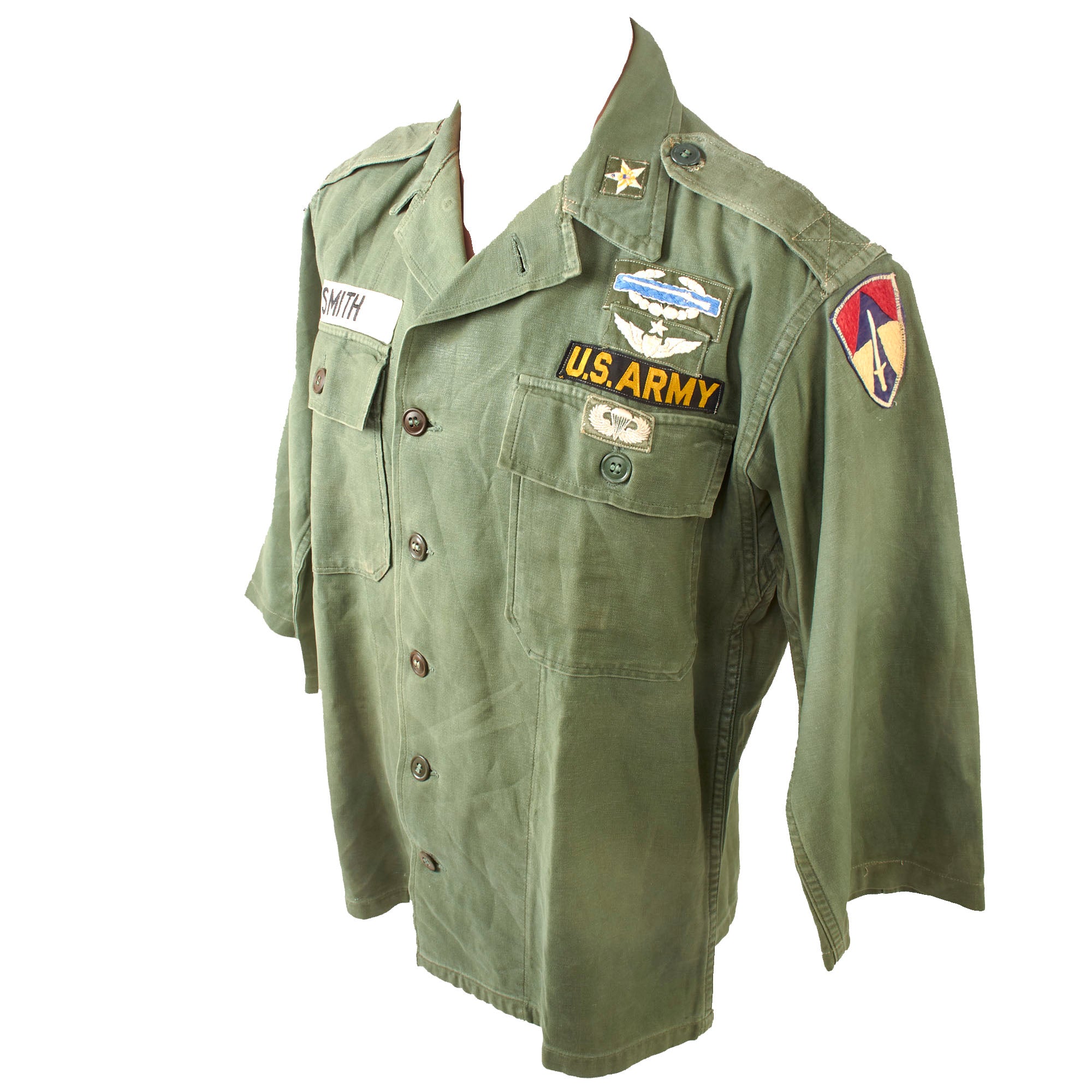 The shirt has a US Army nametape and “SMITH” last name tape, a theater-made 1st Field Force patch on the left shoulder, and a 2nd Infantry Division patch on the right shoulder. There is a Lieutenant colonel rank patch and star patch on the collar. There is a cloth CBI over a set of Master Pilot wings, and under the US Army tape is a cloth set of Paratrooper wings.