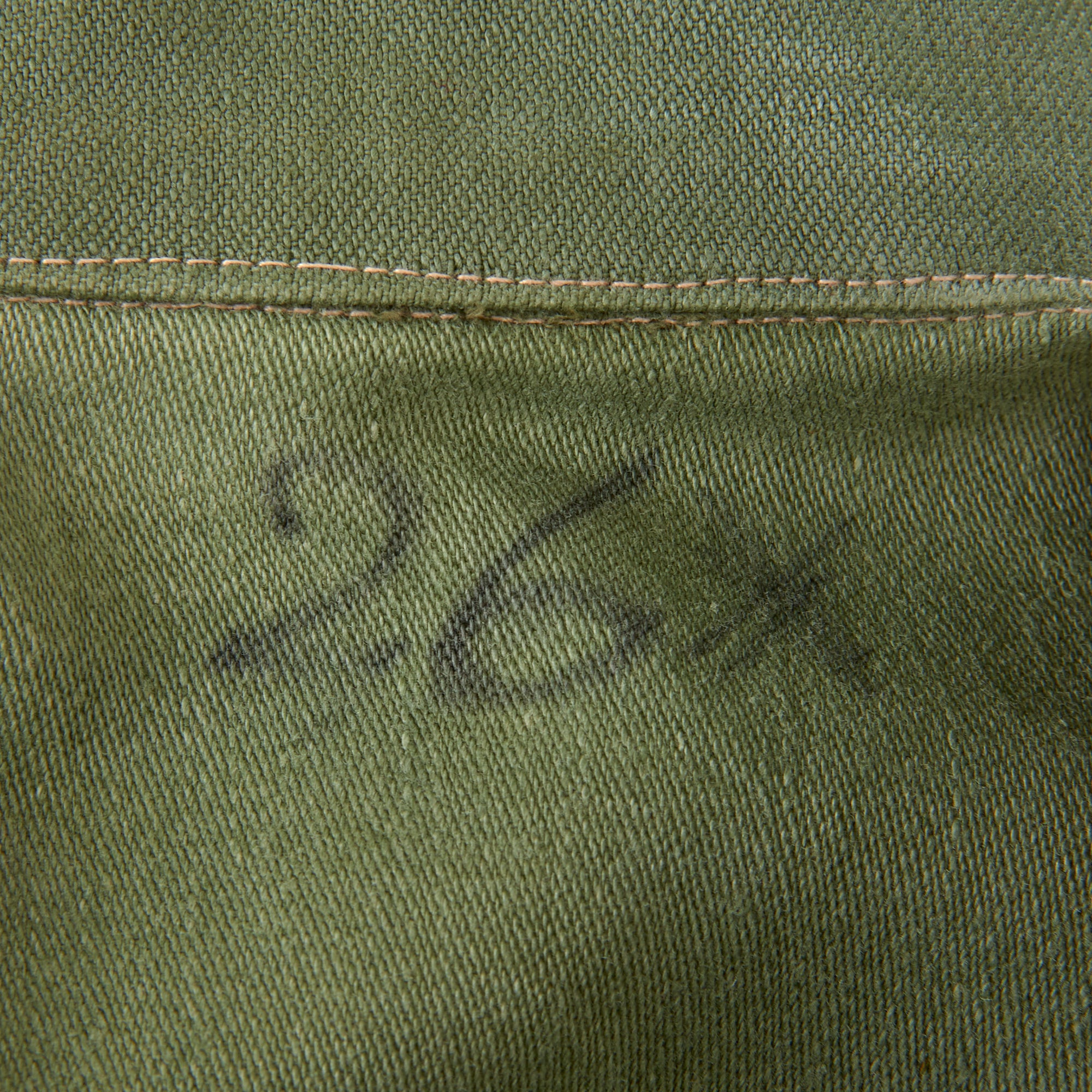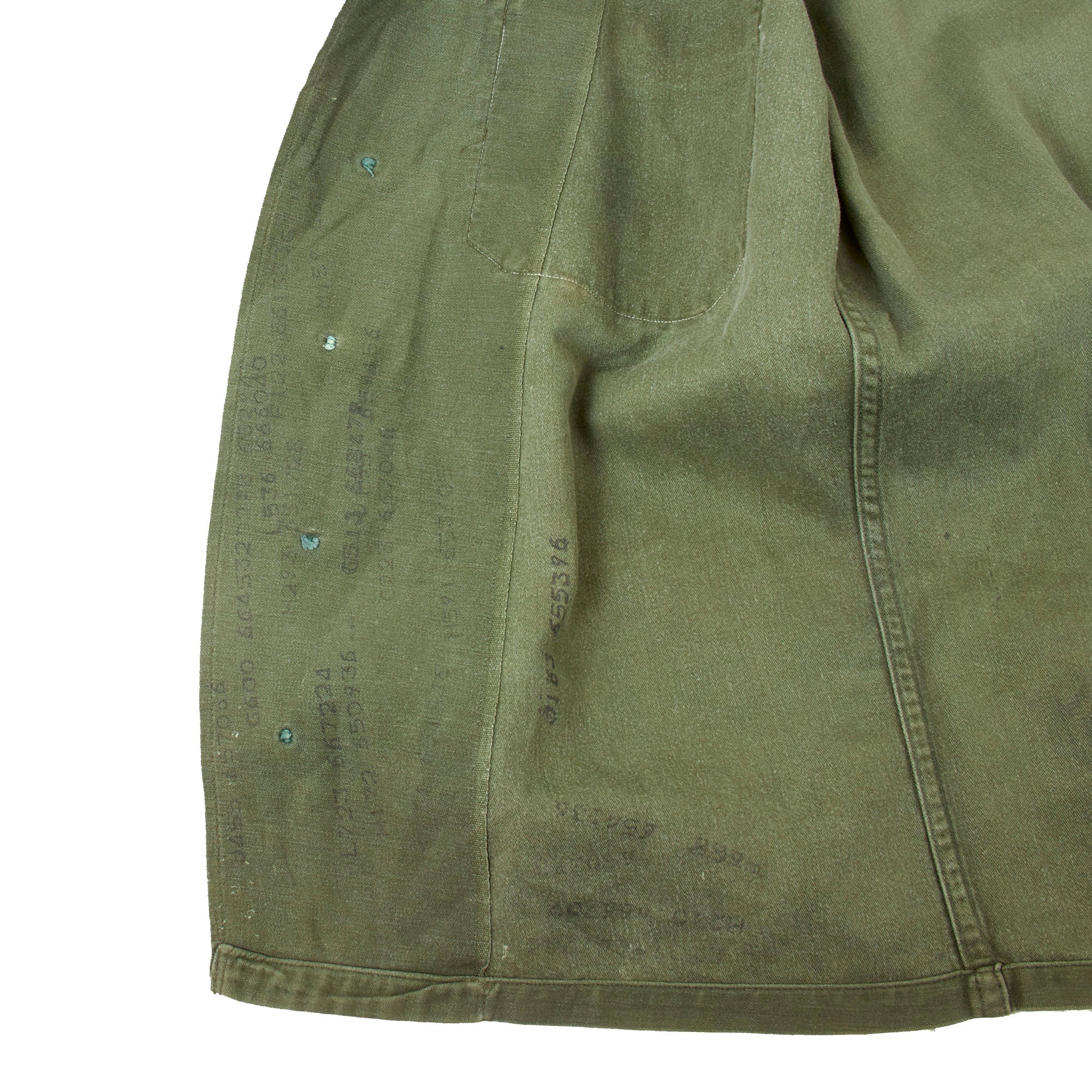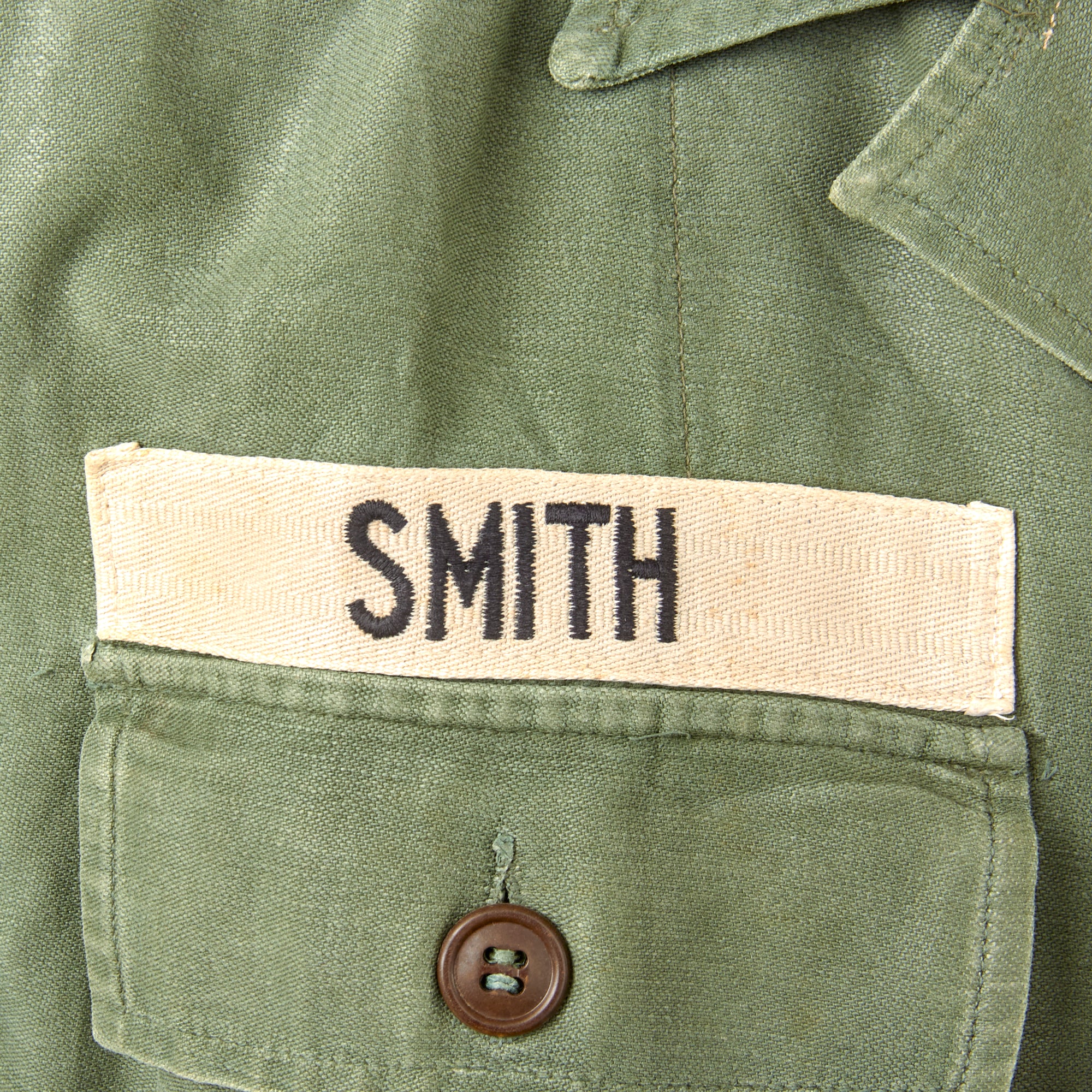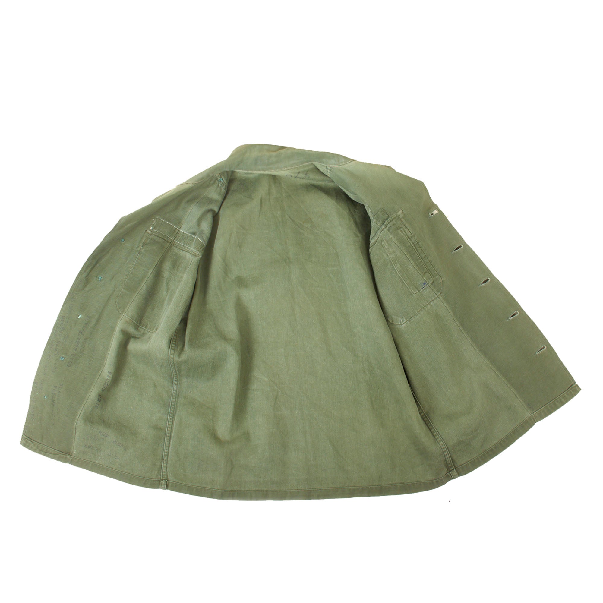 The uniform set itself is a “Type I” which was worn from 1952 to 1963. The first "Type I" model was introduced in 1952 and remained virtually unchanged through its 10-year production run. The shirt features a sleeve with no true cuff or buttons; it was simply a straight sleeve with a simple hem at the cuff. The shirt's two chest pockets and the trousers rear two pockets had a rectangular pocket flap that buttoned. The buttons were a "dished" style and most of the 1950s production were a dark brown color like this one while the majority of the 1960s production were dark green. The trousers also had a simple adjustment tab on the waist that could be buttoned. The shirt and trousers were also sized in groups (Small, Medium, Large, etc.) This model was replaced in April 1963 when specifications came out for the second model.