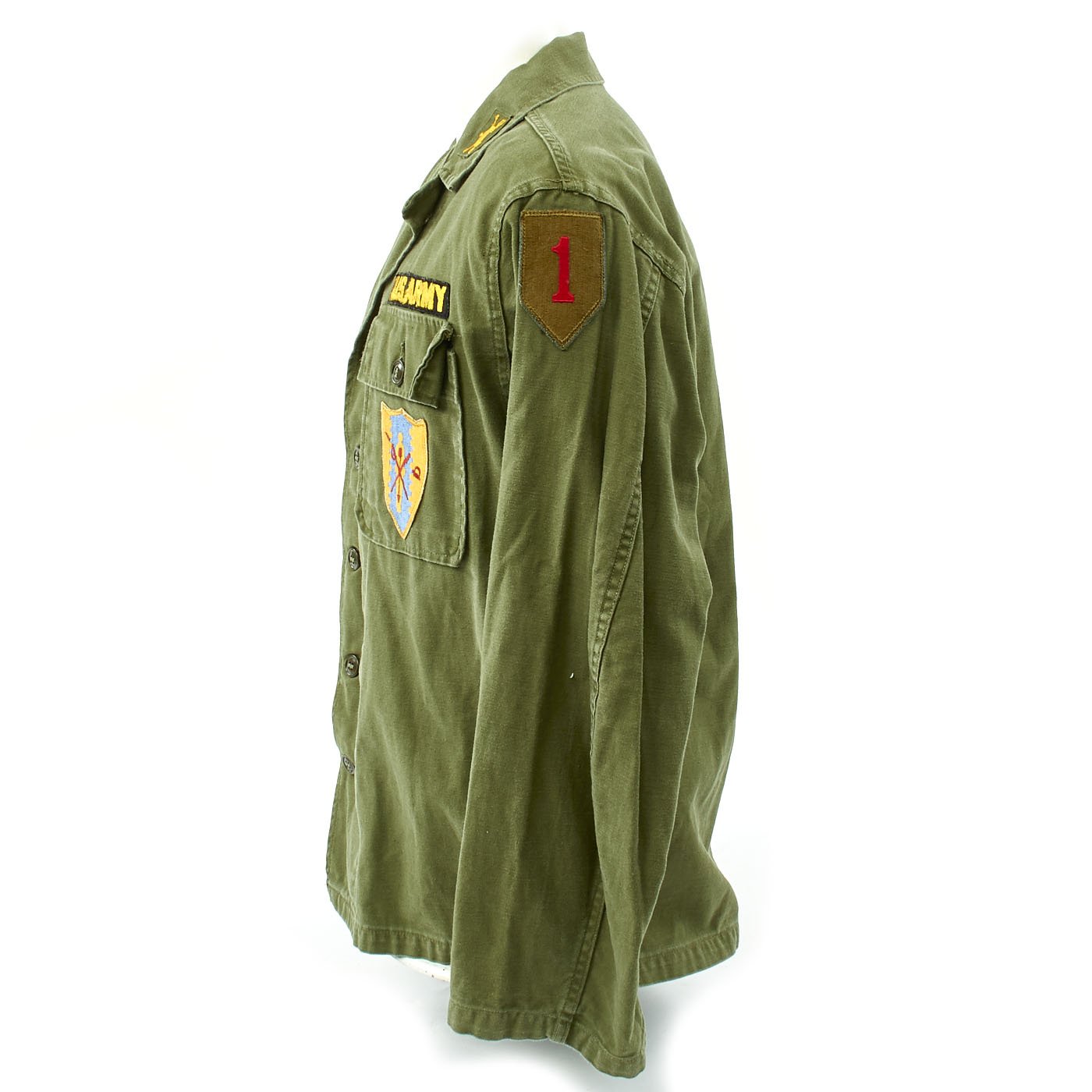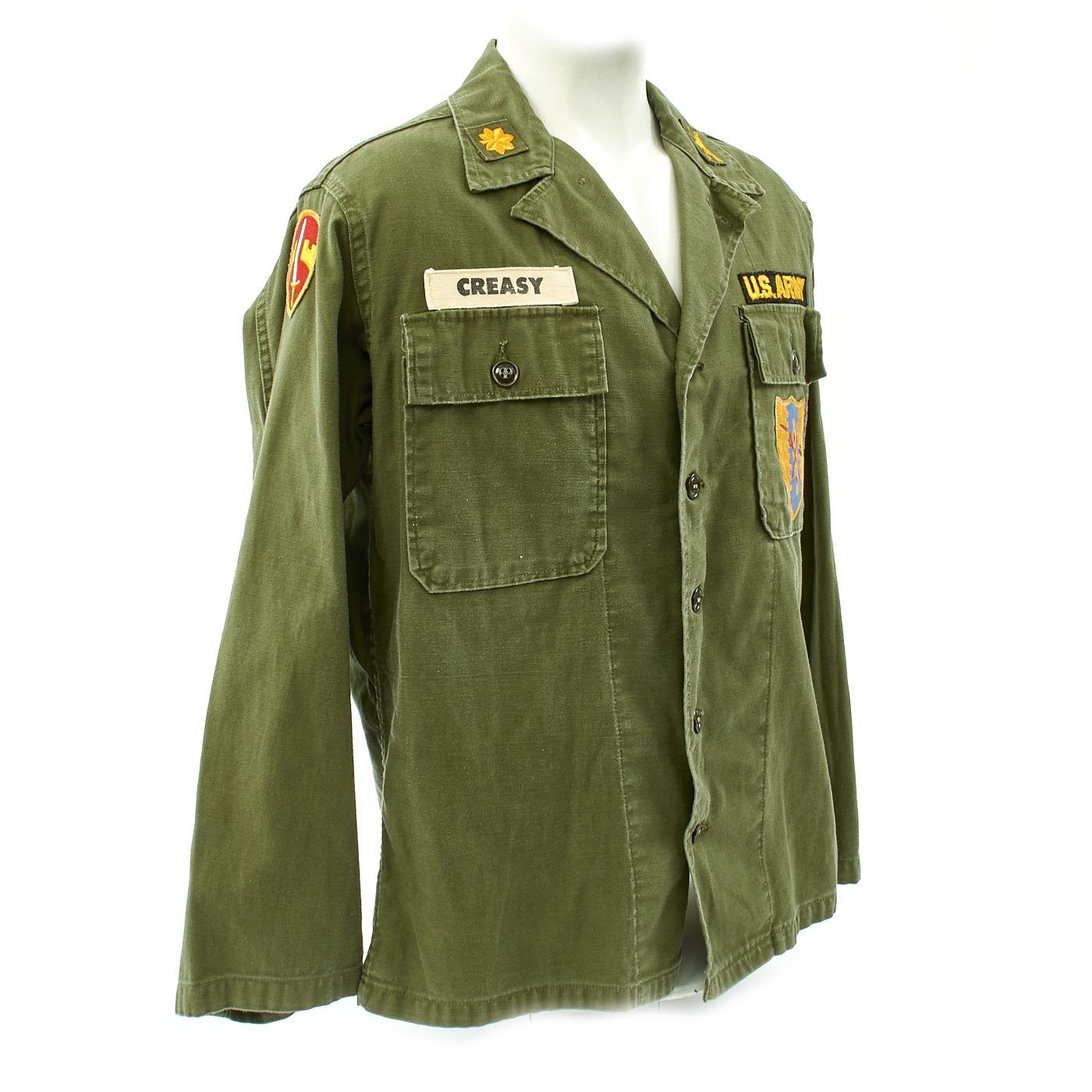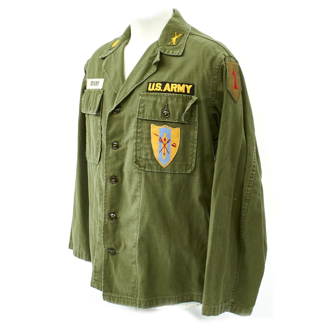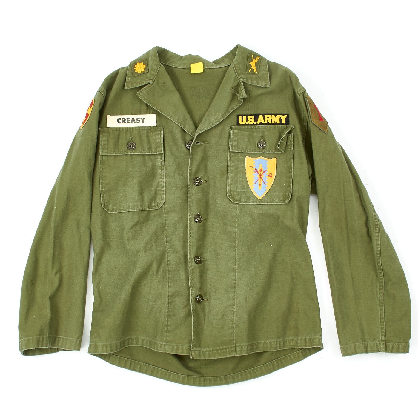 This is an excellent condition U.S. Army issue Vietnam War Era Jungle Fatigue cotton short which is named to CREASY and bear Major rank collar device as well as a 1st Infantry Division (Big Red One) patch to left shoulder and a 4th Cavalry Regiment patch to left chest.