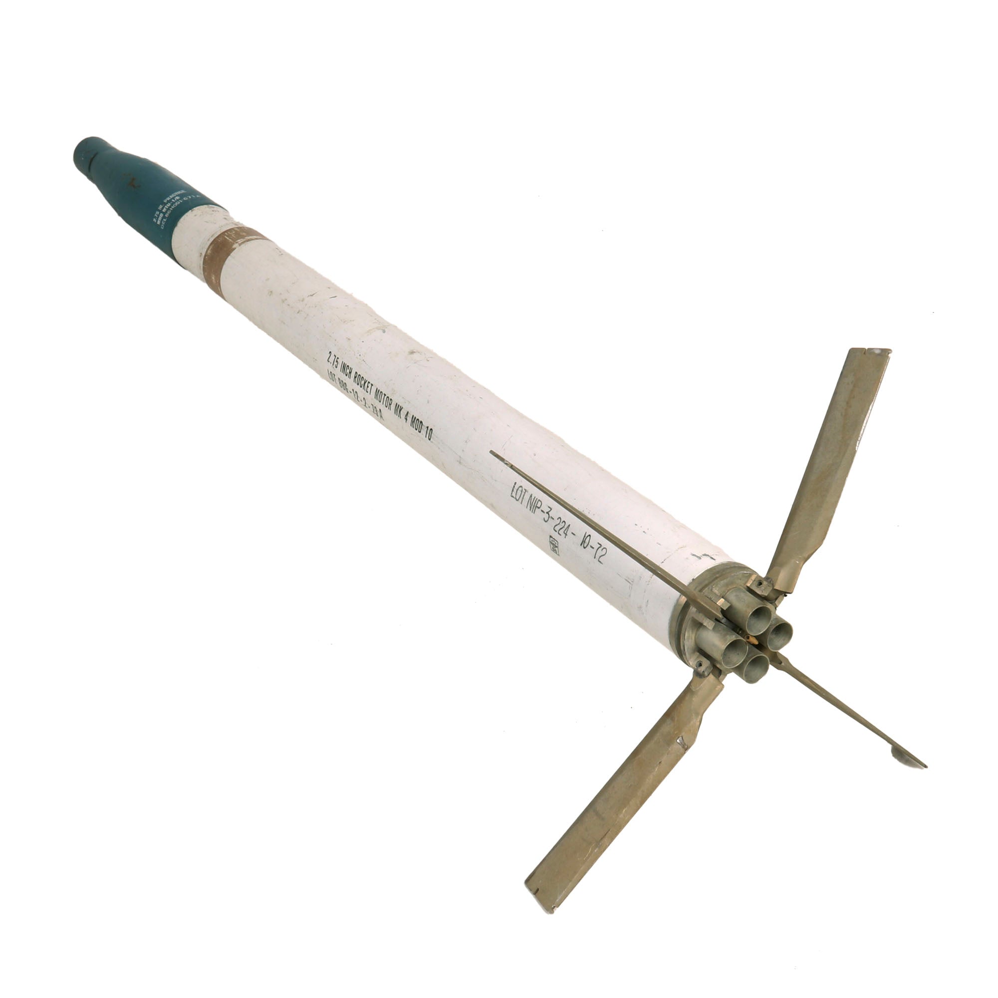 Original Item: Only One Available. Original Vietnam Era Hydra 70 Rocket with Warhead. Rocket and engine have been demilitarized for training purposes. These were fired from rocket pods attached to Huey UH-1B, and AH-1 Cobra Gunships during the Vietnam War in a surface-to-ground role. This particular Rocket is composed of an M-423 Fuze Assembly, a 2.75” High-Explosive FFAR warhead, and a Mark 66 Rocket Motor Assembly. Fuse is not marked but is noted as inert on the warhead. The MK66 Motor Assembly is still equipped with it’s original spring loaded stabilization fins. Weighs about 20 lbs and measures approximately 48" in overall length with a 2.75" diameter.