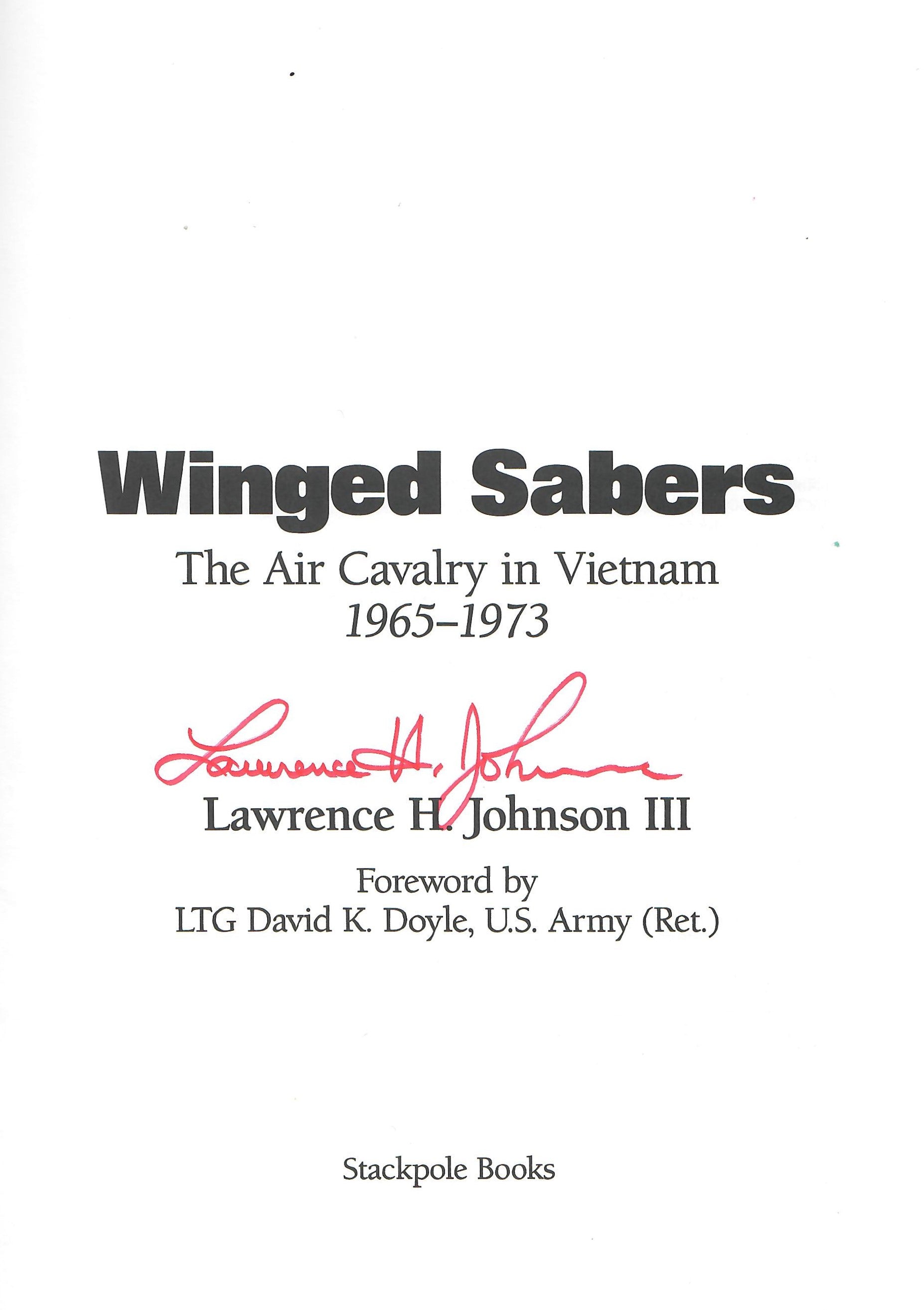 -Winged Sabers: The Air Cavalry in Vietnam by Lawrence H. Johnson III. Signed by the author with additional inscription thanking Smith for his help with the book. Smith is pictured in the book on a few pages. This is a rather comprehensive work, covering a brief history of each squadron that served in Vietnam, but also their insignia, and personal equipment the crews used. This is a rather invaluable resource for the researcher! The book has two letters from the author regarding writing the book, along with some other mementos.