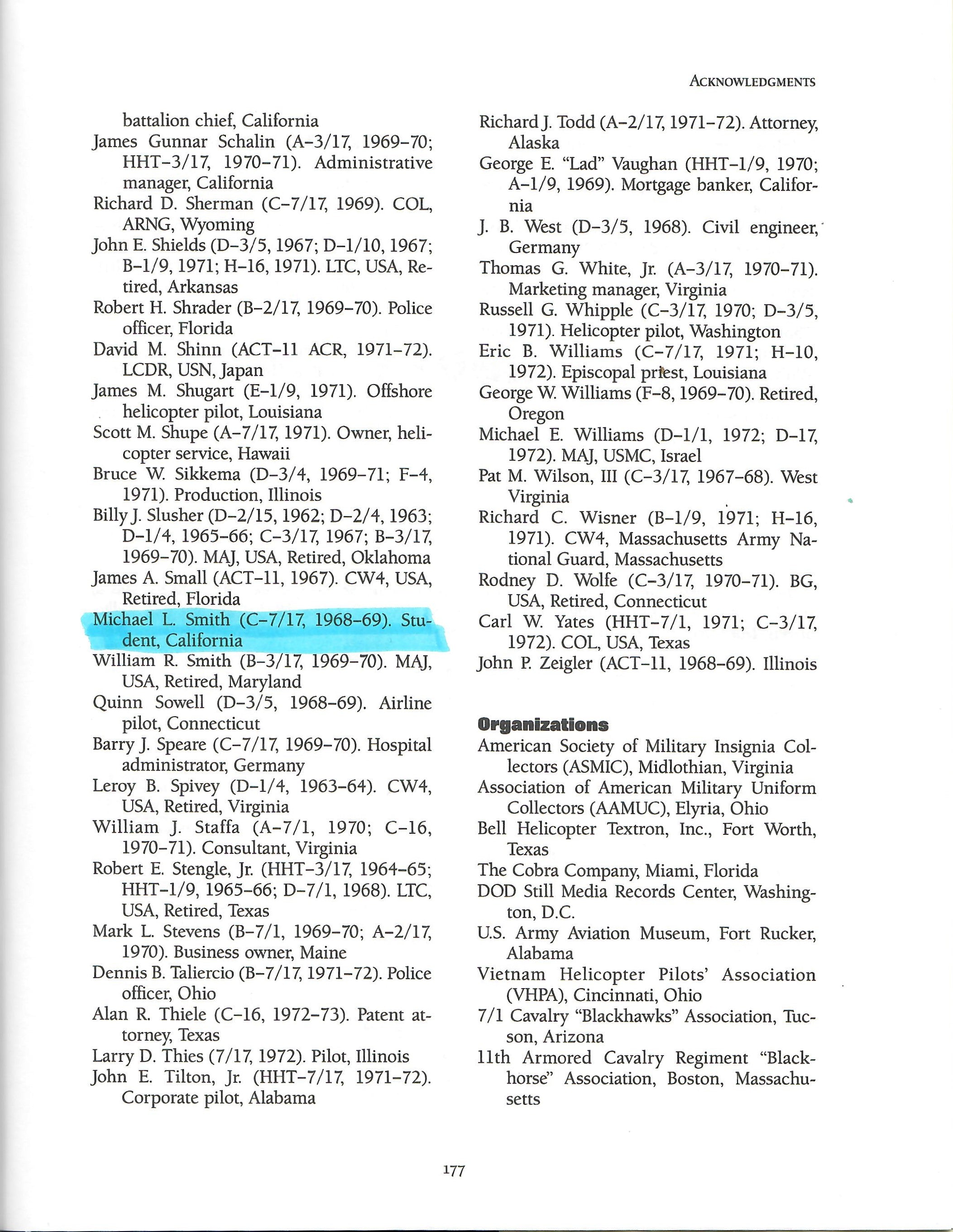 An audio clip of original transmissions between members of 1/6th Cavalry and 3/17th Cavalry engaged on a Hunter-Killer Mission in Tan Am, Vietnam 1969 is available to listen to on Youtube. Lt. Smith could very well be one of the voices heard on the recording! Be forewarned, some of the language in the recording is not for the faint of heart! https://www.youtube.com/watch?v=TMcx0AdKWY0