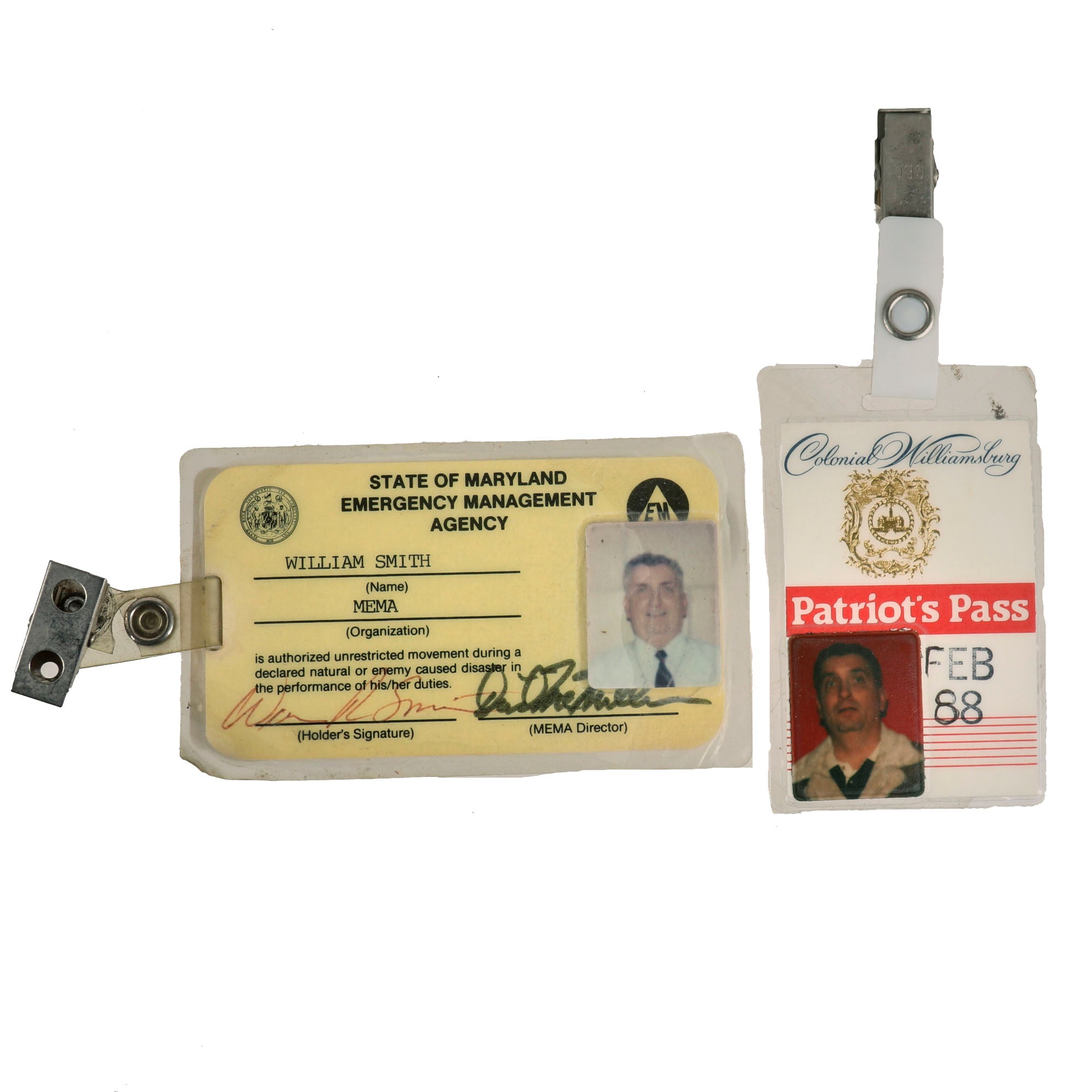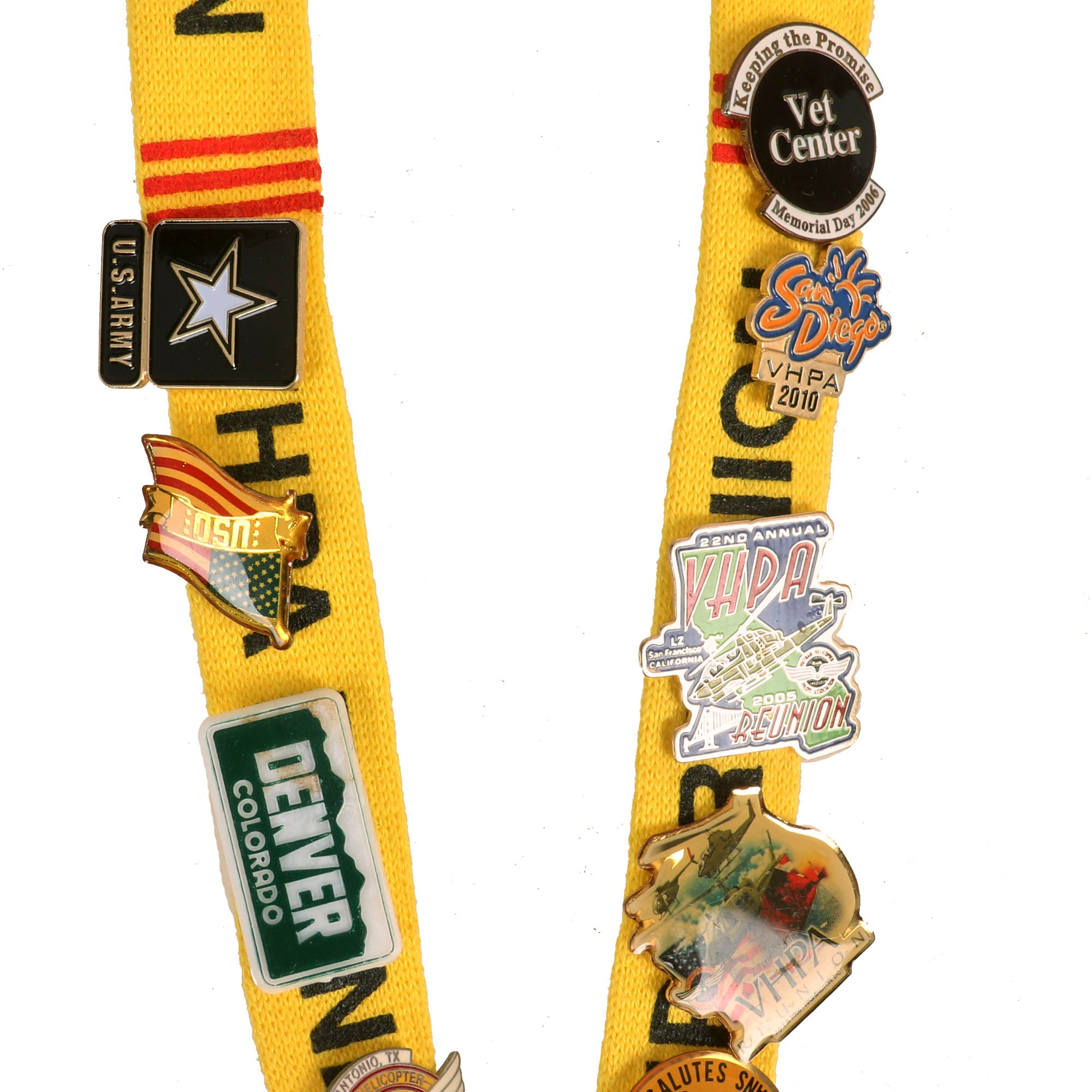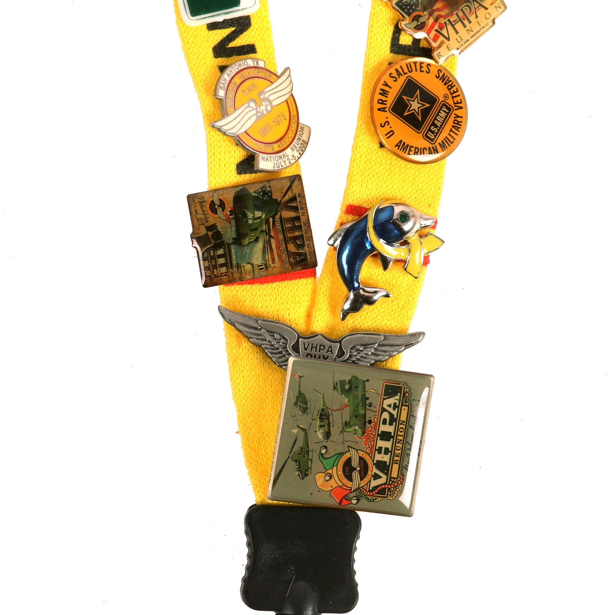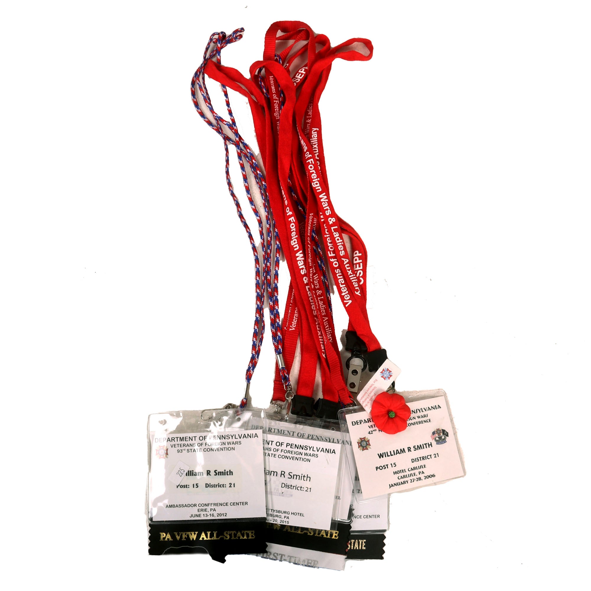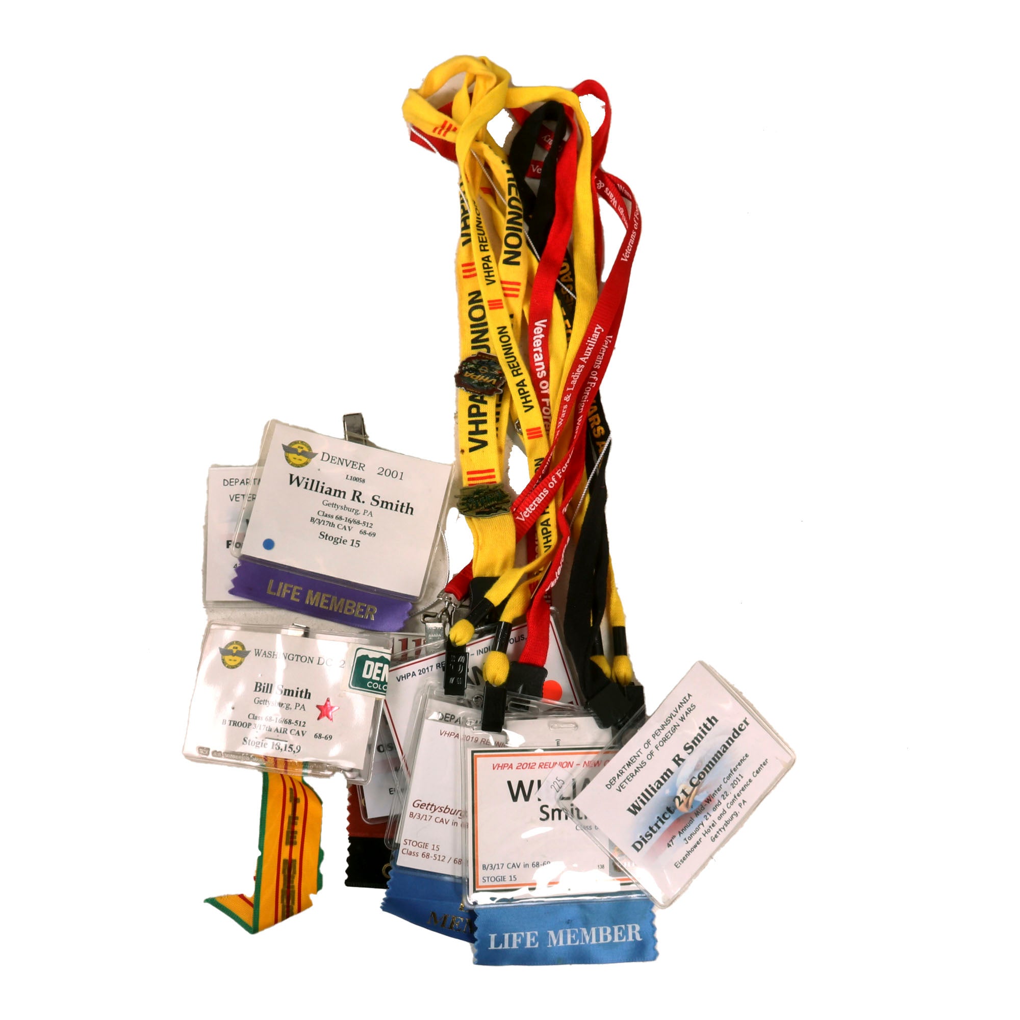 -Identity Tags and Lanyards from Veteran’s Reunions. Approximately 18 Tags on Neck Lanyards (some decorated with pins). In addition, there are also a number of tags from work-related functions, ID badges, etc.
